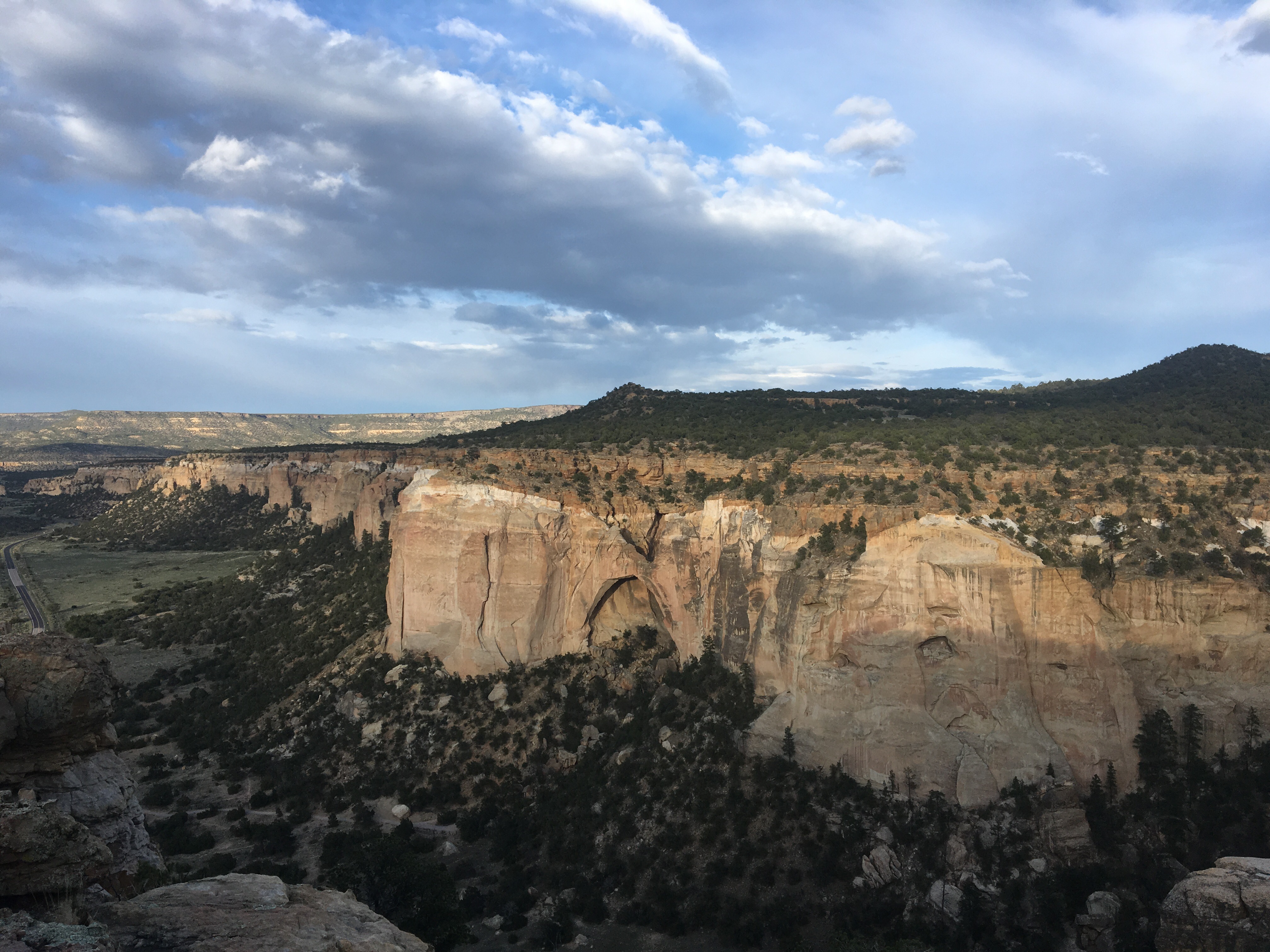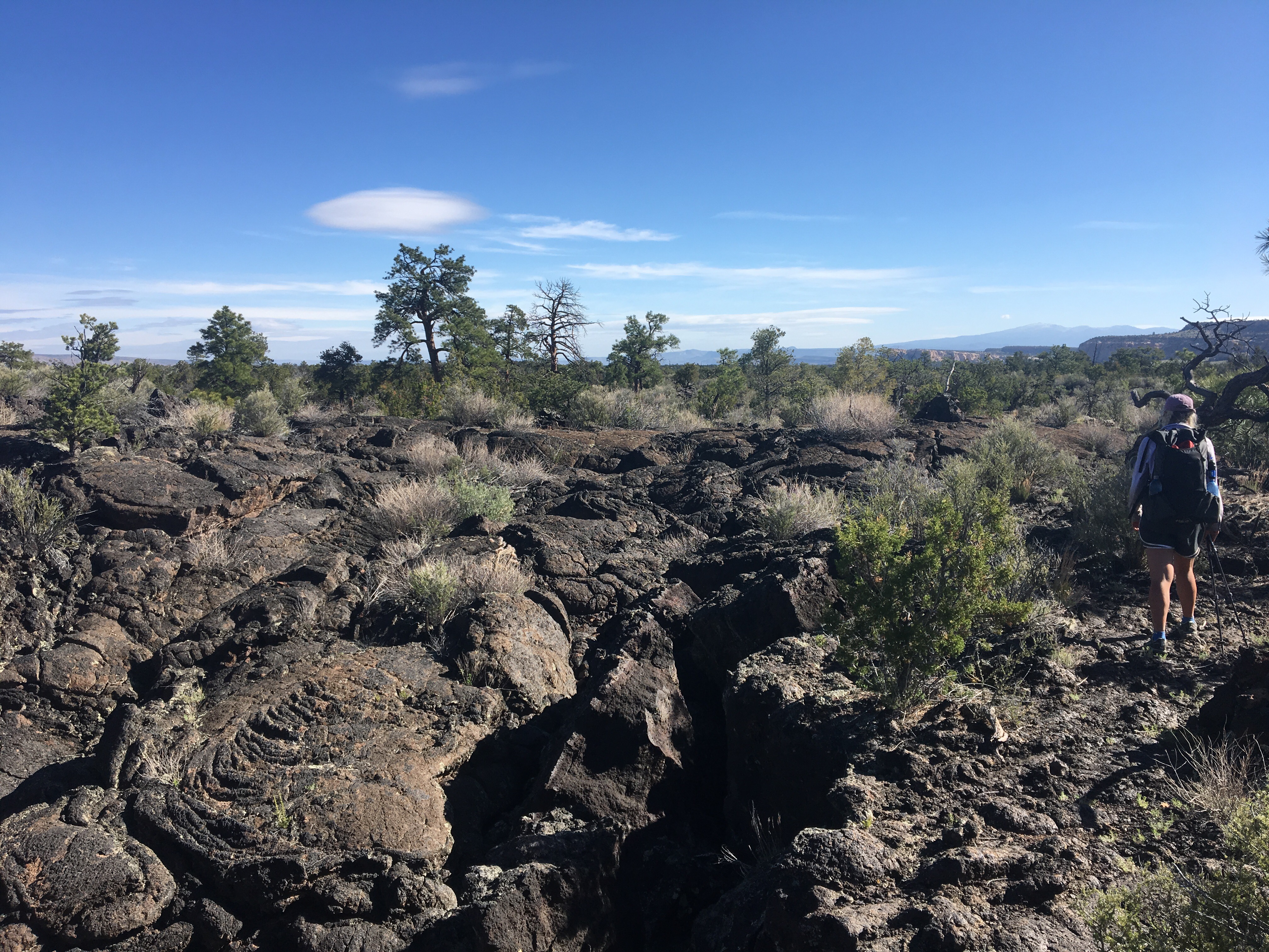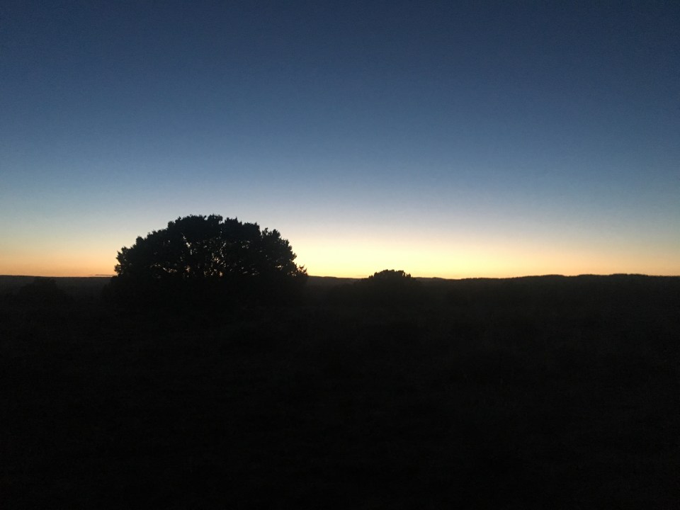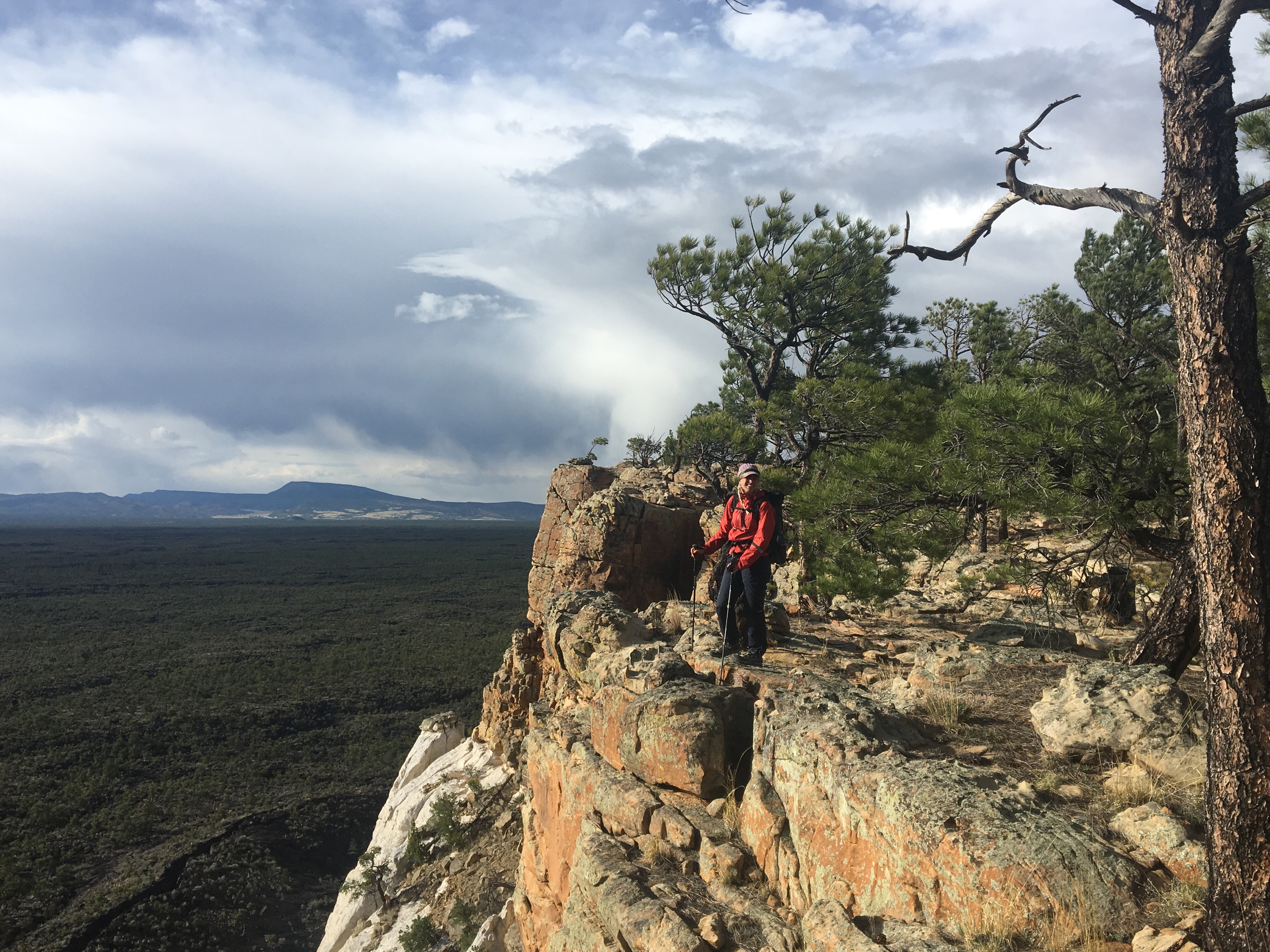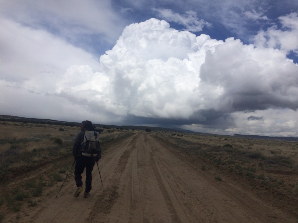 I woke to a chilly morning with a rather spectacular sunrise on the horizon and the sound of coyotes howling in the distance. The trail followed a dirt road along the open range for about 7 or 8 miles until climbing up through Armijo canyon and then back down through Sand Canyon into another huge open range. There were menacing clouds all around us but we managed to outrun (or outwalk) any type of storm. Plus Queen B is like a millimeter taller than me so I wasn’t too worried if it did start to thunder and lightning. We reached the road and out of harm’s way and there we filled up our water bottles at a cow tank. There was plenty of algae in the water and one of my bottles looked like it was full of Ecto Cooler circa 1990. After a few miles of road walking (the highway kind) we reached El Malpais National Monument and ascended up the rim trail. The rim trail was pretty awesome. Lots of great views of some massive lava fields and eventually we got to a rocky outcropping that overlooks La Ventana Arch. This is where we stopped for the night, eating our dinner at the ledge and camping a little further back in the trees. It was quite an incredible day.