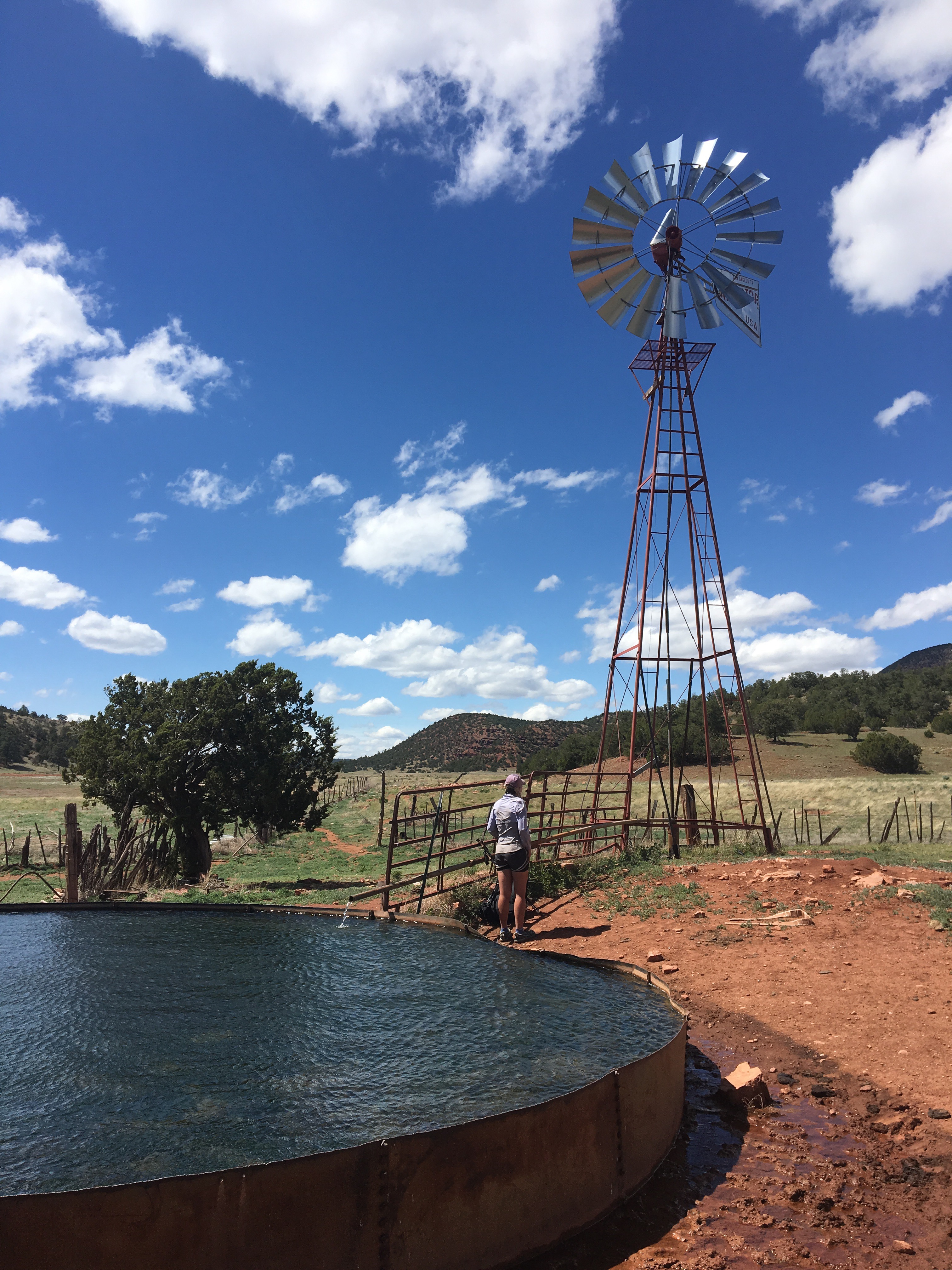 I spent most of the day yesterday and last night at the Toaster House in Pie Town. This place is a really cool old house that Nita, a local trail angel, owns and lets hikers and bikers and travelers spend the night at. It was weird that after barely seeing any hikers for a week on the trail, there was about a dozen others staying at the Toaster House. I ate twice at the Pie Cafe yesterday and this morning I stuffed my face with a delicious breakfast burrito before leaving town at the Gatherin’ Place with Queen B, Silver, Trooper and Quiksilver. Queen B and I then headed out and walked along a dirt road into the desert. Shortly after leaving town we took a right onto the Cebolla alternate to head towards the El Malpais National Monument. About 15 miles out we stopped and had lunch and refilled our water at the Thomas Ranch. John and Enzy Thomas are an older couple that let hikers come by to fill up on water and while there they entertain us with the stories of their life. Tonight we’re cowboy camping under a juniper tree right on the edge of a huge open range. Also camping here are a bunch of fellow PCT ’15 alums including Catwater, an Alaskan snowboarder, as well the Ravens, a family of 4 that thru hikes together.