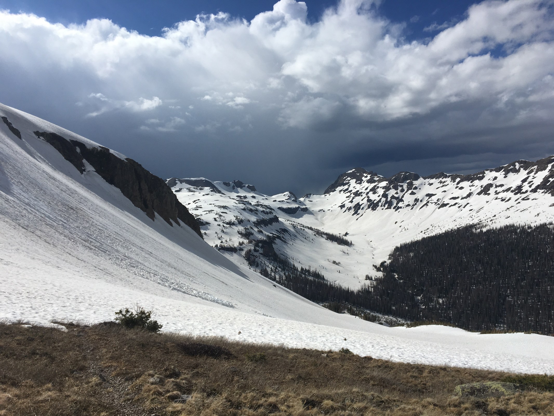 We stayed last night in Chama and this morning parted ways with Speed. He’s already hiked this section of Colorado and is heading home to Denver before he gets back on the trail later this summer. I learned more from Speed in the last couple hundred miles about the outdoors than Queen B and I will learn from each other the rest of the trail. Thanks for coming out Speed, see you in Denver. After eating the most delicious breakfast burrito of my life from the Boxcar restaurant in Chama, Queen B and I got a ride from Cecil back up to the trail-the first car that drove by. Shortly after we got back on trail we realized; it’s on now. The San Juans are no joke. We quickly climbed up to a ridge and walked through lots and lots of snow. All around us on the ridge were threatening thunderheads but luckily we made it through unscathed. Today we got up over 12,000 feet and that’s already higher than any part of the trail in New Mexico. I wore my microspikes for most of the day and for the first time I broke out my ice ax and carried it in my hand. Before today I had my snowshoes and ice ax strapped to my back but finally ended up using all my weapons. For the most part the snow was crispy and we could stay on top of it but in the afternoon it turned into a mashed potato consistency and I was postholing every other step, for this I wore my snowshoes. We dropped down between two ridges and found a rather stellar campsite near a frozen snow covered lake. There were hardly any patches of earth showing anywhere but we ended finding a really nice cozy flat section of ground to sleep for the night. Hoping to stay relatively warm.