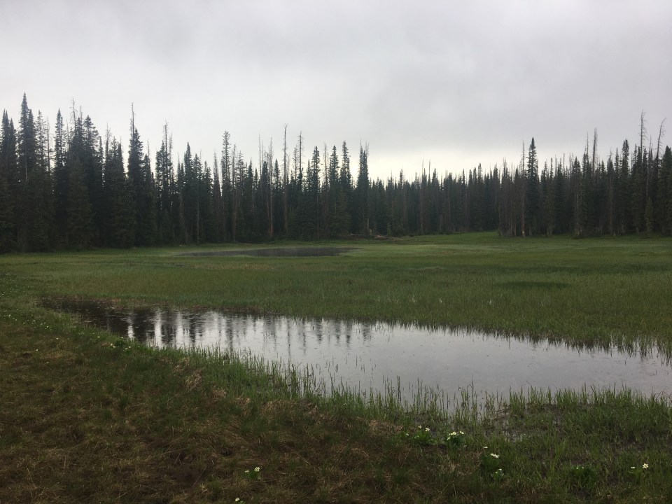 No hurry getting out of bed today so that was nice. Eventually we made our way down the street to McDonald’s for breakfast and I have to say that stuff is underrated. I know it’s hard to screw up breakfast and McDonald’s is no exception. We saw Roswell there and hung out with him for about an hour. I first met Roswell in Lordsburg and he’s been popping up every once in awhile since then. He was modeling a new pair of shorts he just picked up at the Wal-Mart next door and since my shorts were on life support I decided I too should upgrade my wardrobe. So I did. I also needed to get some more sunscreen because this pair was considerably shorter than my old pair and exposed my fish belly thighs. From Wally World we walked over to the highway and started hitching in order to return to the trail. I figured with my new shorts I would immediately hear a bunch of cars screeching to a stop but this wasn’t exactly the case. After about 20 minutes Karen Sue pulled over and gave me and QB a ride all the way back to where we left off the other day. She was totally cool and went way out of her way to bring us back. Once on trail we pretty much crushed it the rest of the day. It was almost 1pm when we returned but we still managed to hike 20 miles. The trail was relatively flat and relaxing and cut through forest for most of the afternoon and evening. At one point we rounded a corner and saw 3 big old moose looking back at us and shortly after that saw another moose way out in the middle of a lake. There is so many moose in Colorado. This evening we crossed into the Zirkel wilderness and found a place to camp right as it began raining.