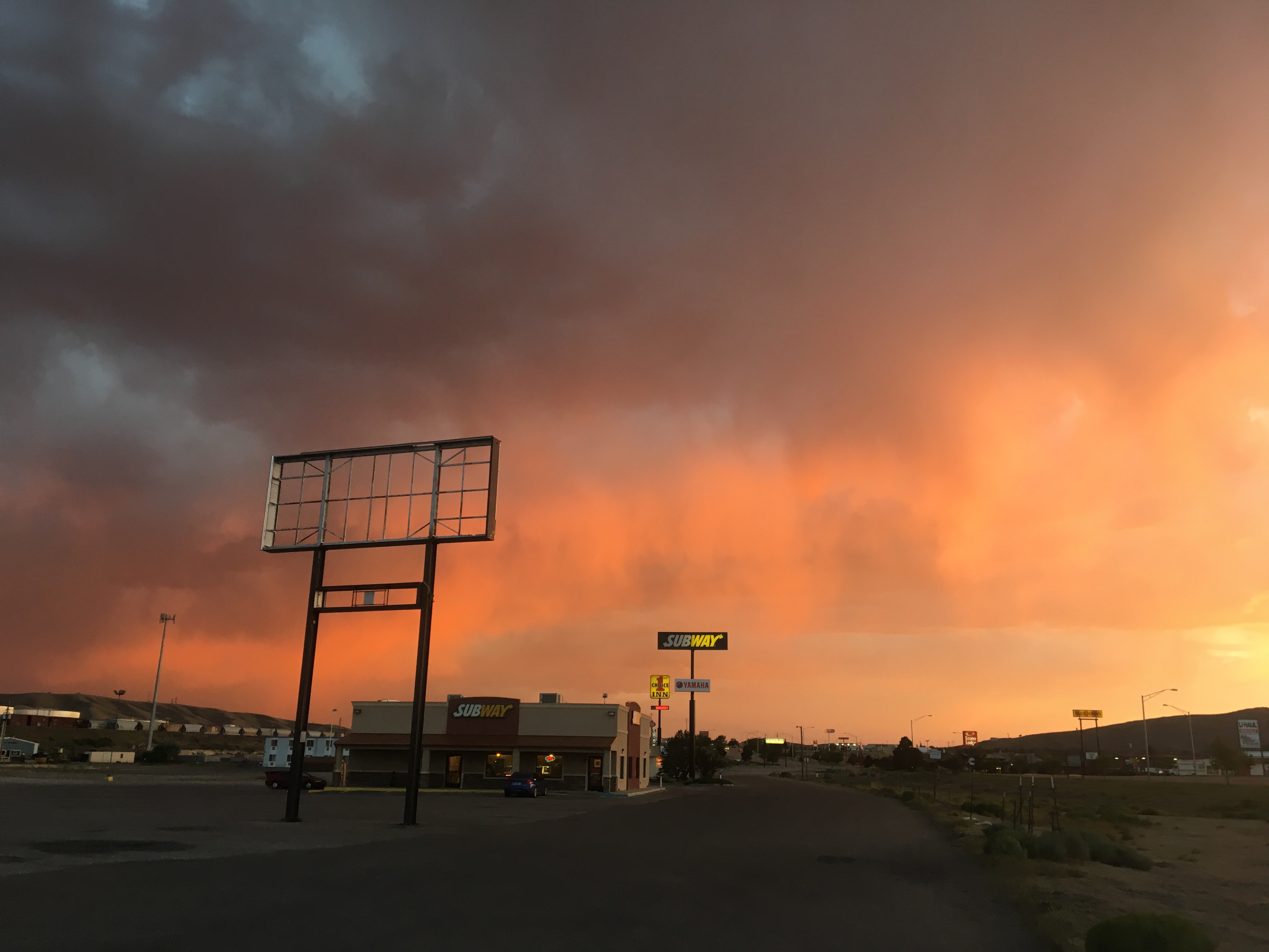 The wind was ferocious last night. I watched the stars for awhile and saw a handful of shooters but after awhile the wind made cowboy camping an impossibility. Sleeping in a tent wasn’t much better and it not until about 2:30 the wind died down and I could finally crash out for a few hours. In the desert sun, it’s imperative to walk during the early morning so I couldn’t even sleep in. There was about 26 miles of road between me and Rawlins this morning and I was tired, hot, and thirsty. Luckily about half a dozen cars stopped to give us water, and since there were very few cars on the road the percentage of cars that stopped was very high. I’m impressed with Wyoming and how nice the people are. Early on today I saw a dead rattlesnake on the road, not a good sign. Then later on I heard that the city of Rawlins is having a problem with rattlers and we even met a couple that was going out to hunt them, vigilante style. Queen B and I finally got into Rawlins after this long non stop road walk and each ate a whole pizza before napping out for an hour or so and then going out for Chinese food. On our walk from dinner to McDonald’s for ice cream we saw the most amazing sunset. For some reason it looked eerily apocalyptic. I thought there would definitely be a tornado or something. Rawlins is right on I-80 and is the epitome of an interstate town. I found that it felt very similar to Grants, NM. It’s not exactly charming and although it’s spread out it has everything that a hiker needs. I like the town and I definitely needed a comfortable place to sleep after last night’s winds. This view for miles and miles and mileslots of people stopped to give us water and the rattlesnake vigilantes even gave us bananasthe end of the world sunset