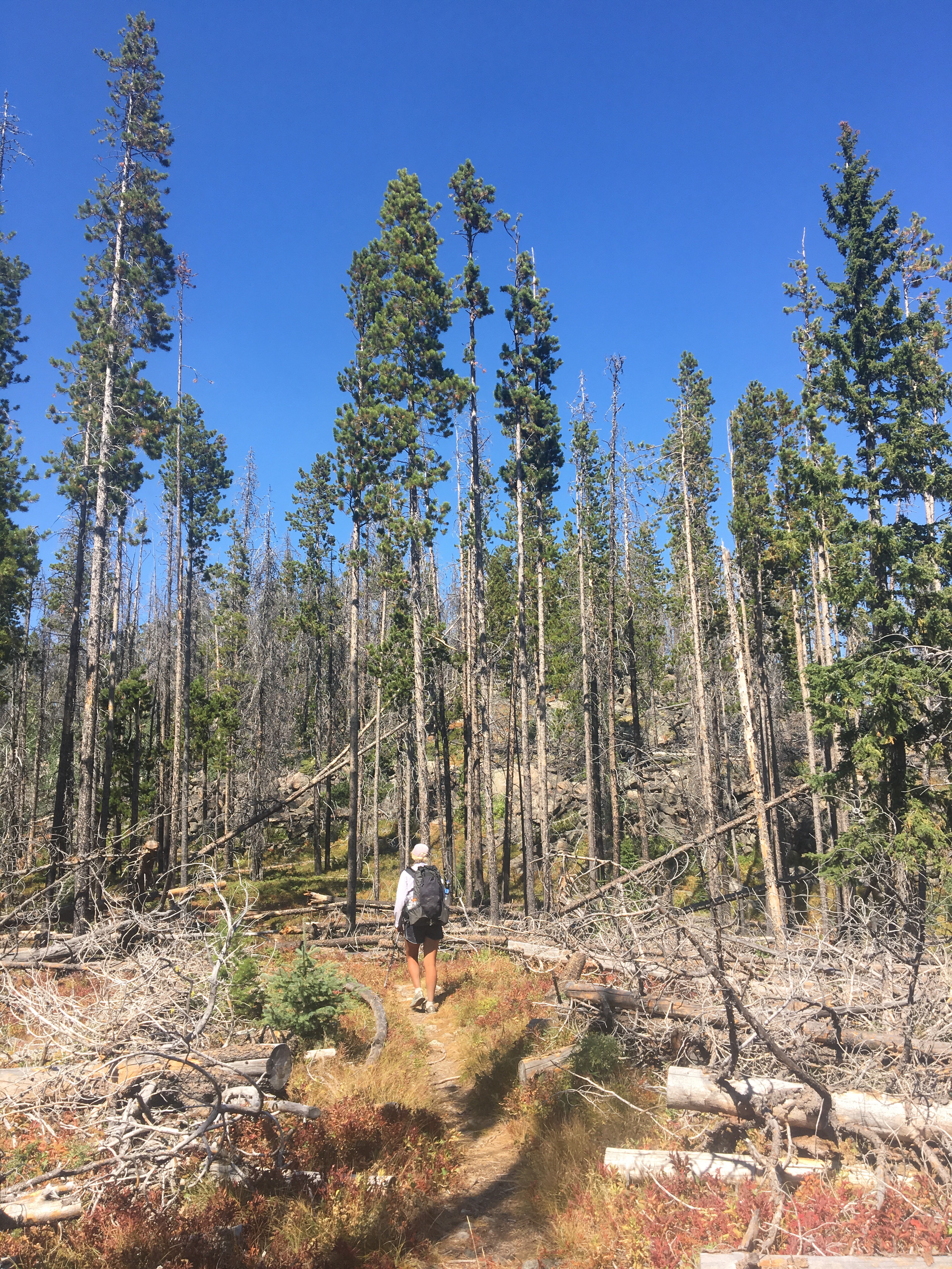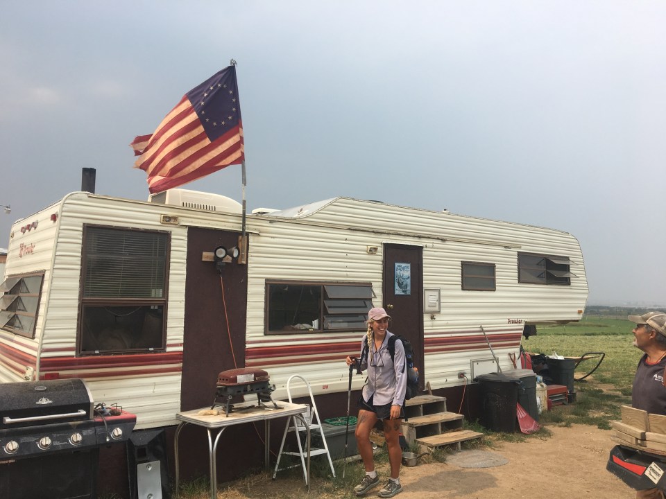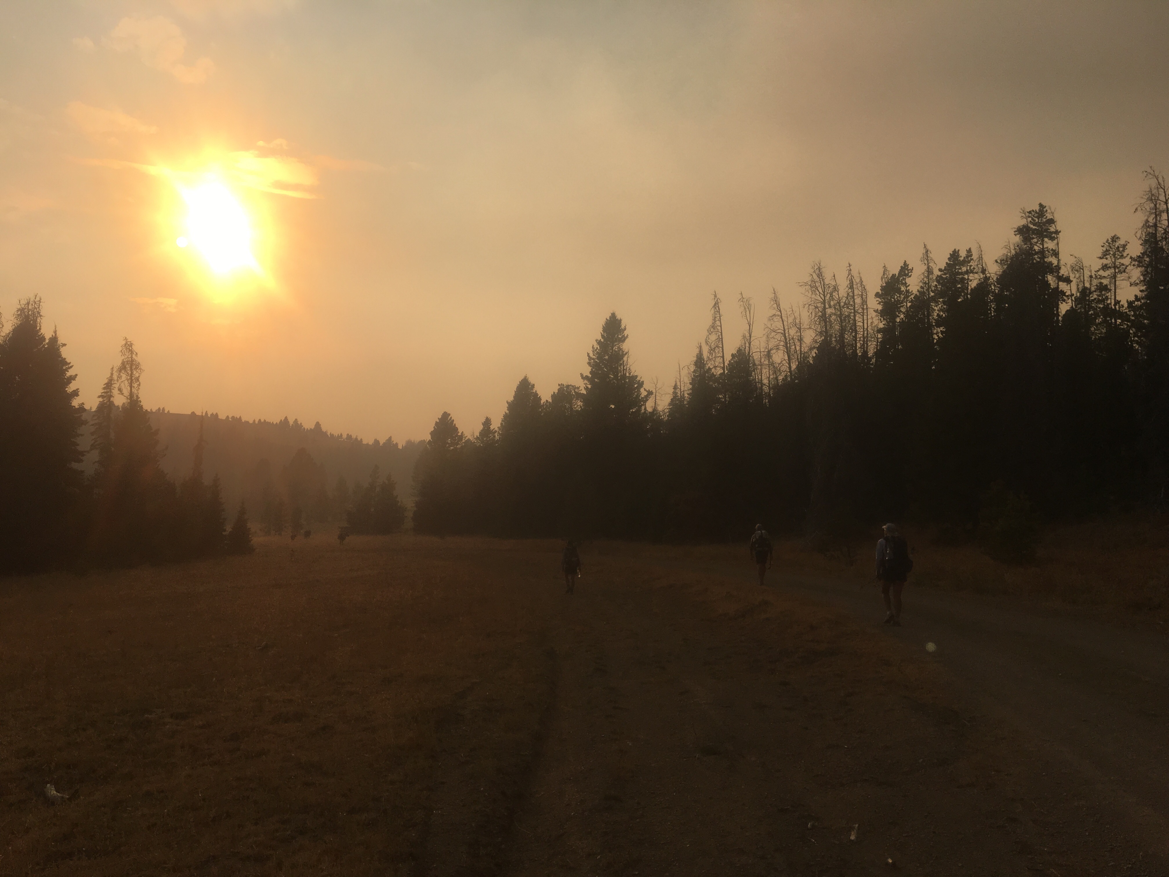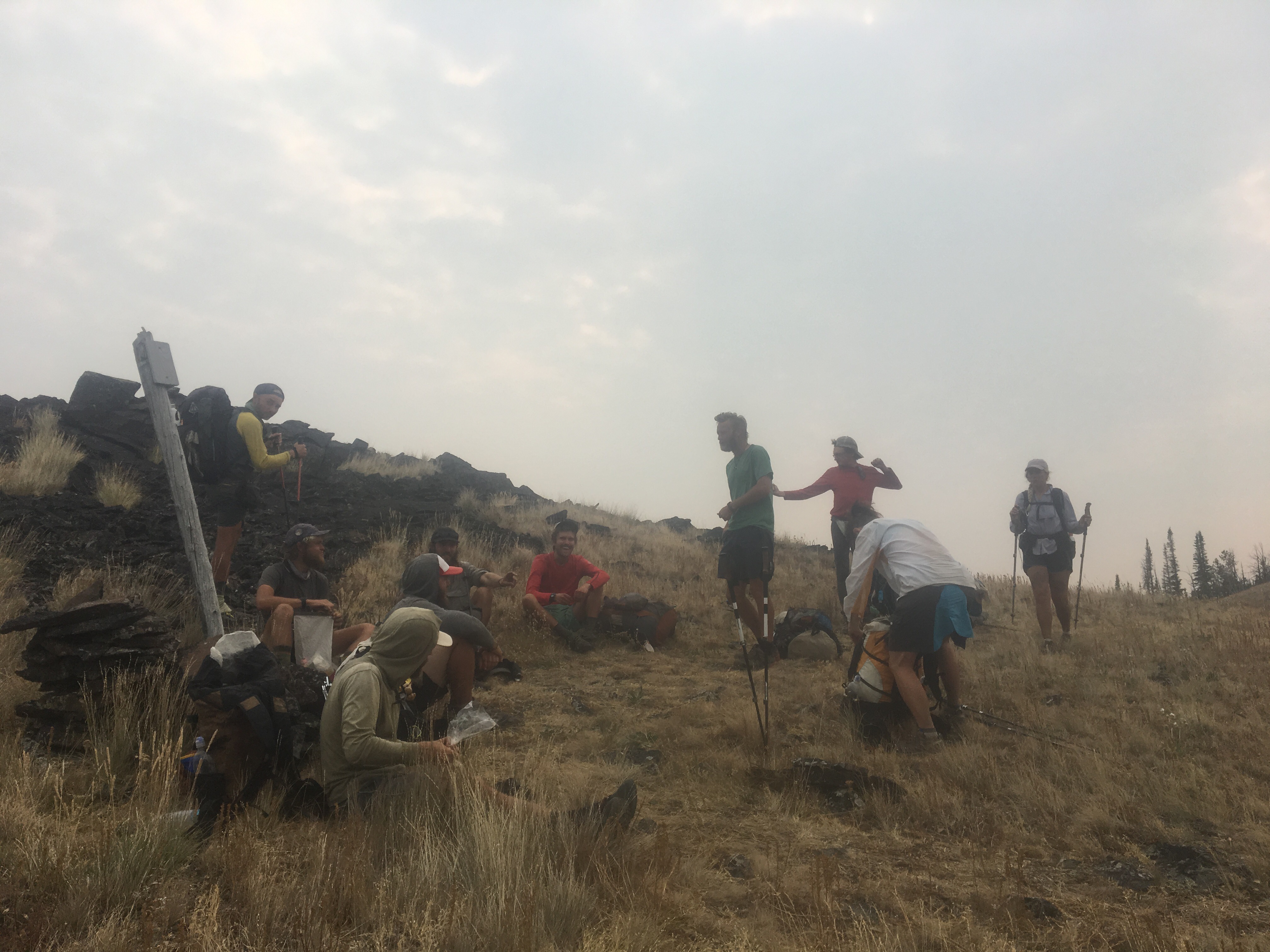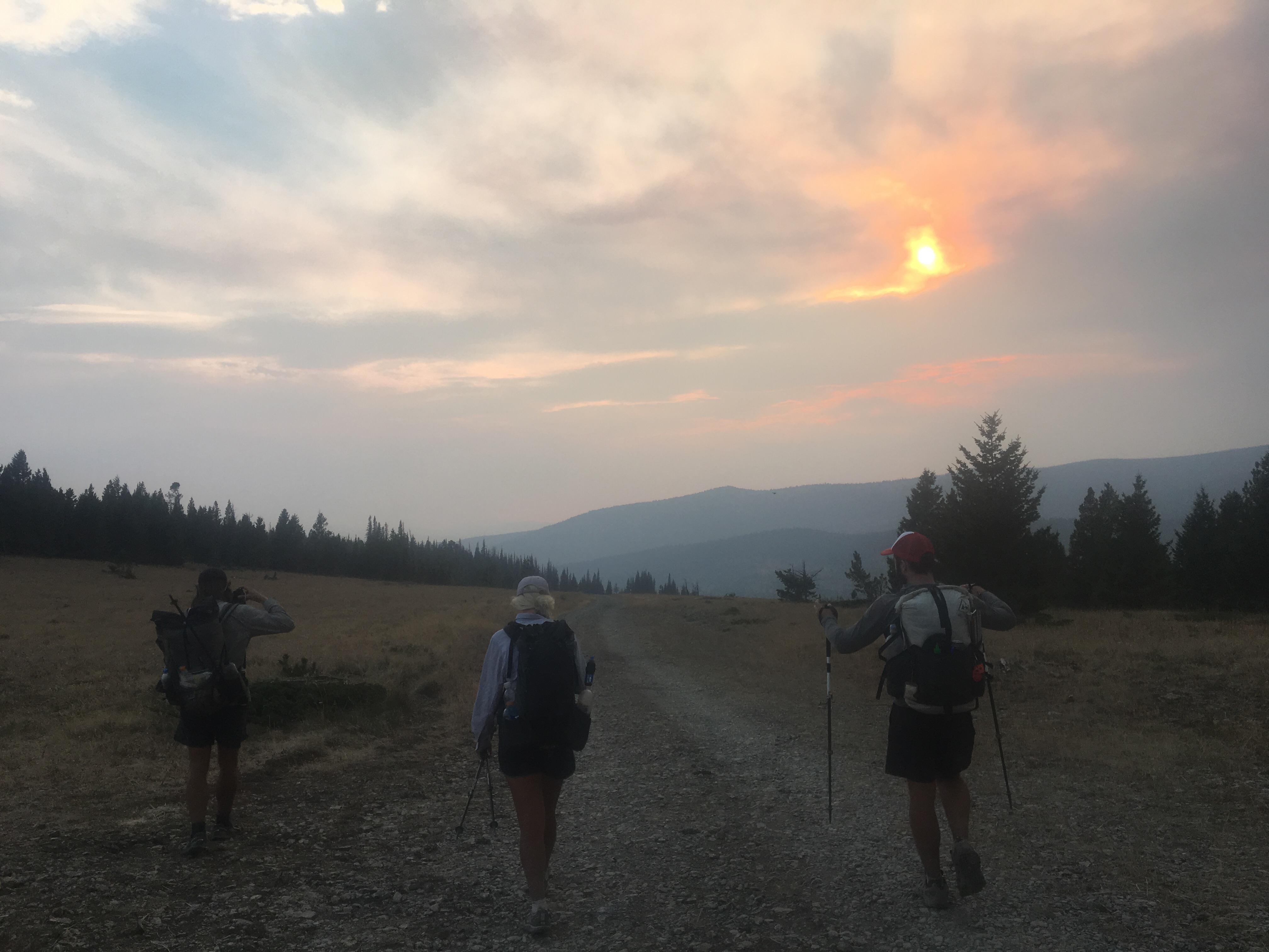 This morning we got breakfast down the street and looked over the upcoming section that includes a potential fire closure and reroute situation up ahead. After breakfast we went back to the hotel and noticed some of the other hikers had fresh haircuts. These guys bought clippers in town so we borrowed them and I gave QB a haircut. Not really, I just shaved the lower half of her head, I guess that’s all the rage these days. We then started back to the trail and got two relatively quick hitches back up to MacDonald Pass around 11. Back on trail we met up with Mac, Appa, and JPEG and hiked with those guys for most of the day. At some point we were in Ted Kaczynski’s old neighborhood(the Unabomber). The FBI seized his whole cabin though so there was no sign of the weirdo. This section is pretty dry and very smoky due to the wildfire up ahead. We took an alternate to the west of the trail that had a better water situation. Once back on the official trail we made it to a water source and shortly after that found a place in the pines to camp.