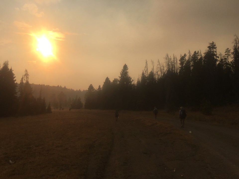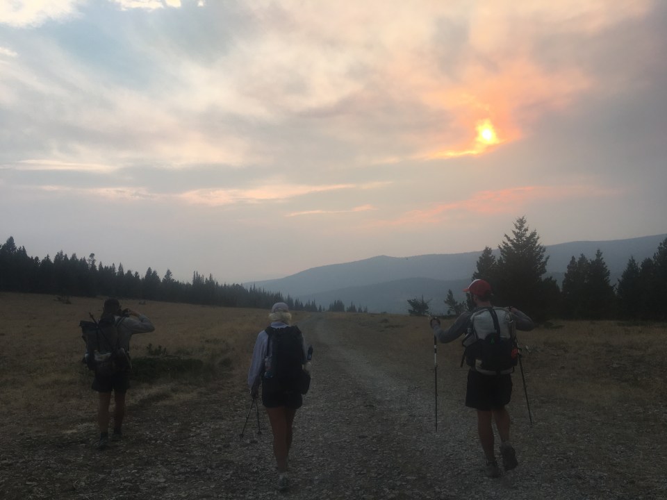 Holy smokes!! It’s been a super smoky morning as we walked down from Flesher Pass and even smokier here in Lincoln. We started walking down a trail that Queen B invented, following power lines steeply down to a road after a mile or two. Once we got to the road we walked along it for about 6 miles, took a left and walked another 6 miles to the point where the reroute cuts north. At this point we hitched into Lincoln and we’ll start back here tomorrow morning. We’ve got a big section coming up going through the Bob Marshal Wilderness so we’ll take care of a few chores in town this afternoon and hit the trail hard tomorrow.