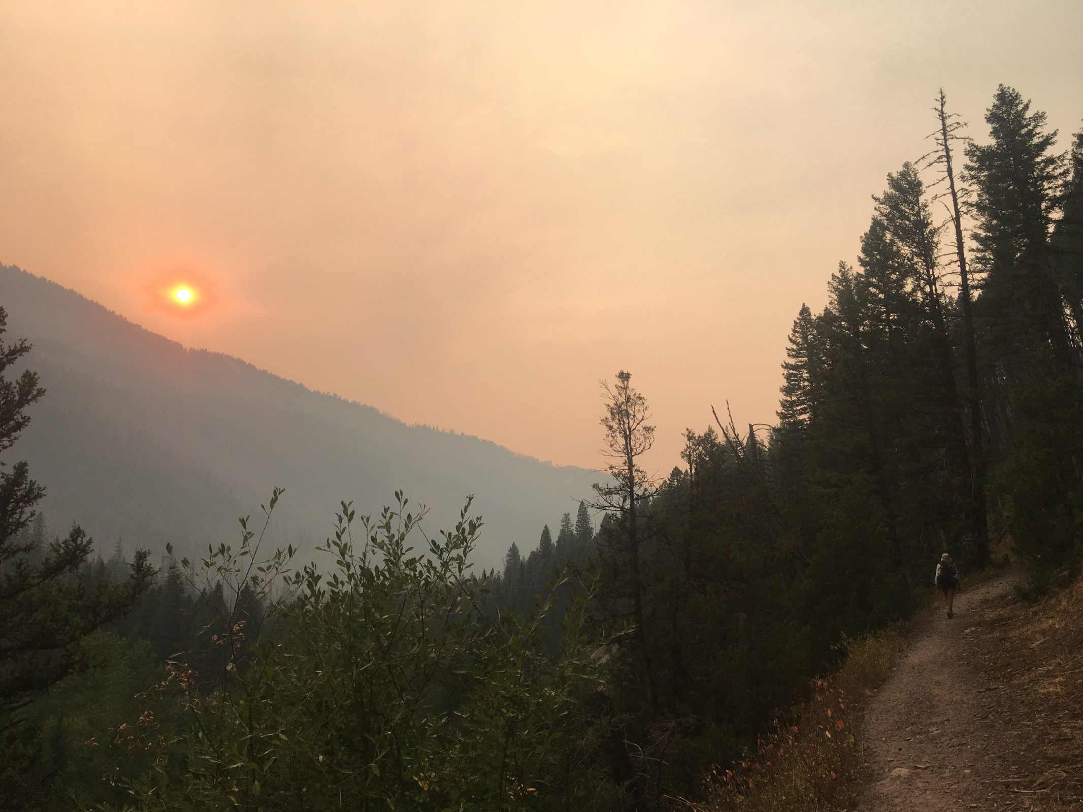 Today was quite the day. First of all this morning we were all sitting around eating breakfast and Queen B saw something in the woods not too far from us that she thought was a small grizzly. I looked over and I saw something too, just real quickly that I thought was a big cat because of the way it moved (this is based on nothing though since I’ve never seen a big cat). We started hiking south at a relaxed pace because there was really no hurry to go back to Benchmark. We passed the Spotted Bear alternate and there was a map posted with a rat’s nest of closed trails but nothing about a reroute through the fires so we continued South back towards Benchmark. About a mile and a half later we ran into Griggs who was hiking north with a map, a plan, and some good info about a reroute from the forest service. This was some unexpected and really good news. Since nobody had service he air dropped us all pictures of the maps and the details of the ‘Schaefer Reroute.’ I turned around along with QB, JPEG, Mac and Appa and we all went north back up to the Spotted Bear trail and 10 miles down that way. At Pentagon Creek we talked to a forest service worker, who confirmed our route was safe from the fires, and we took a left heading west from there. We walked about 10 more miles to the base of Gunsight Peak and decided to put as much distance between us and the fires as we could. From there we night hiked for a couple hours to a saddle near the peak. It was a hot night and a steep climb. Once we got up top it was super windy and smoky and we were walking through an old burn with an almost full blood moon. I felt like I was on another planet. I’m glad I wasn’t camping alone because it was definitely spooky up there.