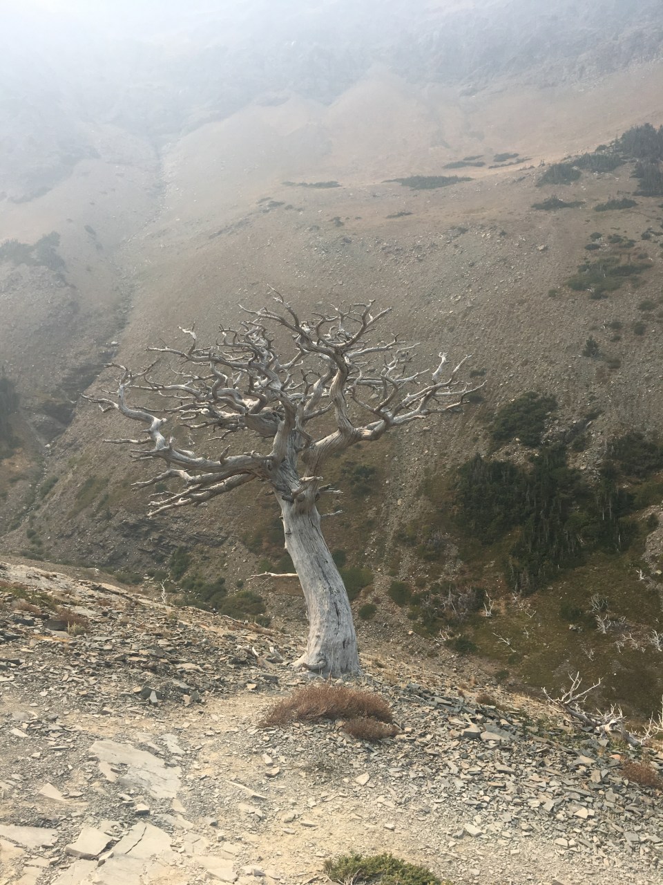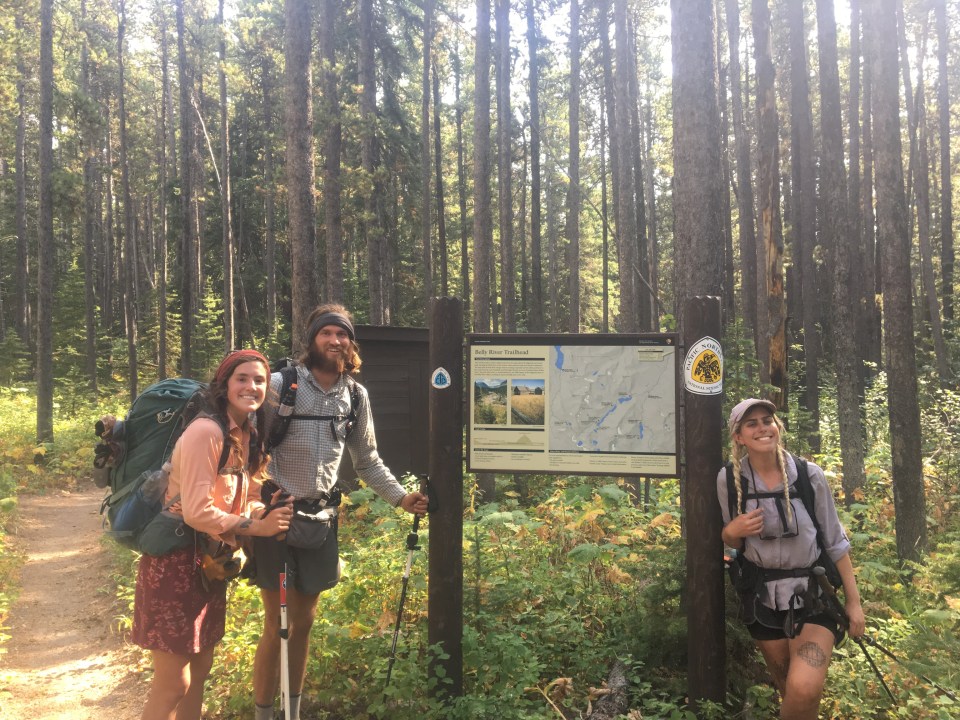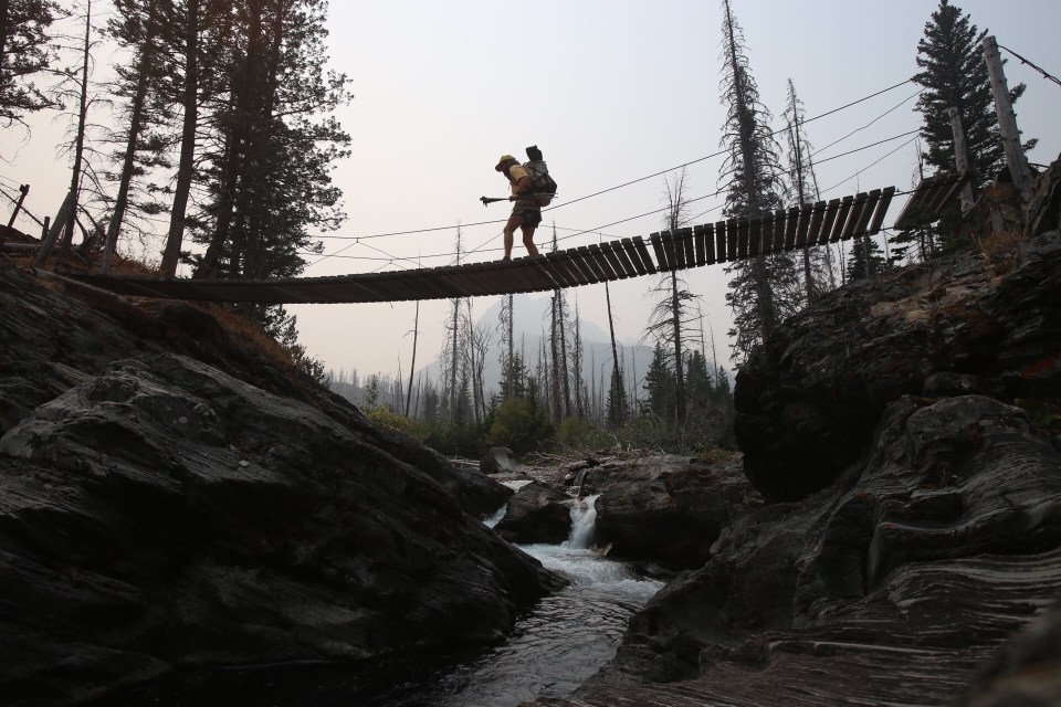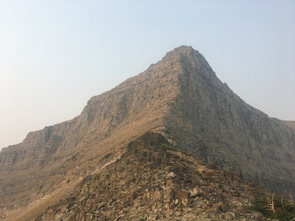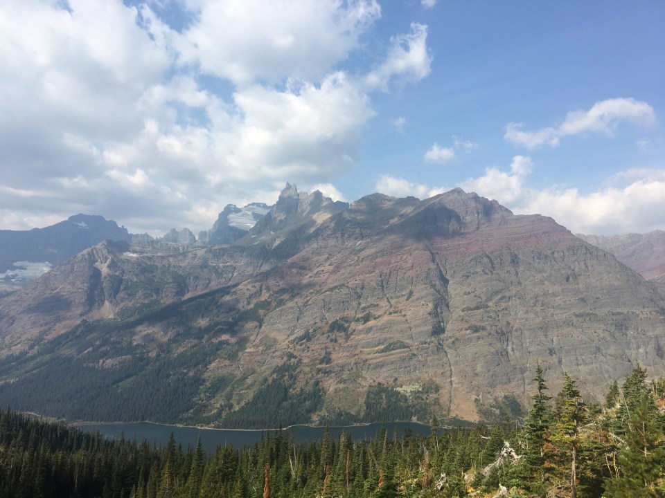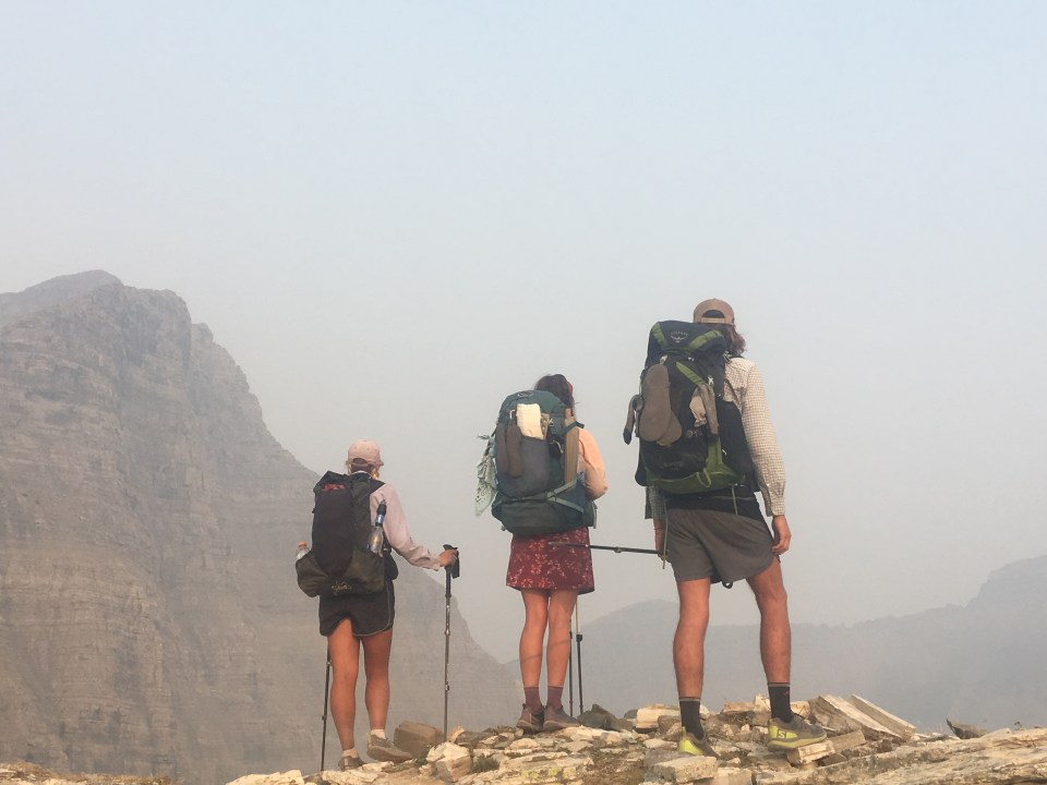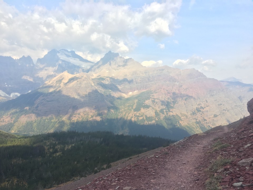 Today was the day! We hiked with Critter and Garbelly for most of the day and started off with a steep climb up to Triple Divide Pass. Although smoky, this was one of the most incredible passes I’ve ever been up and over. There’s three sides to Triple Divide Peak (just to the West of where we crossed); any water that lands on the west flows to the Pacific, water landing on the east flows to the Atlantic and water landing on the north flows to the Arctic Ocean. So cool! While climbing up the Pass, Critter spotted a moose down in the valley from at least a half mile away, then we had a bighorn sheep directly in front of us on trail and on our way down we saw 4 mountain goats way up on the side of a steep wall. The rest of the day the trail was pretty relaxed but there was lots of water. We stopped to jump off rocks into an awesome swimming hole at Red Eagle Creek. In the afternoon we walked along Lake St Mary which was tough to get a good view of because it was super smoky but it’s obviously a spectacular sight. I got another chance to swim at the bottom of Virginia Falls then we stopped again at St Mary Falls. Because of the wildfire situation, QB and I weren’t able to get our backcountry permits so tonight we had to hitch to Rising Sun CG where we’re camping at the hiker walk-in site. Ideally we wanted to camp in the backcountry for our last couple nights on trail but it’s no big deal, I’m just glad the park is still open and I really hope it stays that way. This campground has a restaurant and we were able to get some good food, plus a couple guys that were eating there recognized that we were thru hiking and bought us dessert.