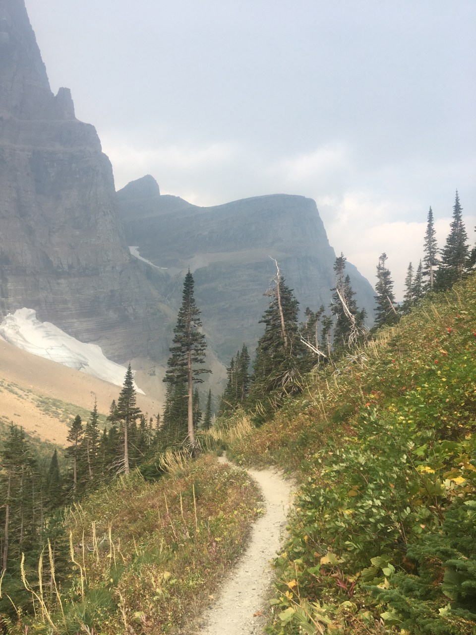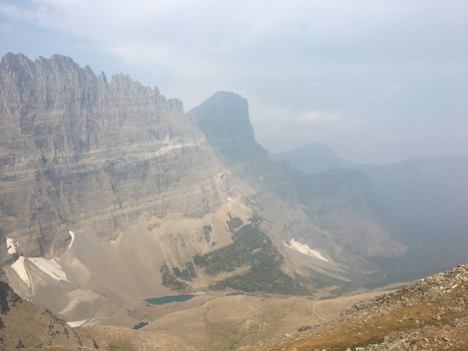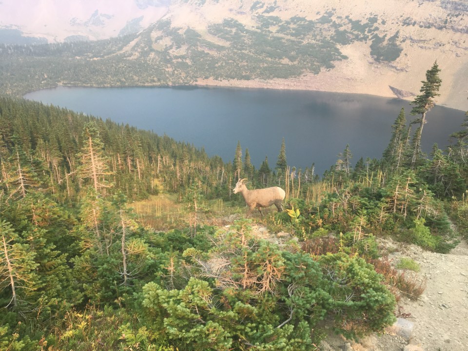 Right away this morning QB and I devoured a huge breakfast at the Two Medicine Grill; omelettes, pancakes, hash browns, even a slice of pie. After breakfast we got back on trail and into Glacier NP starting with a nice stiff climb up to Scenic Point. For a while we walked with Recalculating, who unlike most thru hikers has a wife and 4 young kids at home, pretty awesome situation but not the norm out here. Glacier has been incredible so far, even with a blanket of smoke from the wildfires hanging in the air. I’d love to see this place on clear bluebird days so that’s why I’ll definitely have to come back. The smoke however, puts a whole new paint job on things and makes the mountains and the lakes look really cool. I’ll let the pictures below speak for themselves. Plus I saw a bunch of animals, a moose laying around in the grass and probably about 25 bighorn sheep including a little baby. We’re camping at the Atlantic Creek site and also camping here tonight are Garbelly and Critter who we’ve been keeping in touch with but haven’t seen since Winter Park.