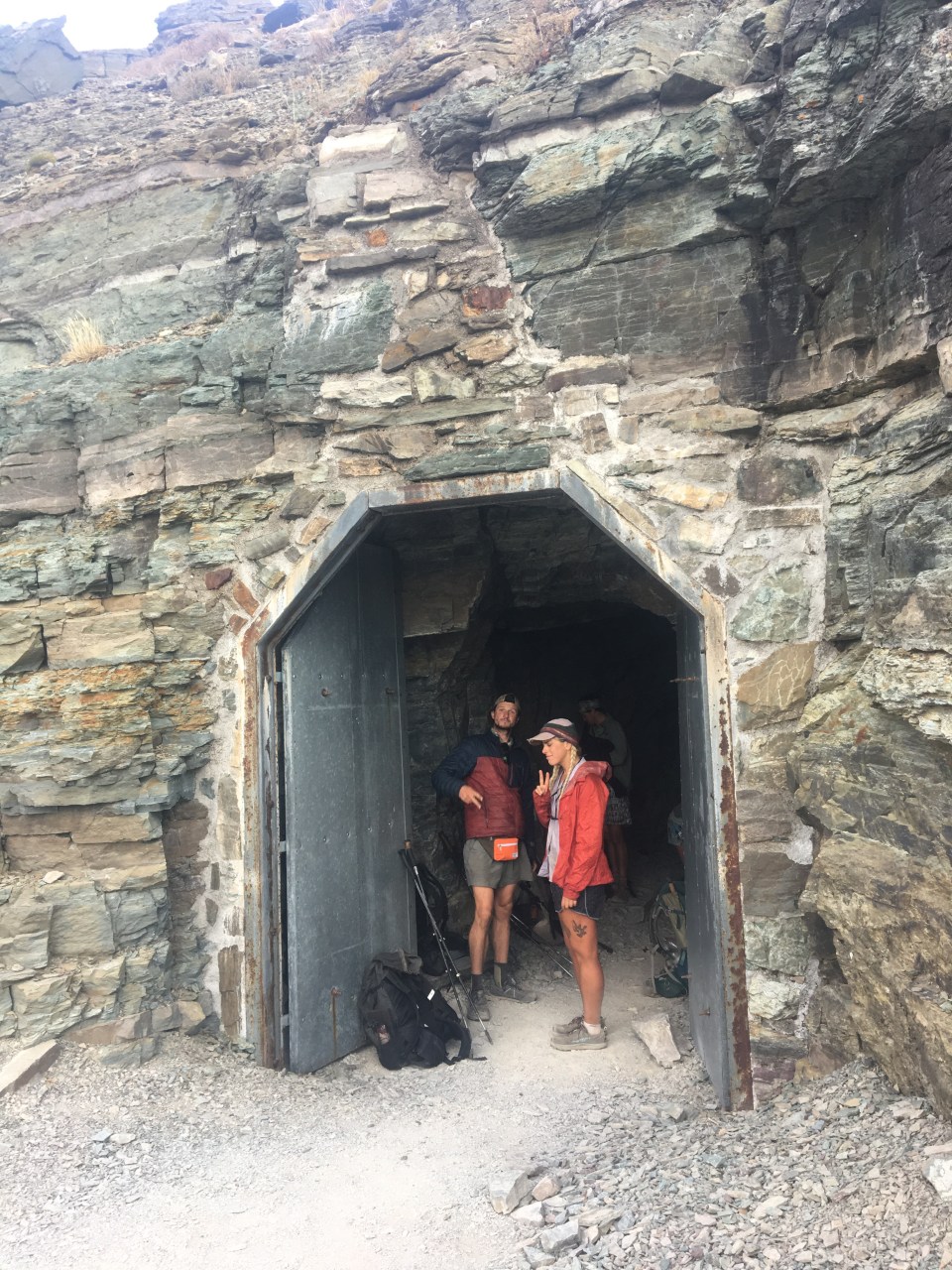 What a day! First of all last night was crazy windy, all night long blowing wicked loud. Even with my earplugs in I hardly slept and it seemed like everybody had the same problem. Even with minimal sleep everybody was still pretty jacked up for our last day. We set off with a big crew of hikers; Garbelly, Critter, Flip Flop, Liam and Kate. From Many Glacier we climbed up to Ptarmigan Pass that has a tunnel going 150 feet blasted through the Pass. It was awesome! We all chilled out up there for awhile enjoying the view, then went through to the other side and the trail down was absolutely spectacular! I can’t believe somebody decided to build a trail and this tunnel up here. We walked half a dozen more miles before coming across Dawn Mist Falls and took the little side trail to it. This was the last highlight of the trail and my last opportunity to jump into freezing cold water so of course I did. After the falls it was only 6 or 7 miles until the road and the border crossing at Chief Mountain. We crossed the border, did the damn thing, got our passports stamped, and took a bunch of pictures by the monument. From the border our friend had rides up to Calgary and QB and I hitched south. We got a fun ride from Ina, Karen, and Jules (an AT long distance hiker herself) back to East Glacier. There are lots of hikers in town and after pigging out at the restaurant we hung out with all them out front.