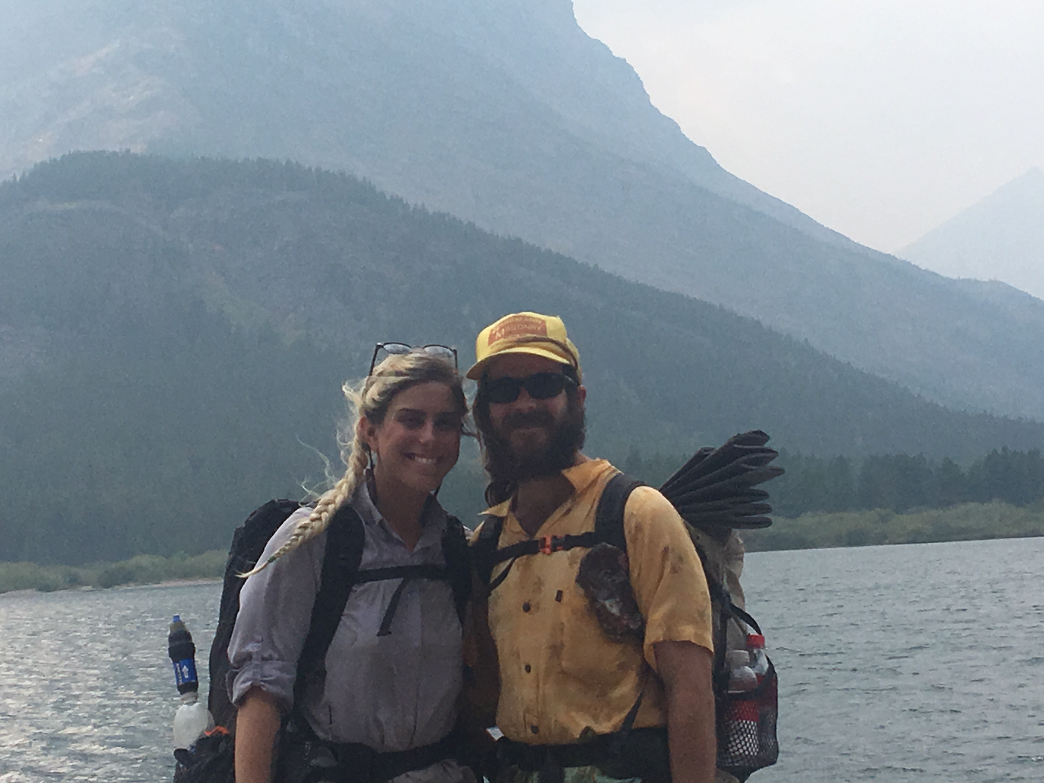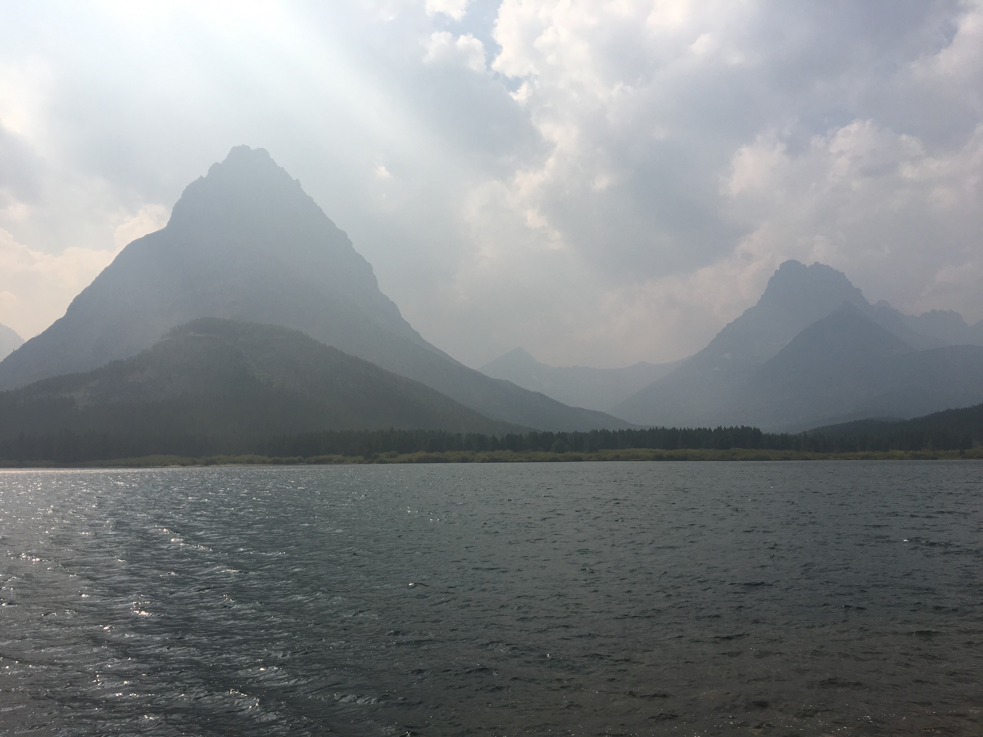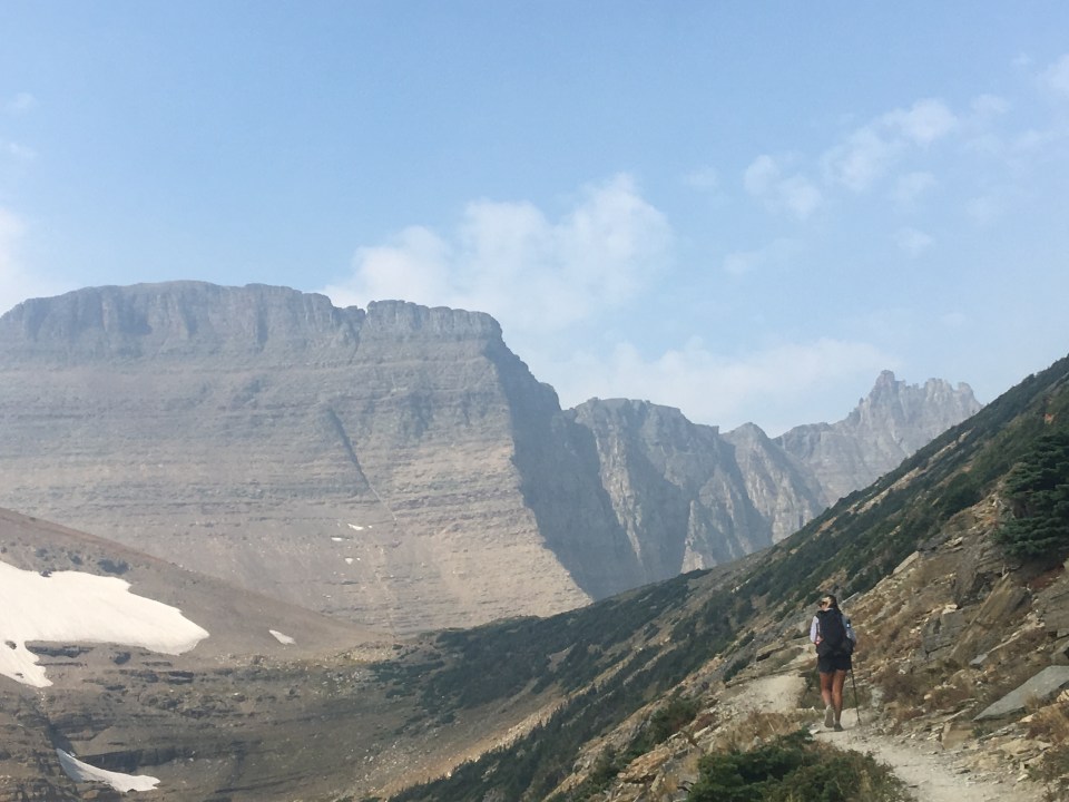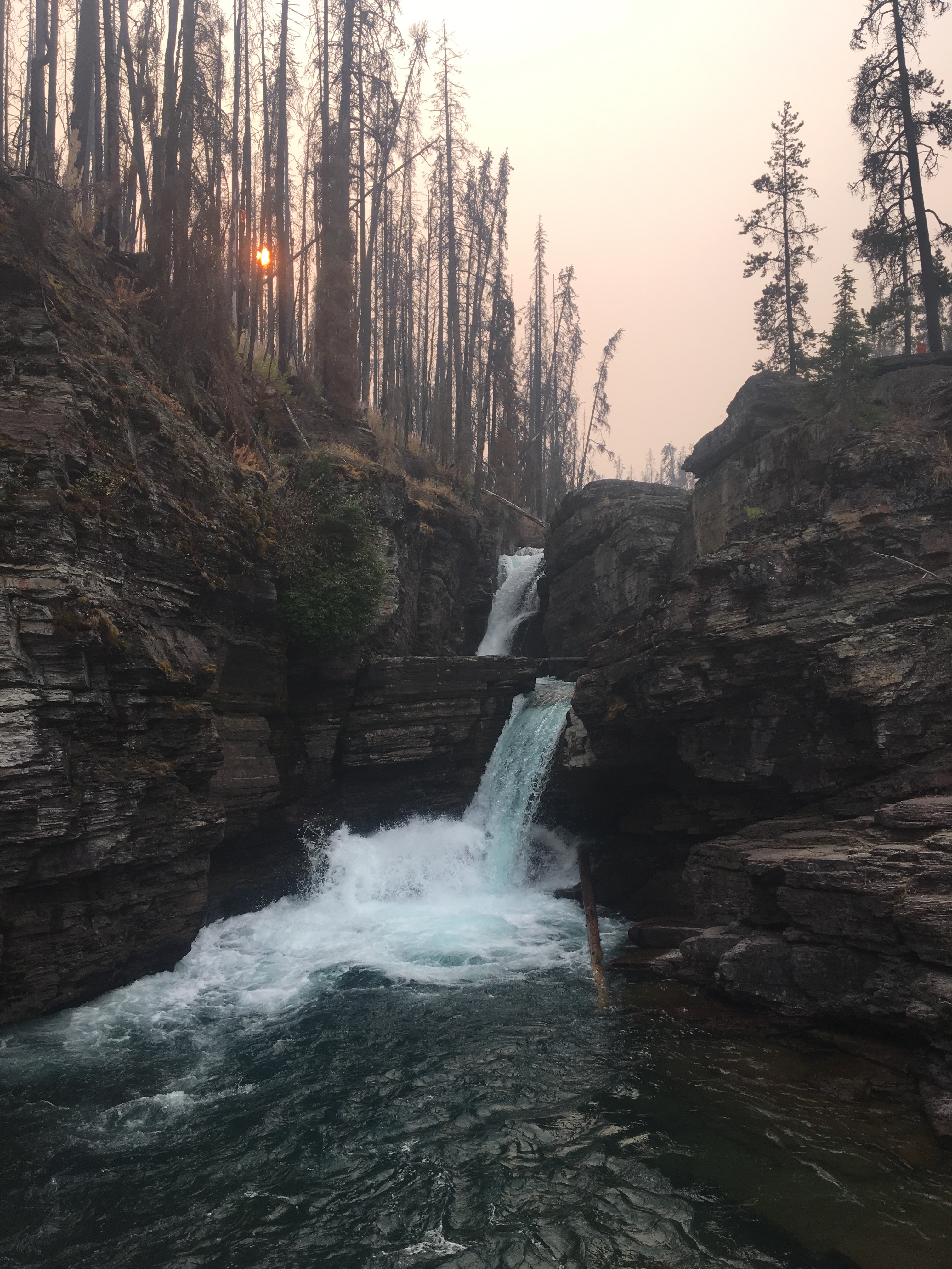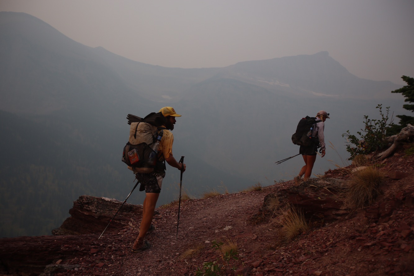 Today was the day! We hiked with Critter and Garbelly for most of the day and started off with a steep climb up to Triple Divide Pass. Although smoky, this was one of the most incredible passes I’ve ever been up and over. There’s three sides to Triple Divide Peak (just to the West of where we crossed); any water that lands on the west flows to the Pacific, water landing on the east flows to the Atlantic and water landing on the north flows to the Arctic Ocean. So cool! While climbing up the Pass, Critter spotted a moose down in the valley from at least a half mile away, then we had a bighorn sheep directly in front of us on trail and on our way down we saw 4 mountain goats way up on the side of a steep wall. The rest of the day the trail was pretty relaxed but there was lots of water. We stopped to jump off rocks into an awesome swimming hole at Red Eagle Creek. In the afternoon we walked along Lake St Mary which was tough to get a good view of because it was super smoky but it’s obviously a spectacular sight. I got another chance to swim at the bottom of Virginia Falls then we stopped again at St Mary Falls. Because of the wildfire situation, QB and I weren’t able to get our backcountry permits so tonight we had to hitch to Rising Sun CG where we’re camping at the hiker walk-in site. Ideally we wanted to camp in the backcountry for our last couple nights on trail but it’s no big deal, I’m just glad the park is still open and I really hope it stays that way. This campground has a restaurant and we were able to get some good food, plus a couple guys that were eating there recognized that we were thru hiking and bought us dessert.