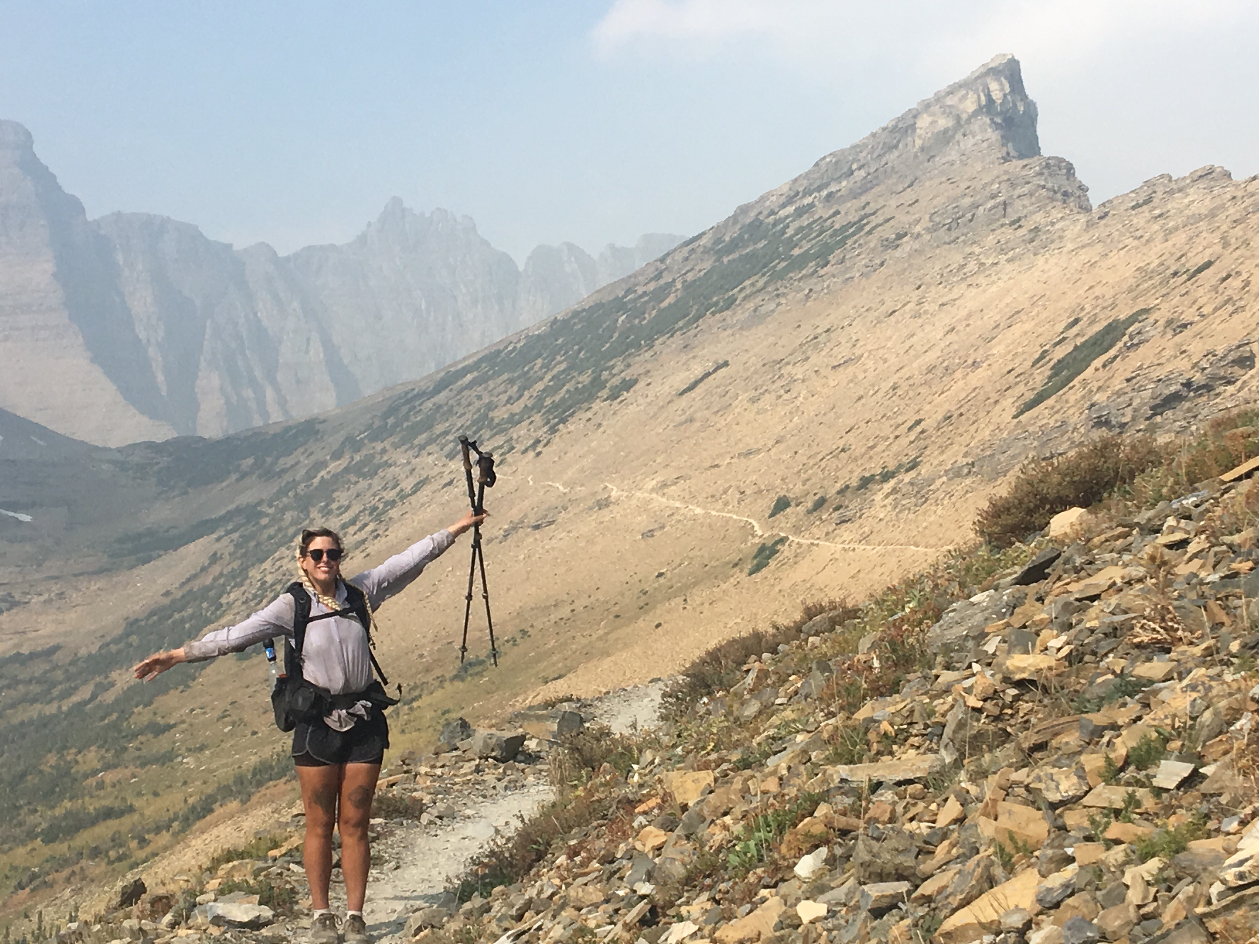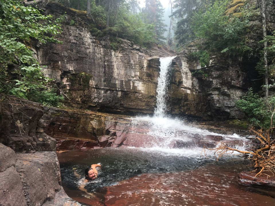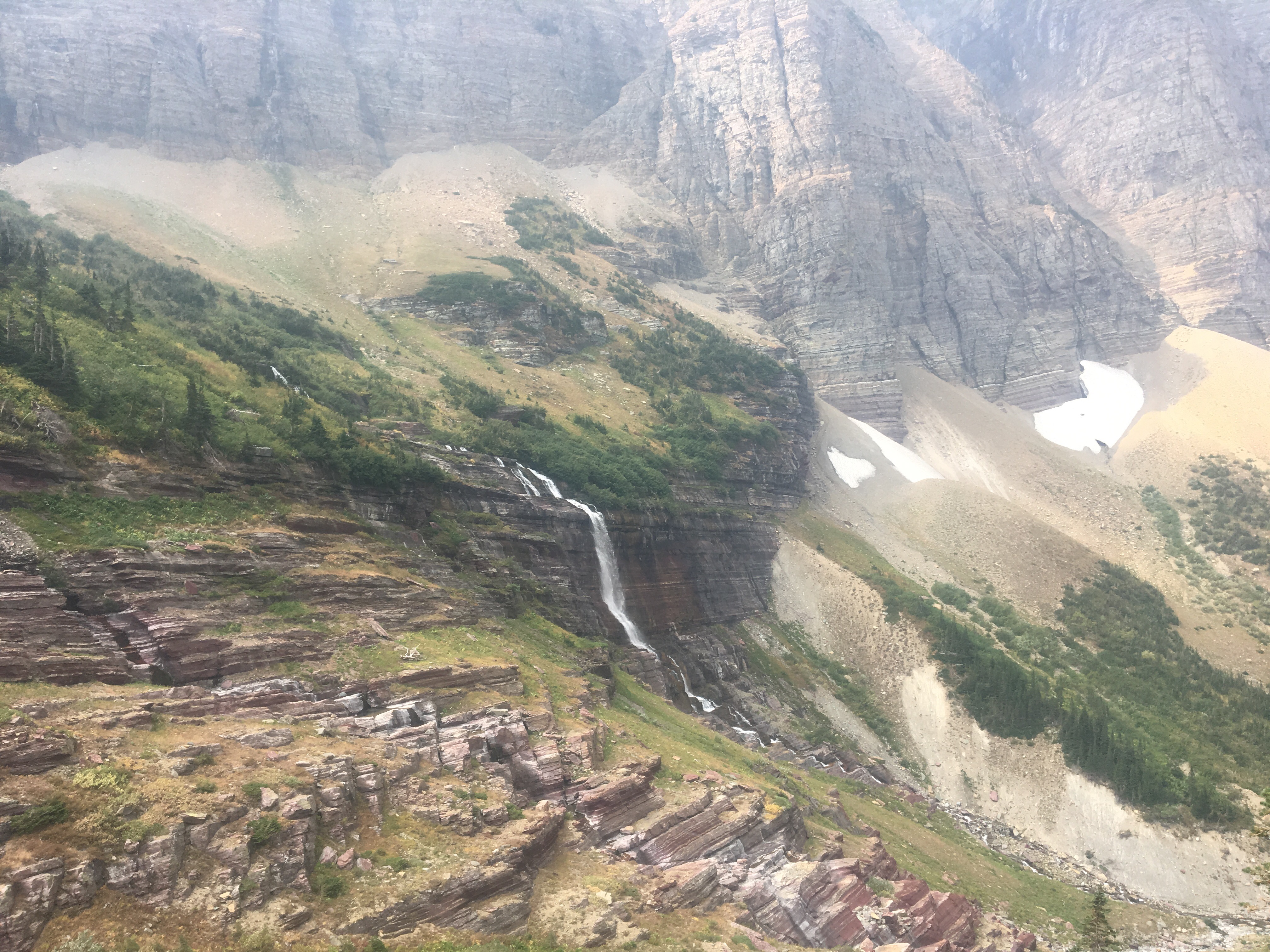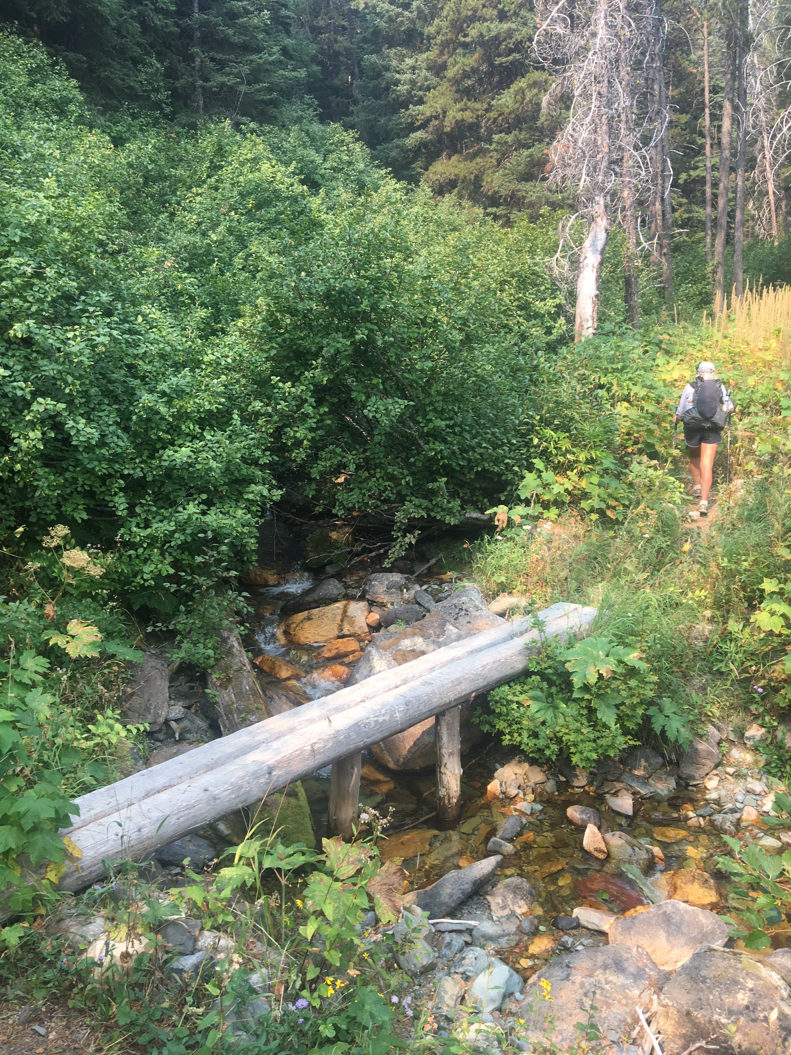 Today was the day! We hiked with Critter and Garbelly for most of the day and started off with a steep climb up to Triple Divide Pass. Although smoky, this was one of the most incredible passes I’ve ever been up and over. There’s three sides to Triple Divide Peak (just to the West of where we crossed); any water that lands on the west flows to the Pacific, water landing on the east flows to the Atlantic and water landing on the north flows to the Arctic Ocean. So cool! While climbing up the Pass, Critter spotted a moose down in the valley from at least a half mile away, then we had a bighorn sheep directly in front of us on trail and on our way down we saw 4 mountain goats way up on the side of a steep wall. The rest of the day the trail was pretty relaxed but there was lots of water. We stopped to jump off rocks into an awesome swimming hole at Red Eagle Creek. In the afternoon we walked along Lake St Mary which was tough to get a good view of because it was super smoky but it’s obviously a spectacular sight. I got another chance to swim at the bottom of Virginia Falls then we stopped again at St Mary Falls. Because of the wildfire situation, QB and I weren’t able to get our backcountry permits so tonight we had to hitch to Rising Sun CG where we’re camping at the hiker walk-in site. Ideally we wanted to camp in the backcountry for our last couple nights on trail but it’s no big deal, I’m just glad the park is still open and I really hope it stays that way. This campground has a restaurant and we were able to get some good food, plus a couple guys that were eating there recognized that we were thru hiking and bought us dessert.