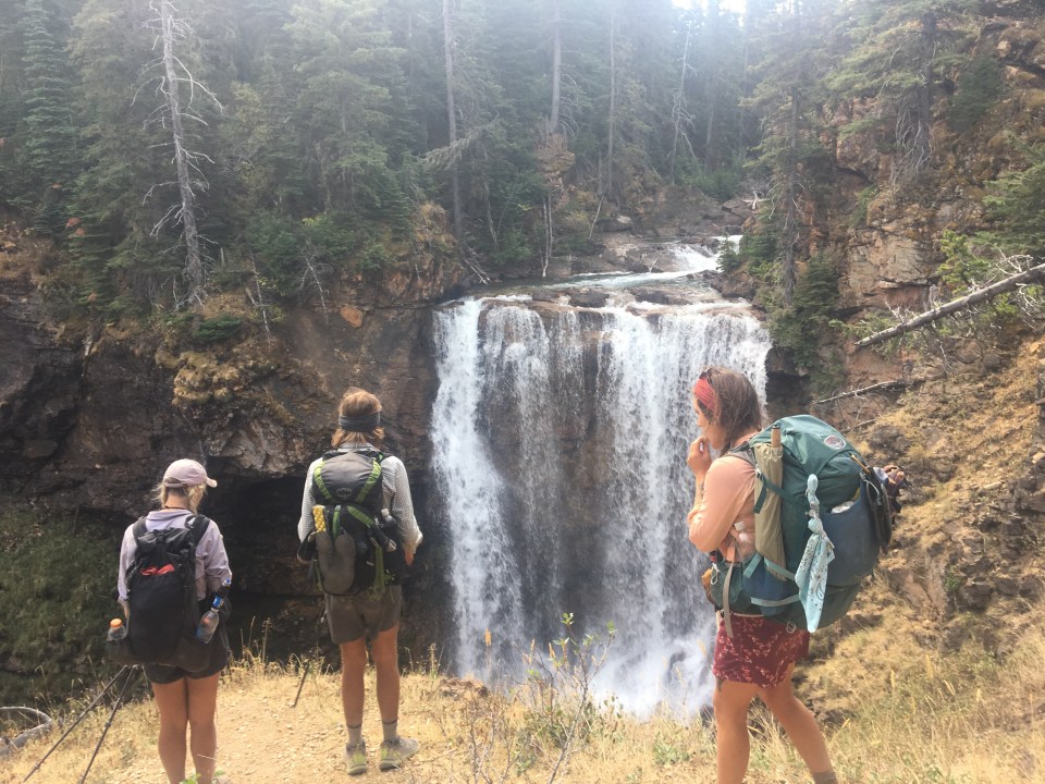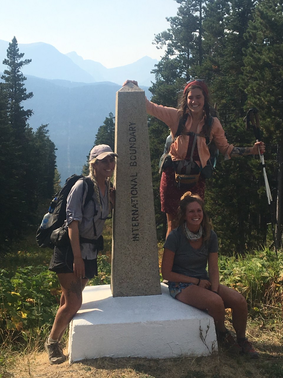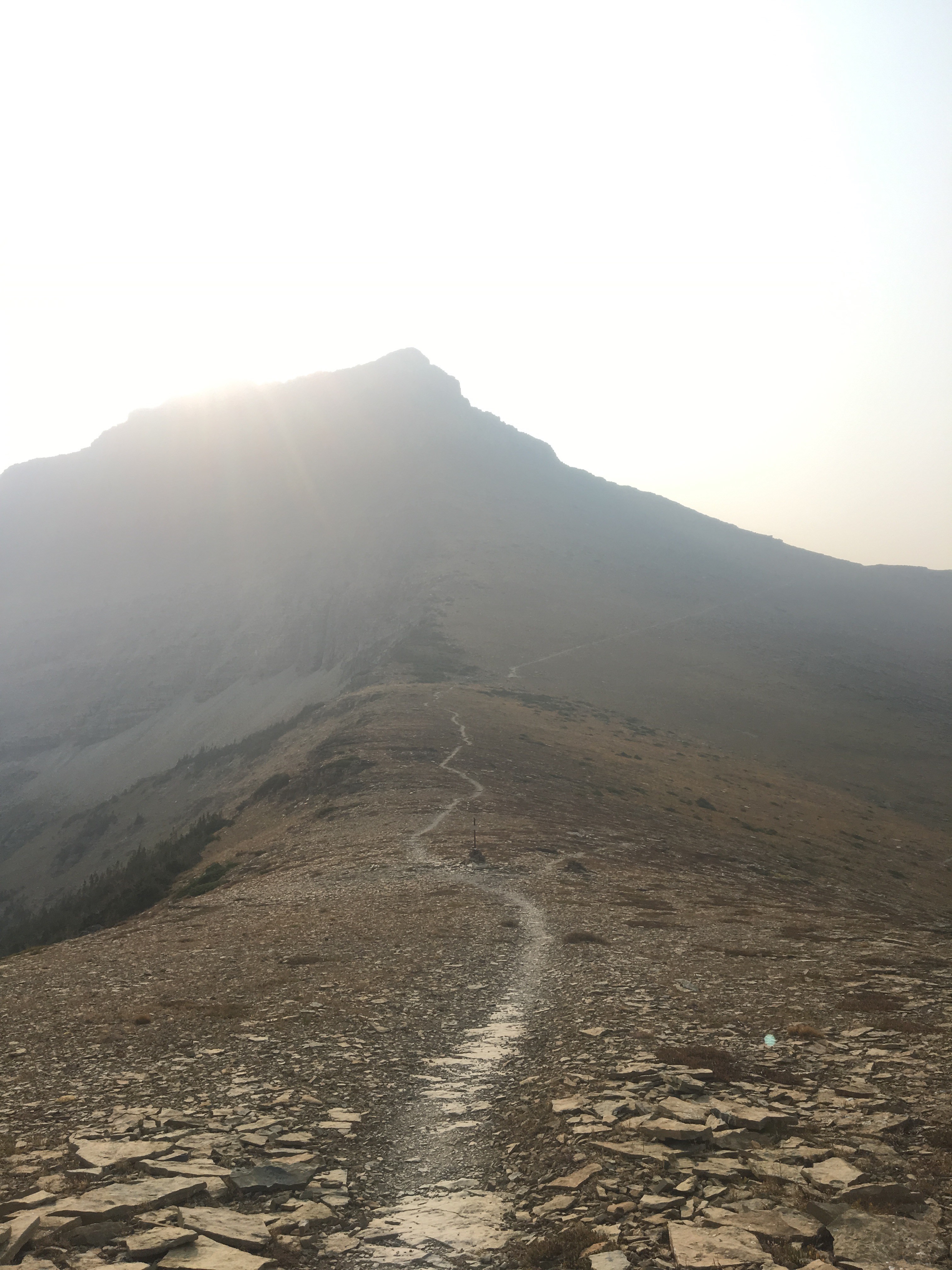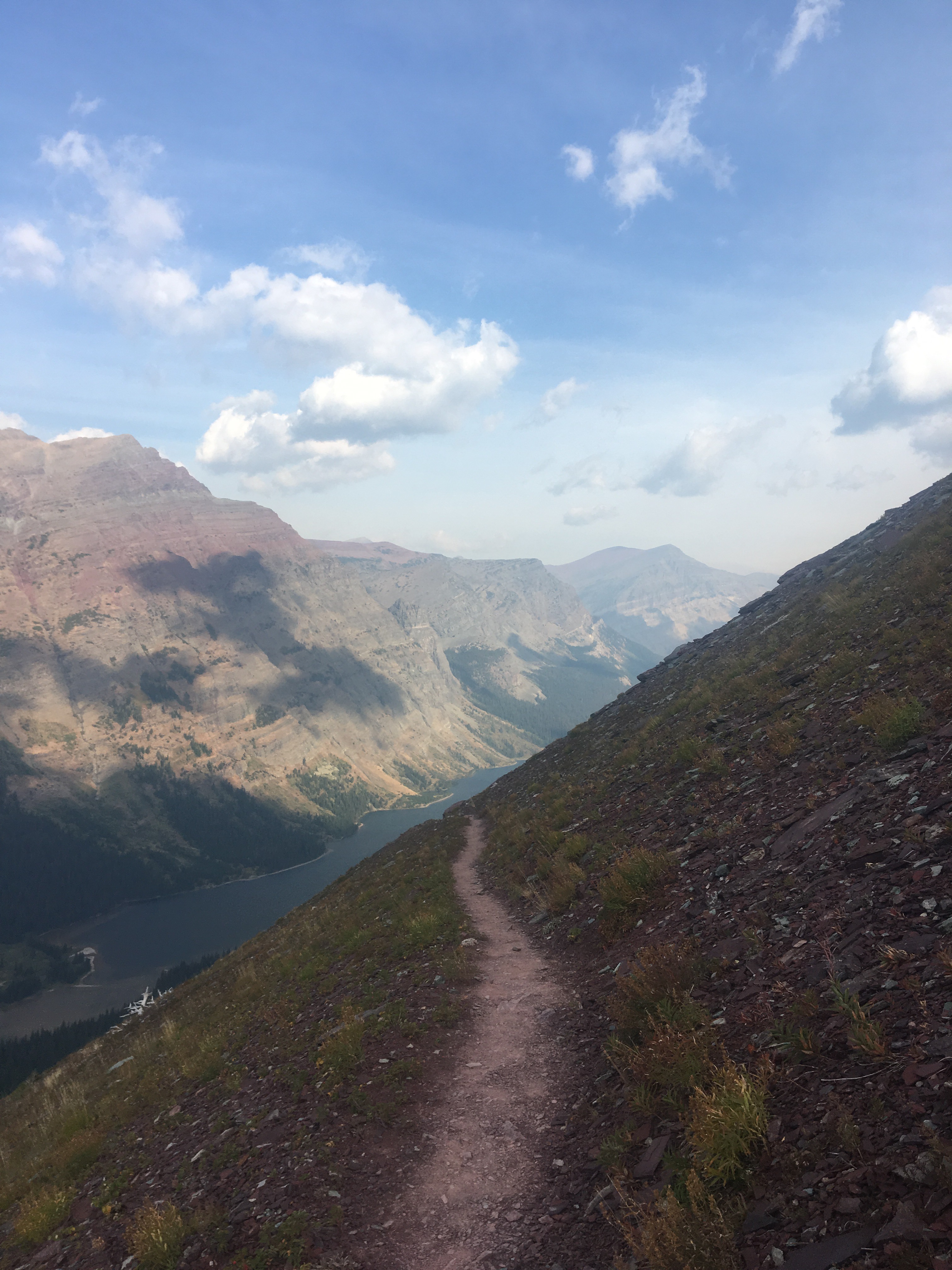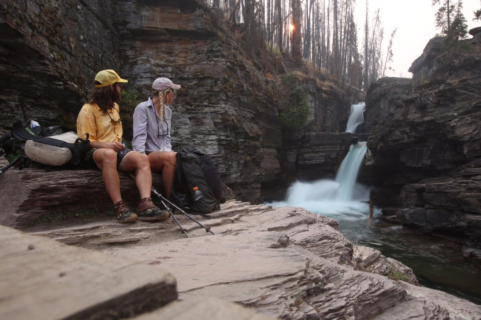 Today was the day! We hiked with Critter and Garbelly for most of the day and started off with a steep climb up to Triple Divide Pass. Although smoky, this was one of the most incredible passes I’ve ever been up and over. There’s three sides to Triple Divide Peak (just to the West of where we crossed); any water that lands on the west flows to the Pacific, water landing on the east flows to the Atlantic and water landing on the north flows to the Arctic Ocean. So cool! While climbing up the Pass, Critter spotted a moose down in the valley from at least a half mile away, then we had a bighorn sheep directly in front of us on trail and on our way down we saw 4 mountain goats way up on the side of a steep wall. The rest of the day the trail was pretty relaxed but there was lots of water. We stopped to jump off rocks into an awesome swimming hole at Red Eagle Creek. In the afternoon we walked along Lake St Mary which was tough to get a good view of because it was super smoky but it’s obviously a spectacular sight. I got another chance to swim at the bottom of Virginia Falls then we stopped again at St Mary Falls. Because of the wildfire situation, QB and I weren’t able to get our backcountry permits so tonight we had to hitch to Rising Sun CG where we’re camping at the hiker walk-in site. Ideally we wanted to camp in the backcountry for our last couple nights on trail but it’s no big deal, I’m just glad the park is still open and I really hope it stays that way. This campground has a restaurant and we were able to get some good food, plus a couple guys that were eating there recognized that we were thru hiking and bought us dessert.