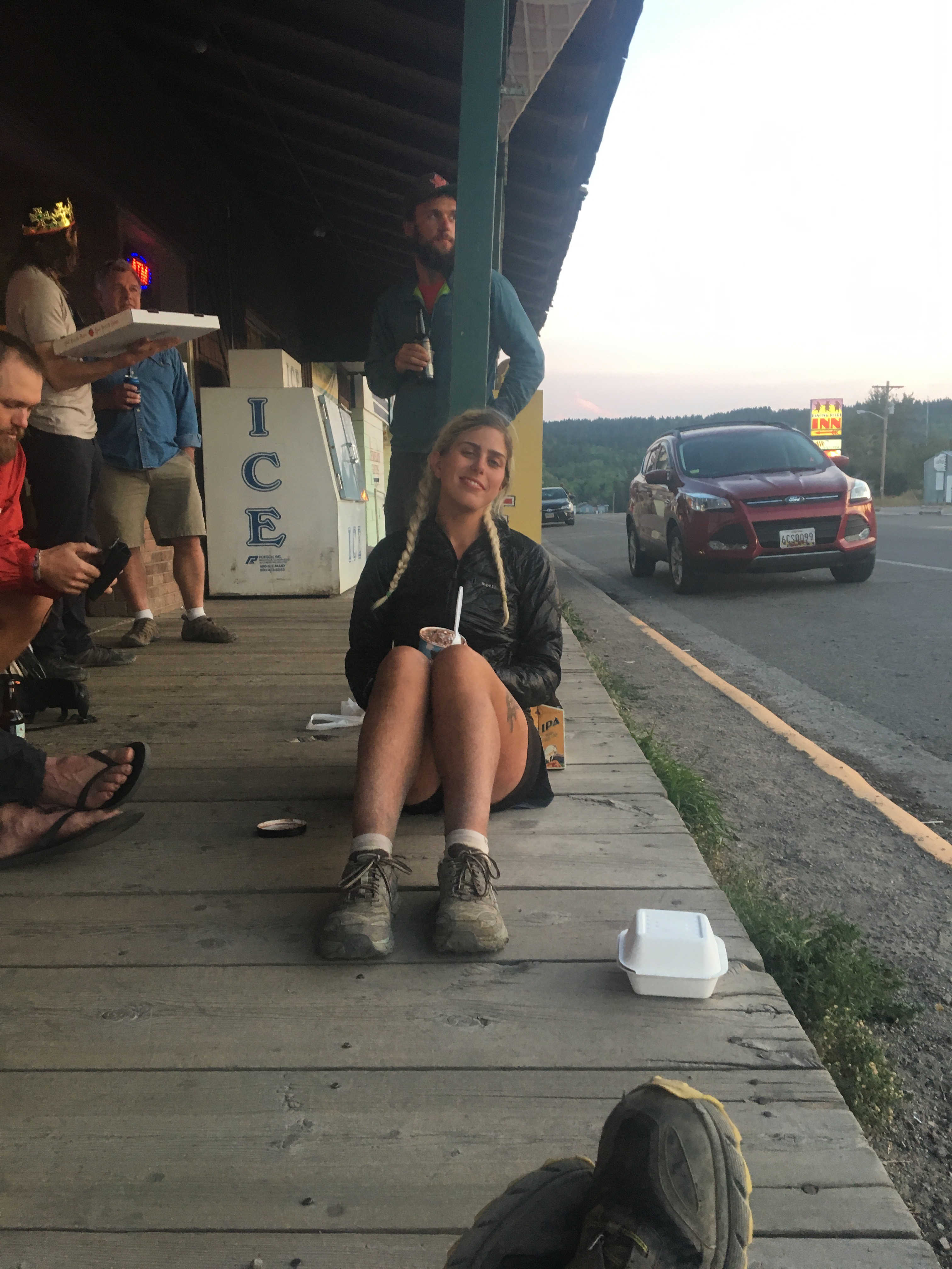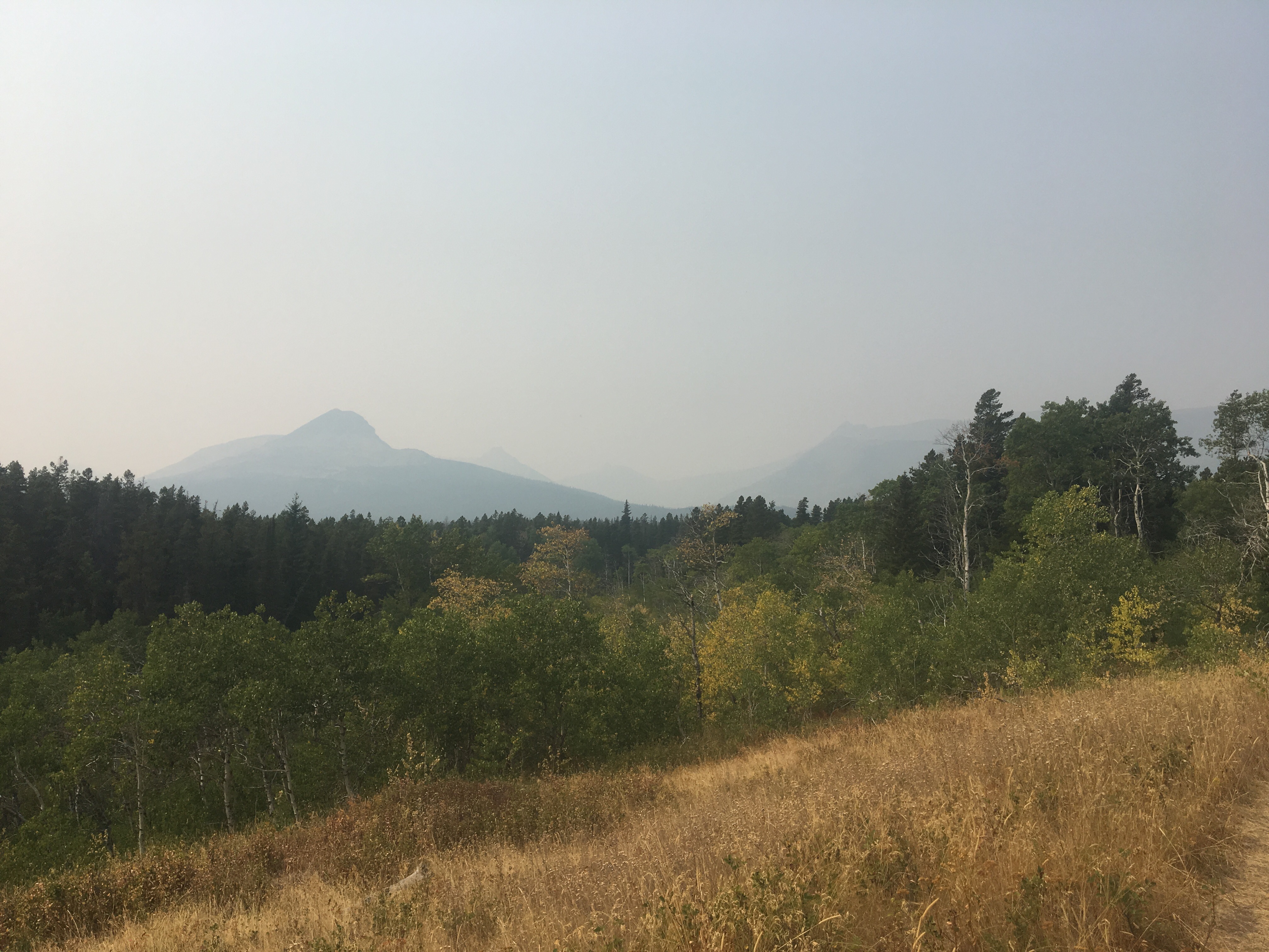 This morning we got up and started cruising right into town. We crossed rt 2 and some railroad tracks and got into Glacier NP but since our permits don’t start until tomorrow night we’ll be walking back into East Glacier Village and spending the night there. From Marias Pass the trail kind of parallels the road and the tracks all the way to town. There wasn’t anything too spectacular to see from trail, or maybe there was, it was just too smoky to see much of anything. About a mile from town I saw and heard a small dark brown bear crashing through the woods 15-20 feet to my right. It scared the bejesuses out of me but I recovered quickly. Once again QB didn’t see it but she did hear it. Current bear score 12-2 in my favor. We got to town and ate a couple times at the Two Medicine Grill, which I recommend. I did laundry and showered for the first time in a week and got a room half off at the Circle R motel because it didn’t have a TV. Fine with me, I feel like hotel TV’s only play Forensic Files anyway.