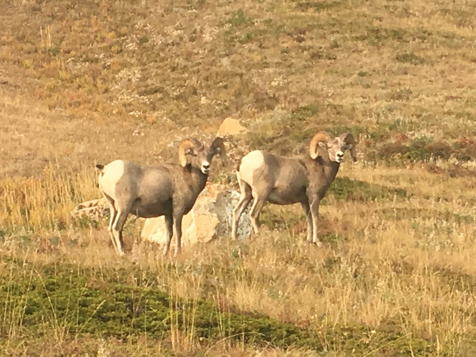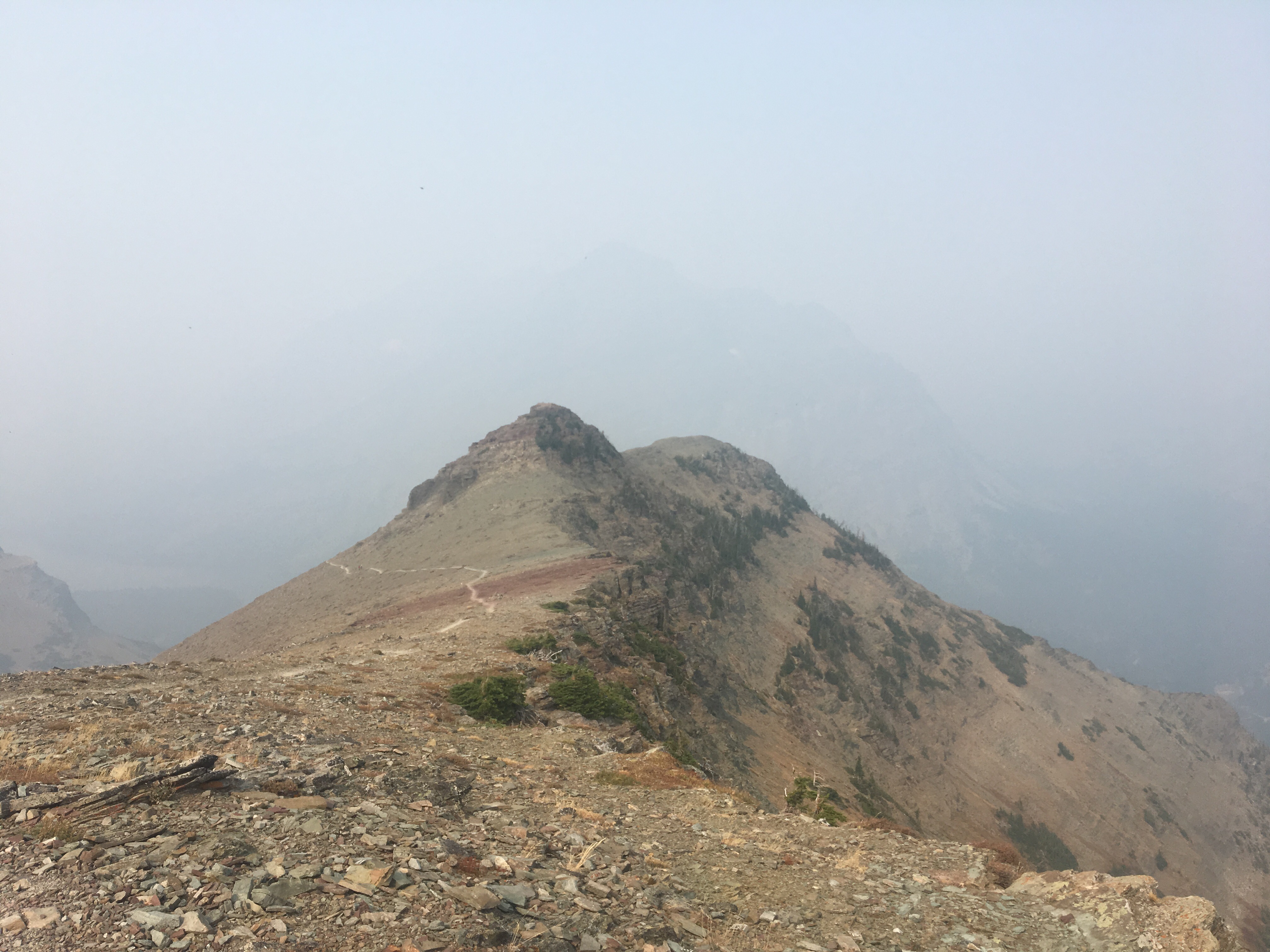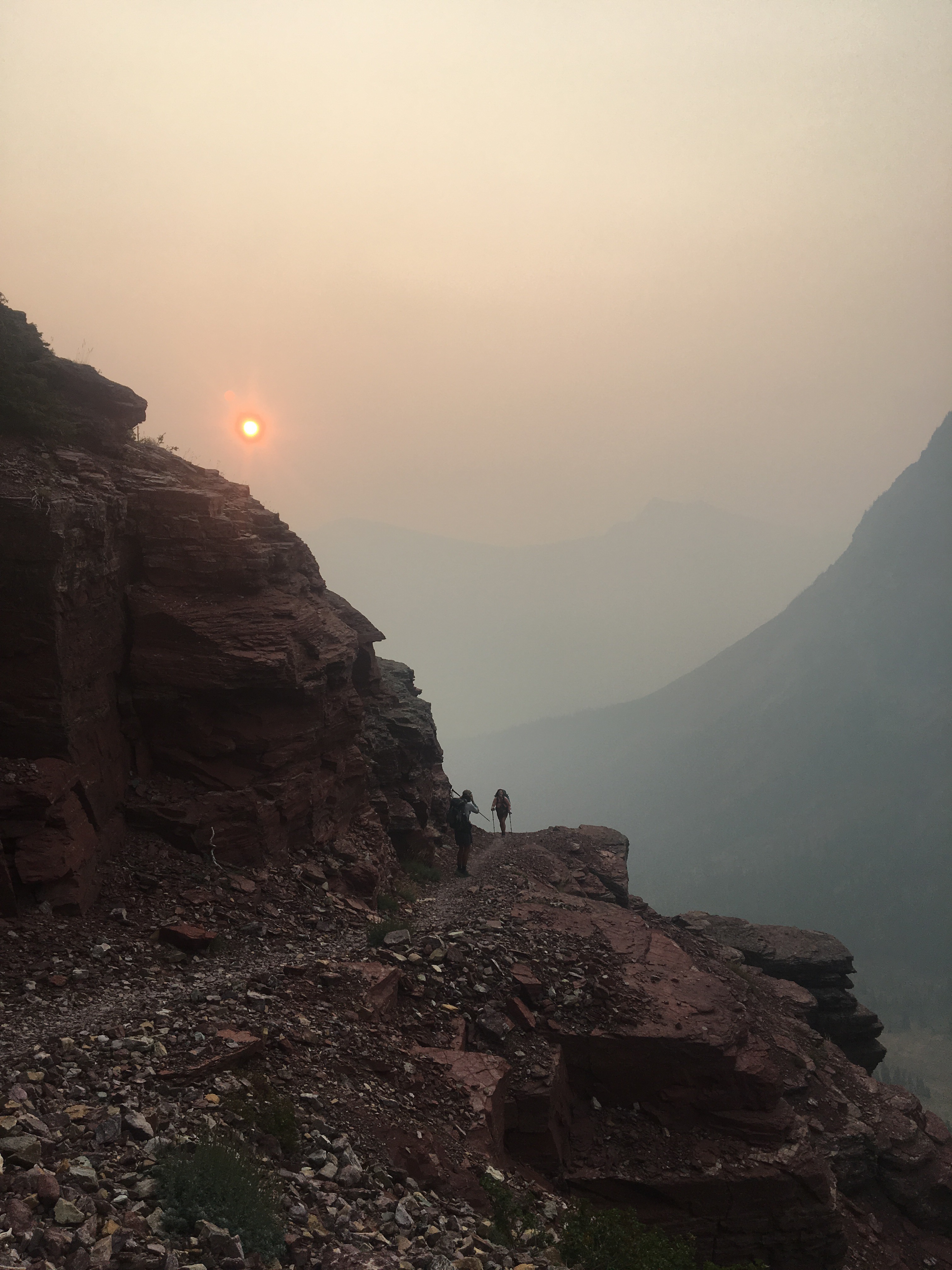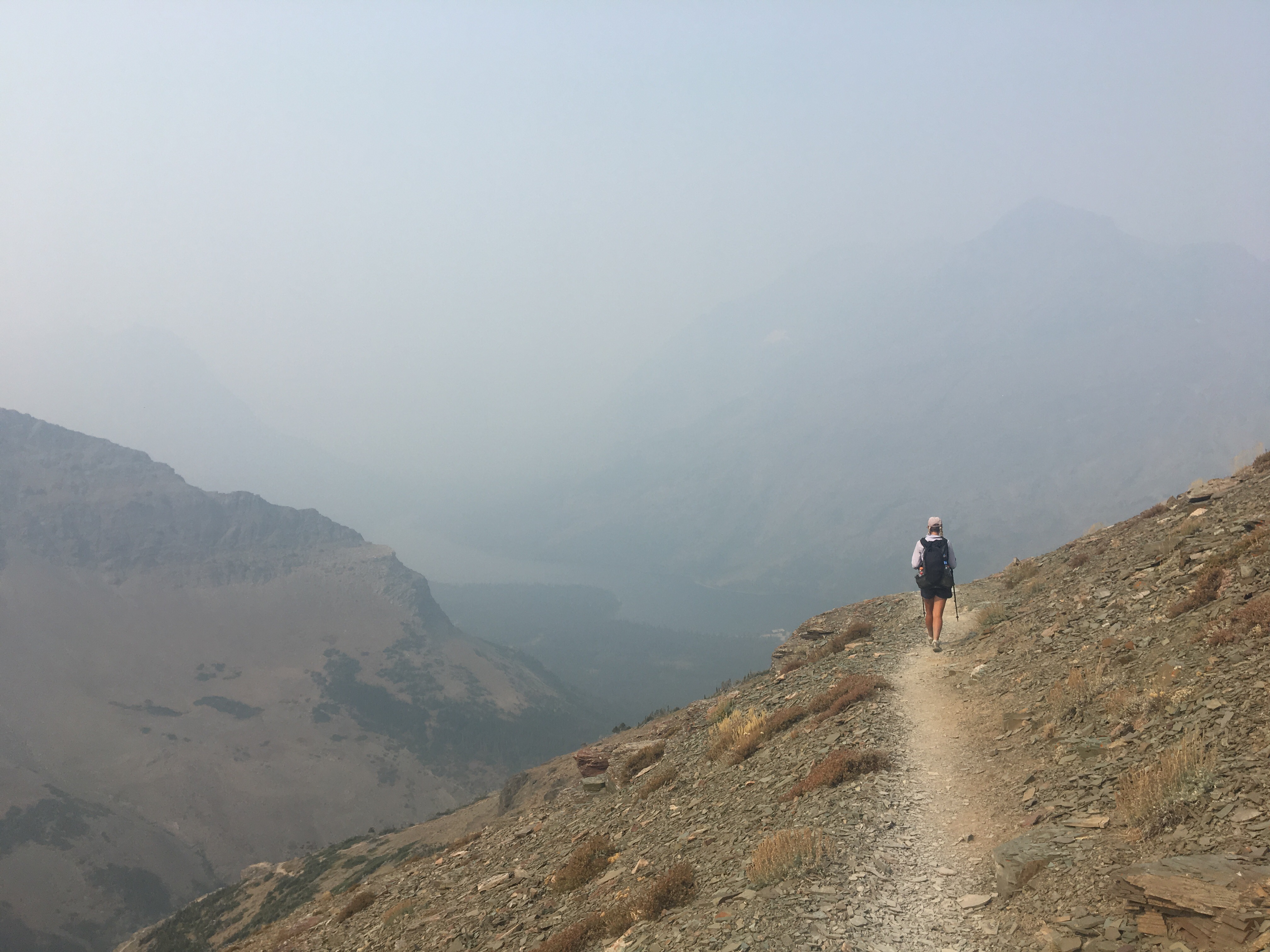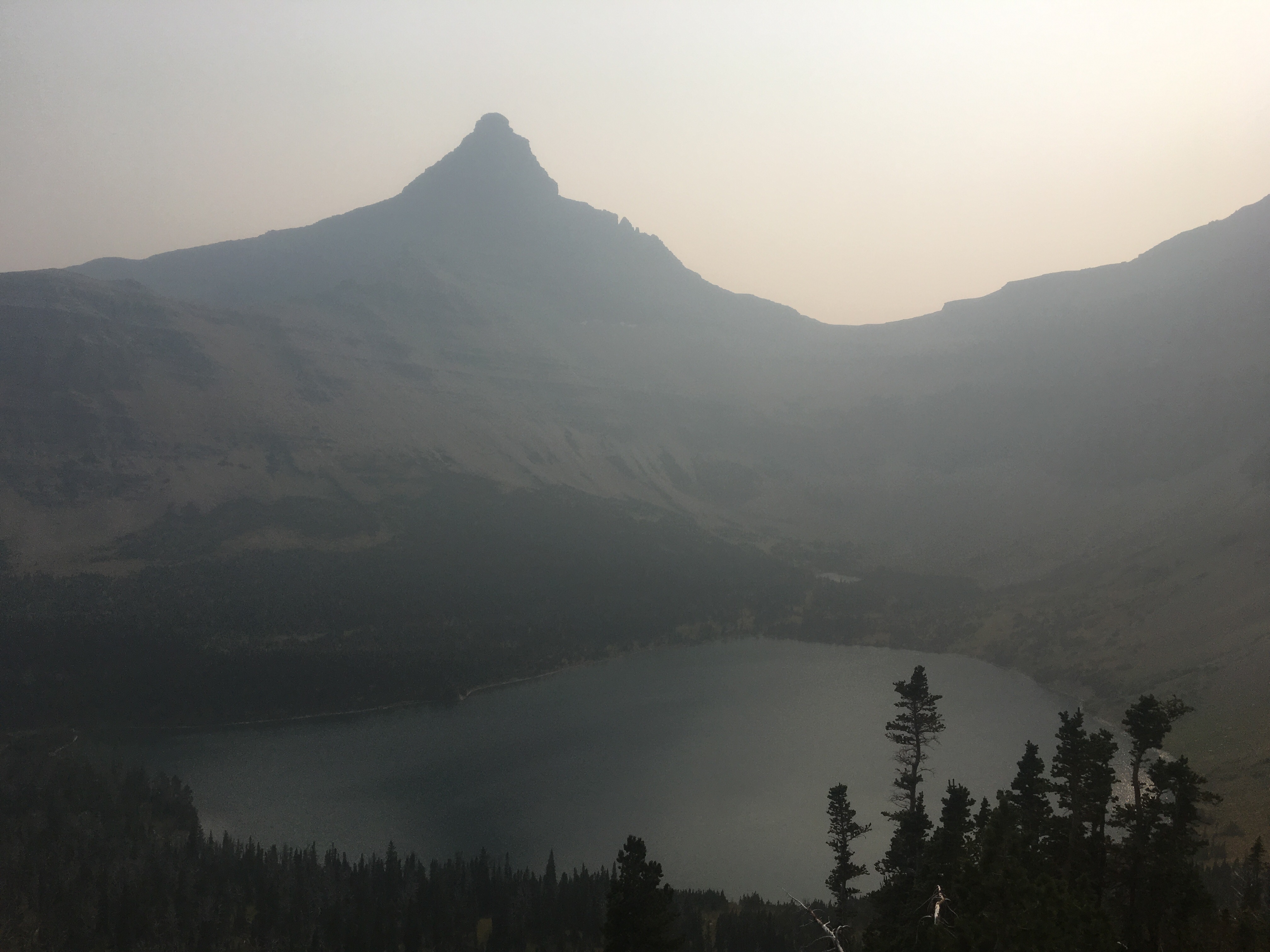 Right away this morning QB and I devoured a huge breakfast at the Two Medicine Grill; omelettes, pancakes, hash browns, even a slice of pie. After breakfast we got back on trail and into Glacier NP starting with a nice stiff climb up to Scenic Point. For a while we walked with Recalculating, who unlike most thru hikers has a wife and 4 young kids at home, pretty awesome situation but not the norm out here. Glacier has been incredible so far, even with a blanket of smoke from the wildfires hanging in the air. I’d love to see this place on clear bluebird days so that’s why I’ll definitely have to come back. The smoke however, puts a whole new paint job on things and makes the mountains and the lakes look really cool. I’ll let the pictures below speak for themselves. Plus I saw a bunch of animals, a moose laying around in the grass and probably about 25 bighorn sheep including a little baby. We’re camping at the Atlantic Creek site and also camping here tonight are Garbelly and Critter who we’ve been keeping in touch with but haven’t seen since Winter Park.