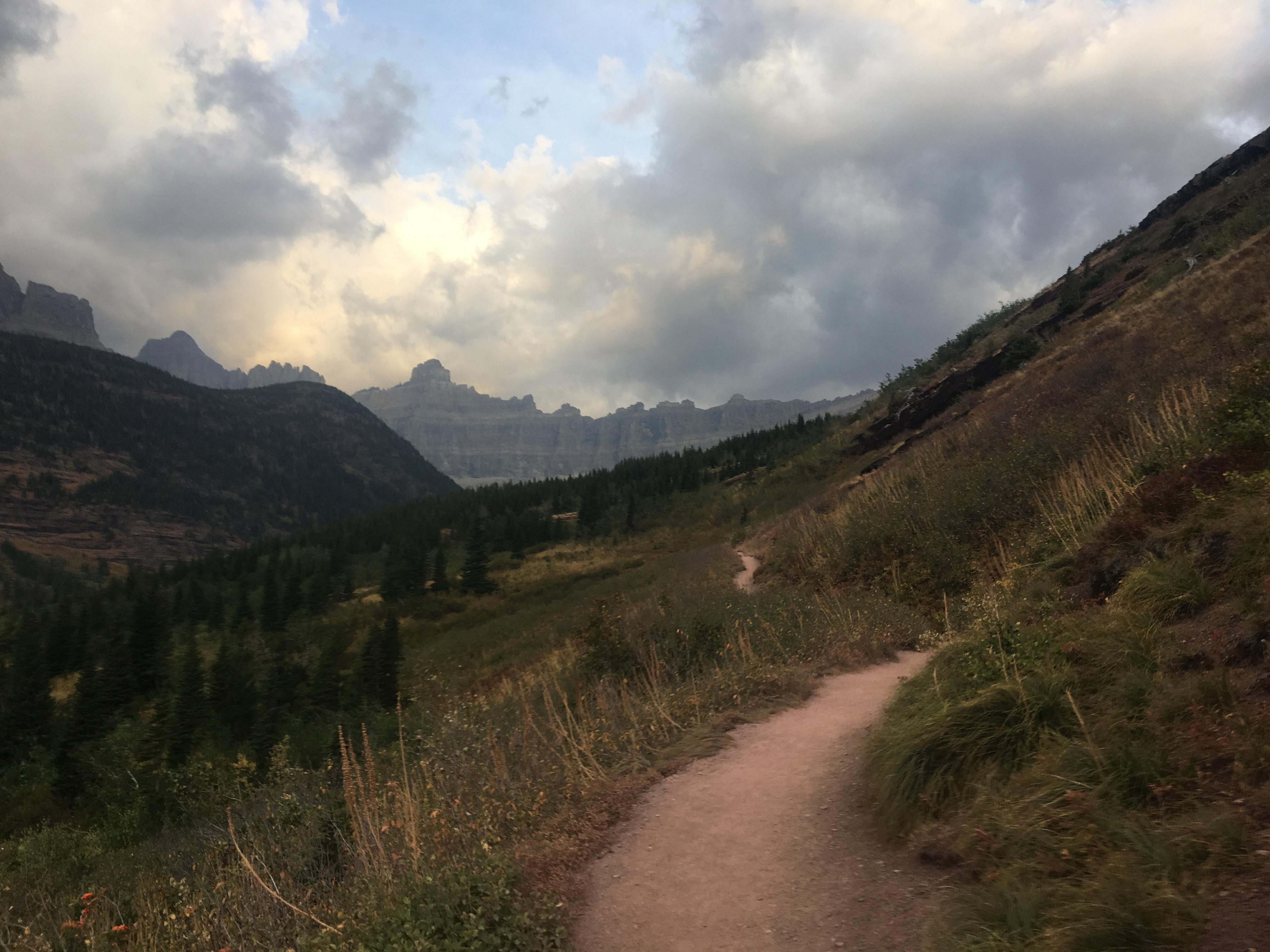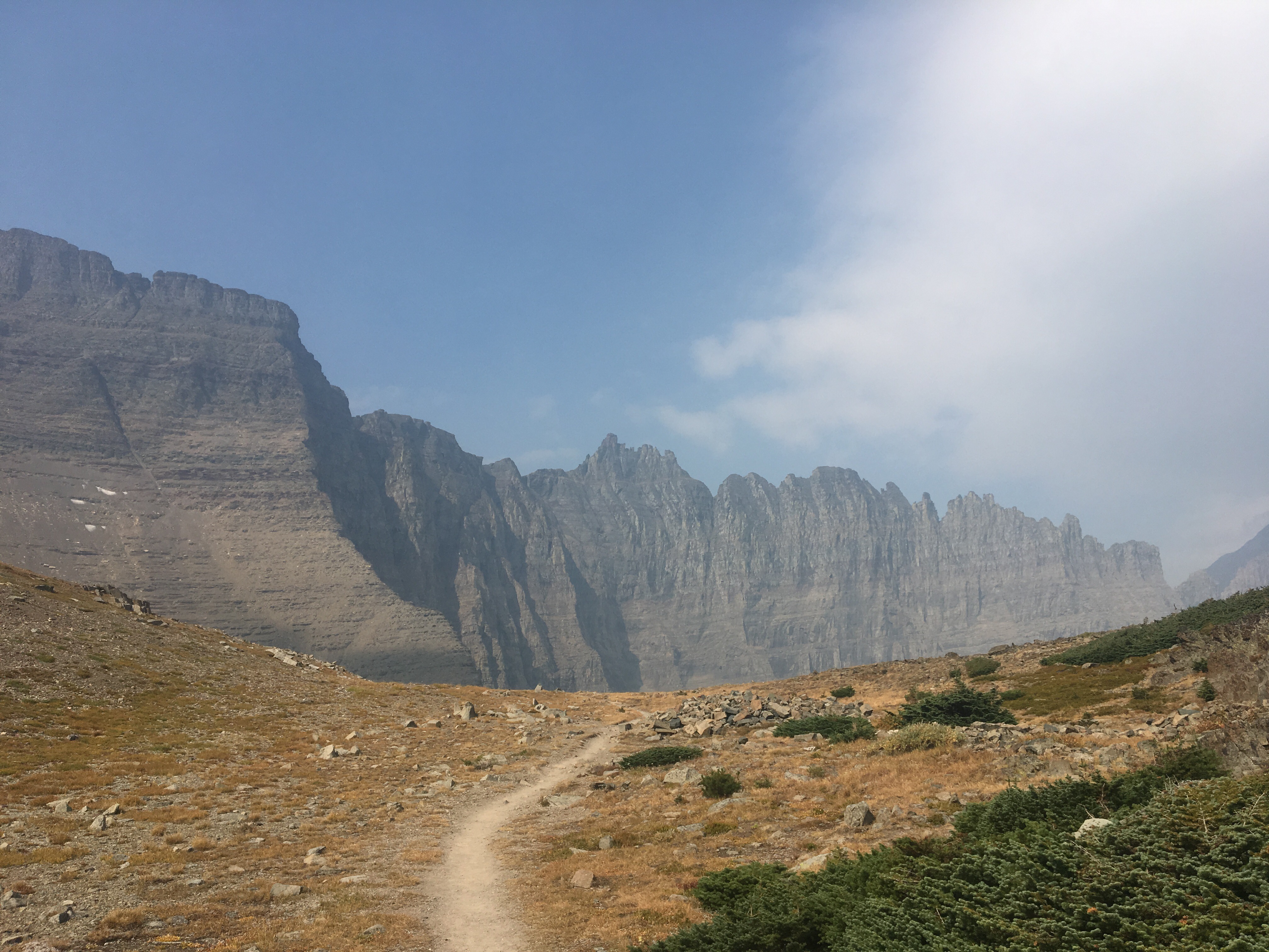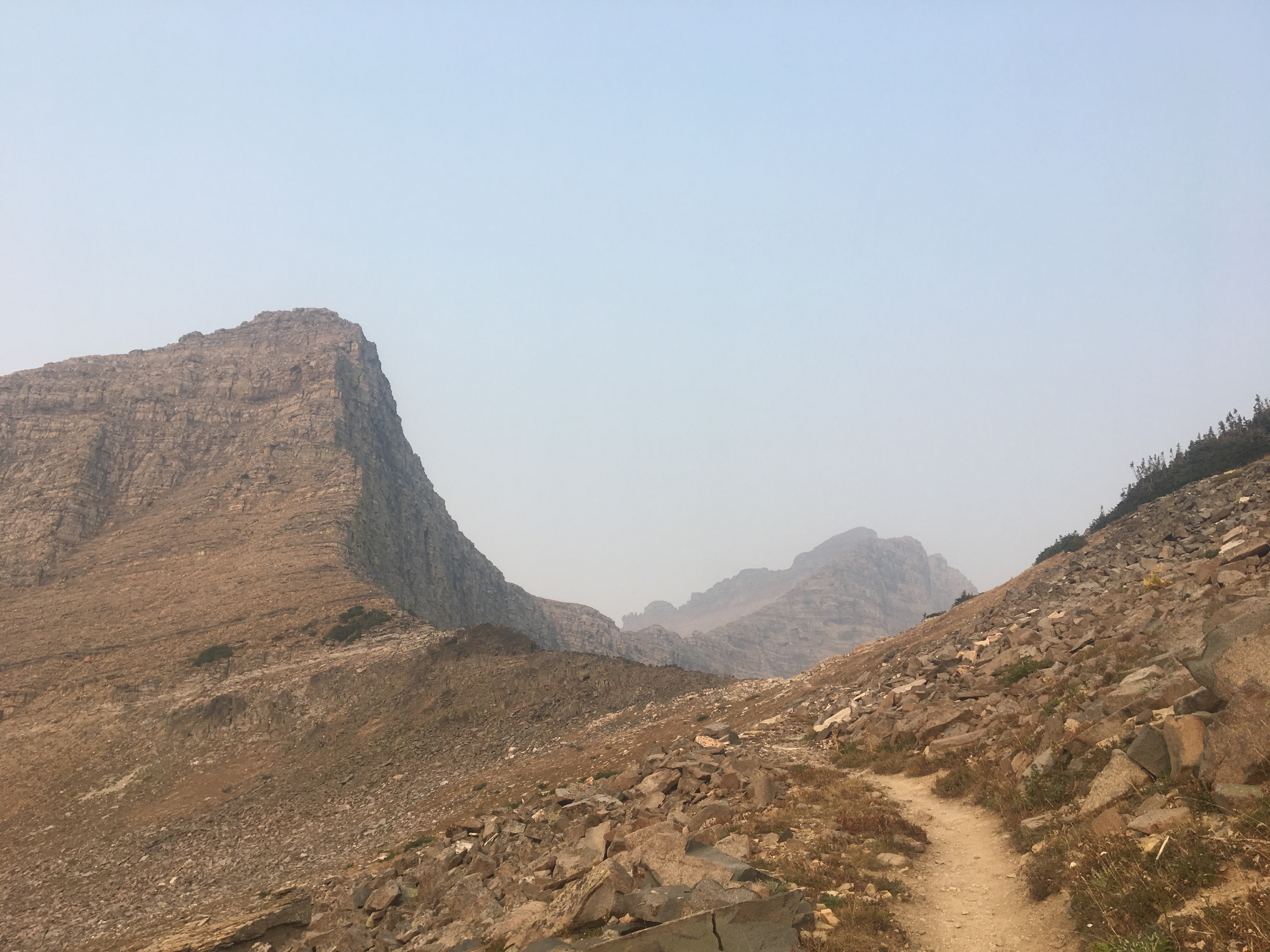 Before leaving Rising Sun we grabbed some sweet potato pancakes at the restaurant. It’s so tough to pass up a good meal when it’s close by. We had a short 14 mile day until the next campground so we weren’t in a hurry. Once on trail we climbed way up to Piegan Pass and the views were just awesome. I know I said yesterday that Triple Divide Pass might have been the most impressive pass I ever climbed but that title only stood for a day. Today the smoke had cleared some and we had some better views. It really was amazing. It was super windy on the way down but that probably helped get some of the smoke out of the area. We could see cascading waterfalls, aquamarine lakes, and jagged peaks all over. After we got down to the valley it was a relaxing 5 or 6 miles into Many Glacier, another front country campground with a store and restaurant. There’s lots of other thru hikers here tonight also. Garbelly and Critter, Maine Man, Flip Flop, Liam and Kate, Spindrift and James all are camping here and planning to finish tomorrow. A bunch of us went to supper tonight and it was a lot of fun. It’s weird, I felt like there weren’t many hikers around for most of the trail but I’ve seen lots throughout Montana and especially the last couple hundred miles. They say nothing brings people together like a common enemy, like the school kids rallying together against the lunch lady. In this case it’s the wildfires causing the thru hikers to bunch up right at the end.