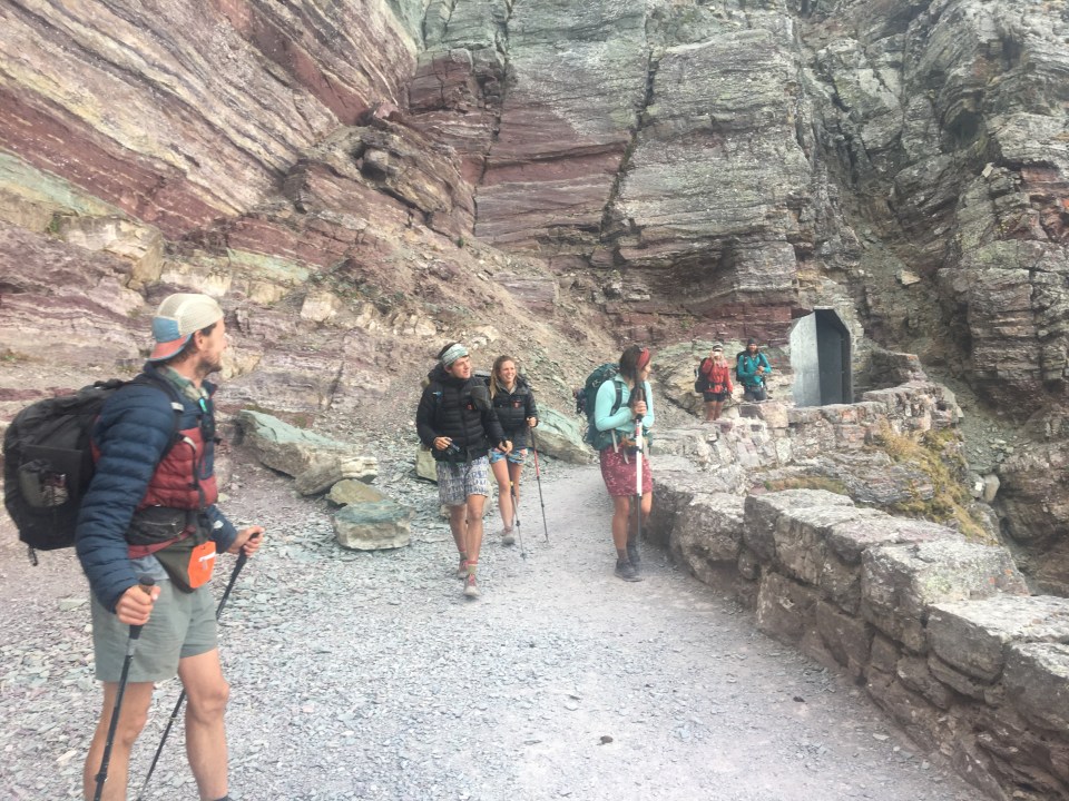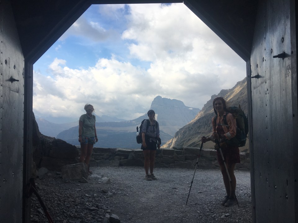 What a day! First of all last night was crazy windy, all night long blowing wicked loud. Even with my earplugs in I hardly slept and it seemed like everybody had the same problem. Even with minimal sleep everybody was still pretty jacked up for our last day. We set off with a big crew of hikers; Garbelly, Critter, Flip Flop, Liam and Kate. From Many Glacier we climbed up to Ptarmigan Pass that has a tunnel going 150 feet blasted through the Pass. It was awesome! We all chilled out up there for awhile enjoying the view, then went through to the other side and the trail down was absolutely spectacular! I can’t believe somebody decided to build a trail and this tunnel up here. We walked half a dozen more miles before coming across Dawn Mist Falls and took the little side trail to it. This was the last highlight of the trail and my last opportunity to jump into freezing cold water so of course I did. After the falls it was only 6 or 7 miles until the road and the border crossing at Chief Mountain. We crossed the border, did the damn thing, got our passports stamped, and took a bunch of pictures by the monument. From the border our friend had rides up to Calgary and QB and I hitched south. We got a fun ride from Ina, Karen, and Jules (an AT long distance hiker herself) back to East Glacier. There are lots of hikers in town and after pigging out at the restaurant we hung out with all them out front.