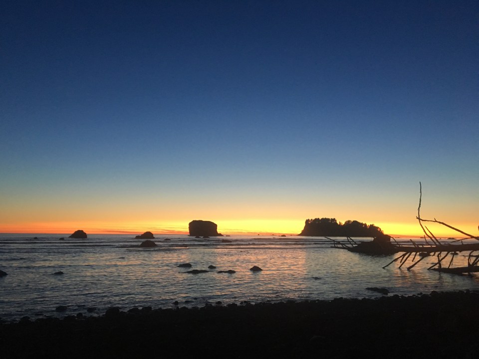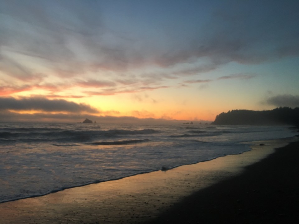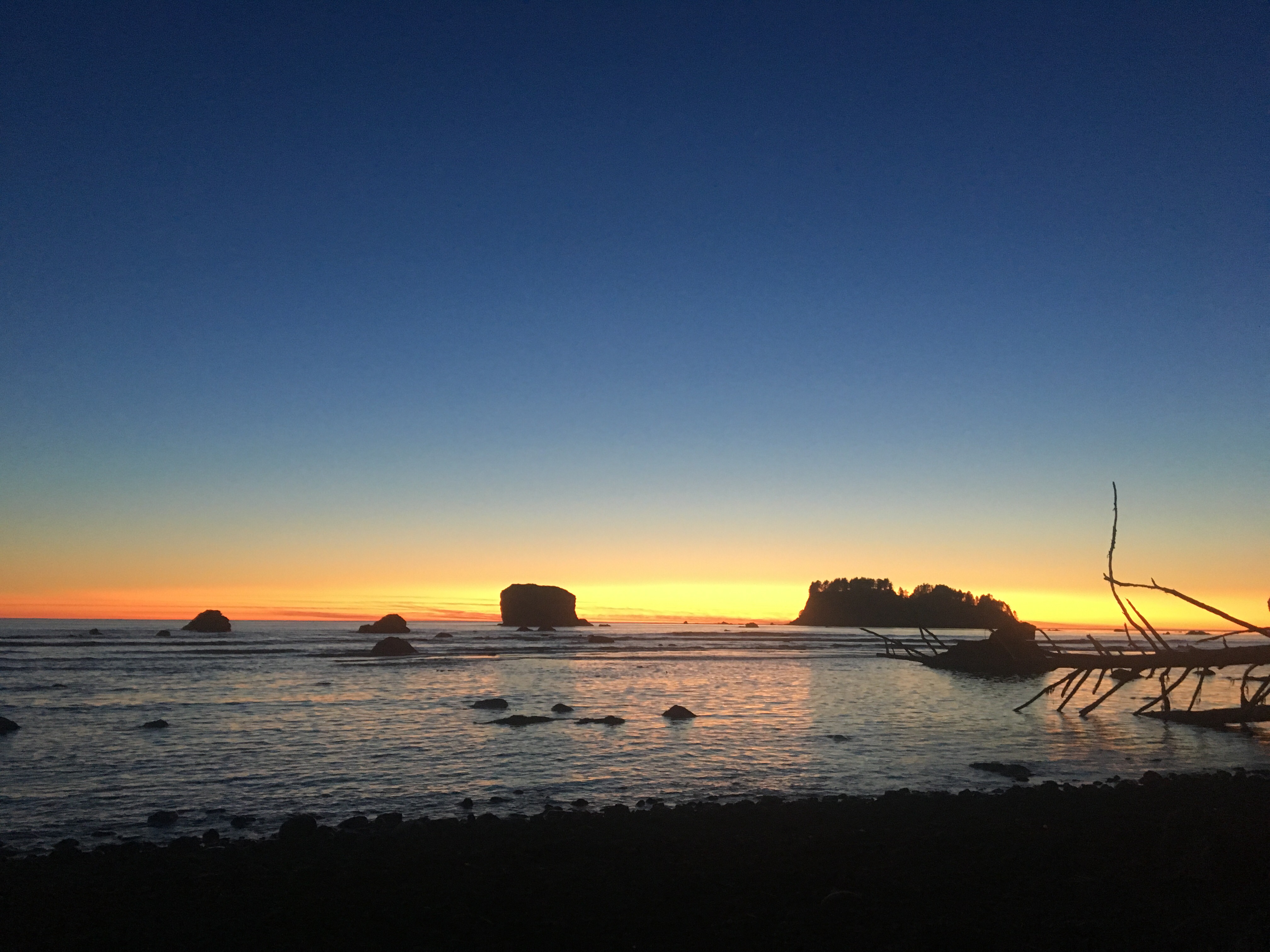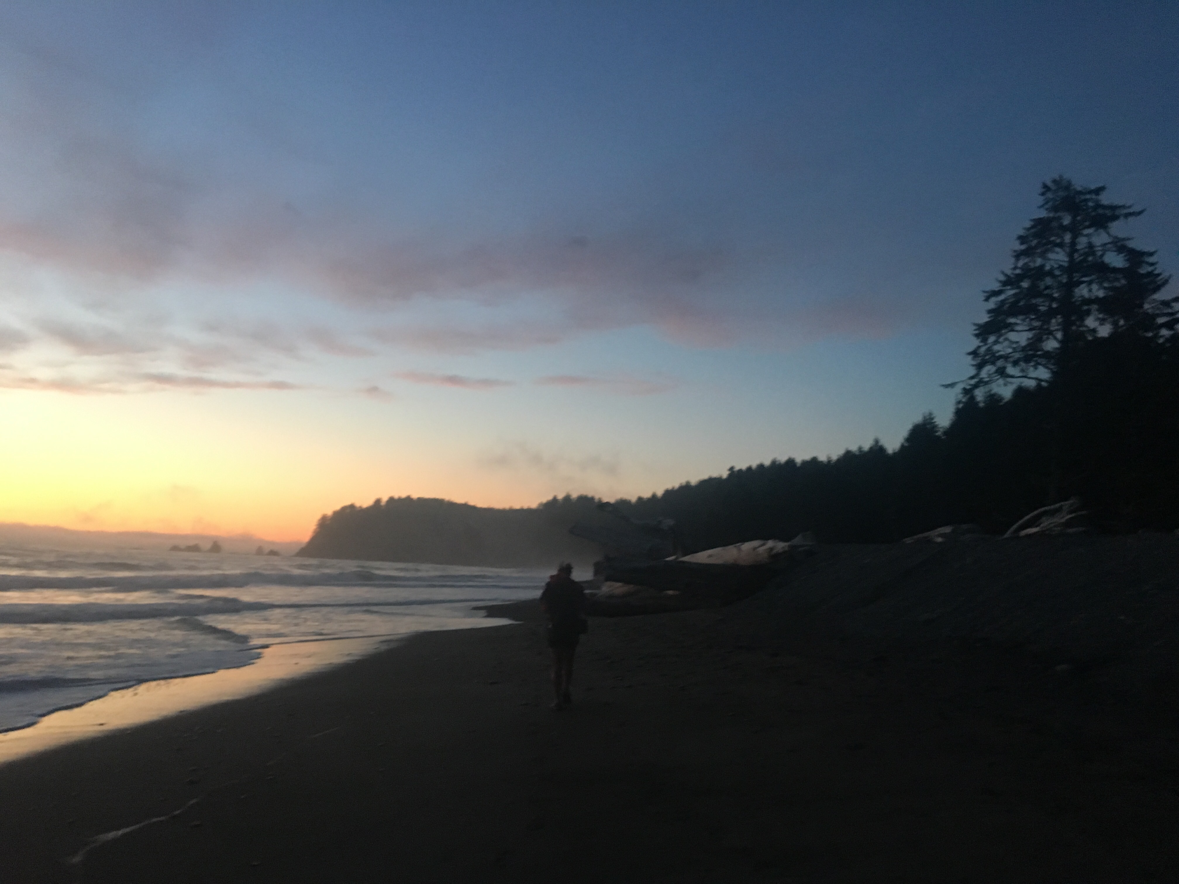 9/13 In the morning Malibu cooked a delicious breakfast casserole then dropped us off at the ferry terminal in downtown Seattle. We took the ferry over to Bainbridge Island then did a little walking before catching a hitch for about a dozen miles in a tiny Smart Car. Our next hitch was from Andy, a Seattle Firefighter, who makes a 2.5 hr commute from his home in Port Angeles. It was a great ride! He brought us exactly where we needed to go; the ranger station in PA. We got set up with permits for a couple nights on the Olympic Coast then resupplied, ate a late lunch, and started making our way towards Rialto Beach. A county bus drove us down some windy roads towards Forks for a couple hours before letting us out and we got a ride in the back of a pickup the rest of the way. We got to the beach right around sunset and walked a mile north on the coast before camping. It was awesome! Beautiful sunset and a very nice night camping in the woods just next to the beach.