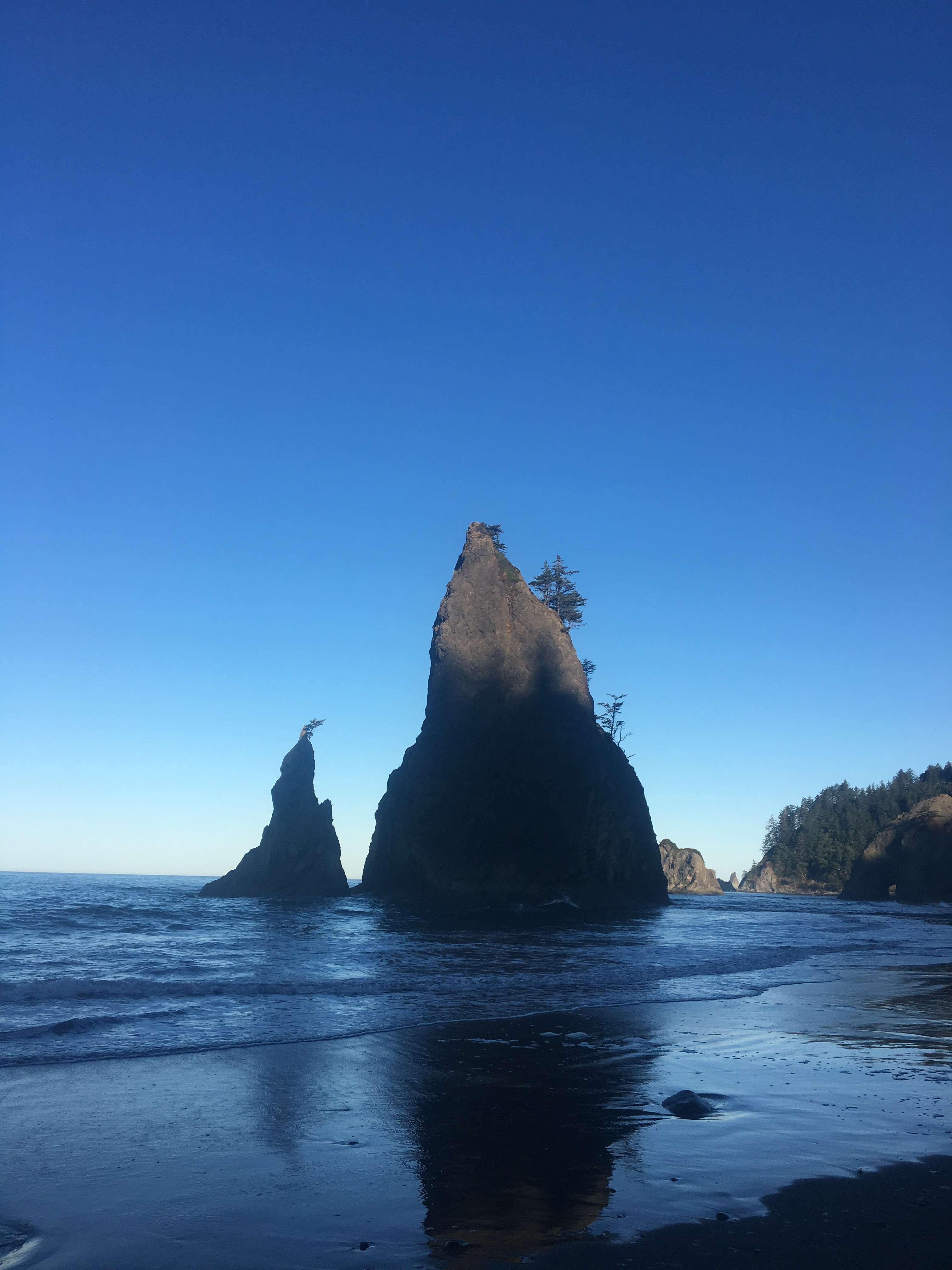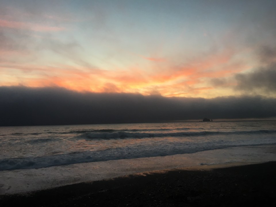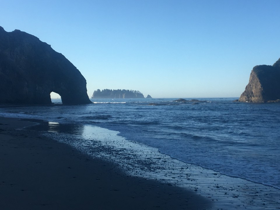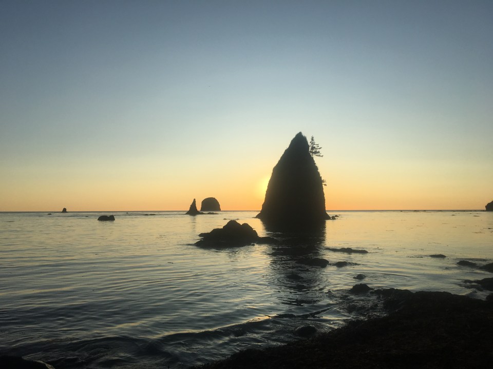 9/13 In the morning Malibu cooked a delicious breakfast casserole then dropped us off at the ferry terminal in downtown Seattle. We took the ferry over to Bainbridge Island then did a little walking before catching a hitch for about a dozen miles in a tiny Smart Car. Our next hitch was from Andy, a Seattle Firefighter, who makes a 2.5 hr commute from his home in Port Angeles. It was a great ride! He brought us exactly where we needed to go; the ranger station in PA. We got set up with permits for a couple nights on the Olympic Coast then resupplied, ate a late lunch, and started making our way towards Rialto Beach. A county bus drove us down some windy roads towards Forks for a couple hours before letting us out and we got a ride in the back of a pickup the rest of the way. We got to the beach right around sunset and walked a mile north on the coast before camping. It was awesome! Beautiful sunset and a very nice night camping in the woods just next to the beach.