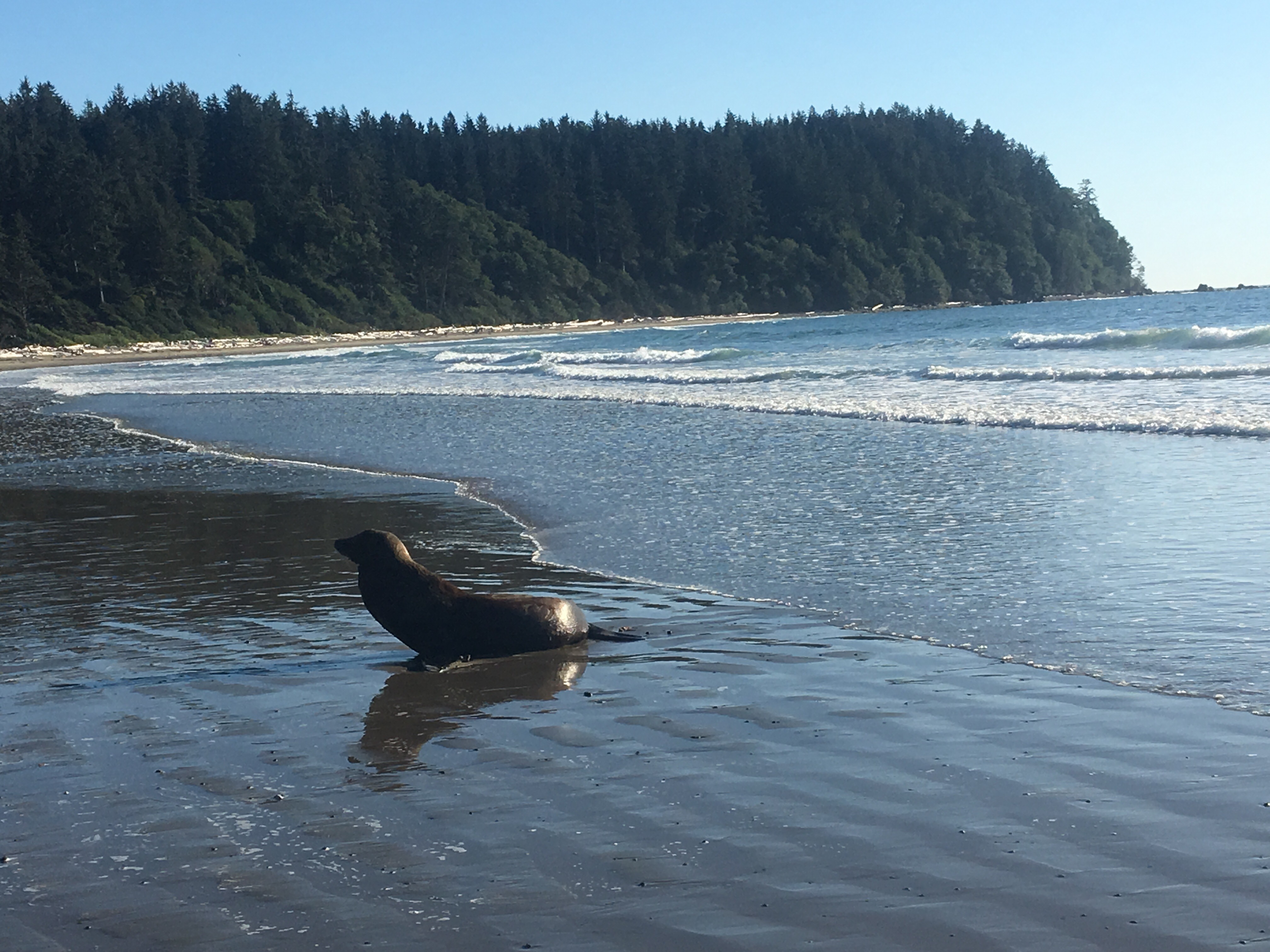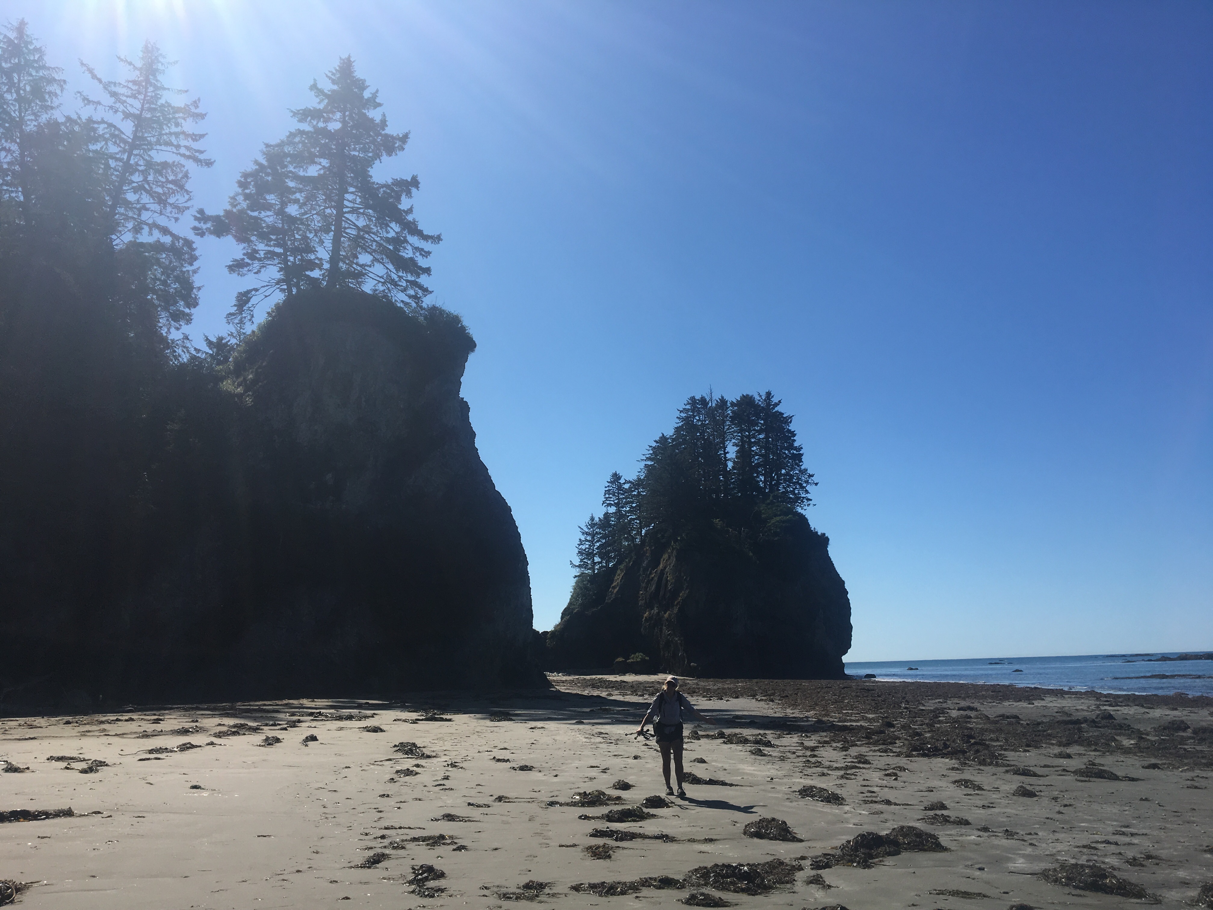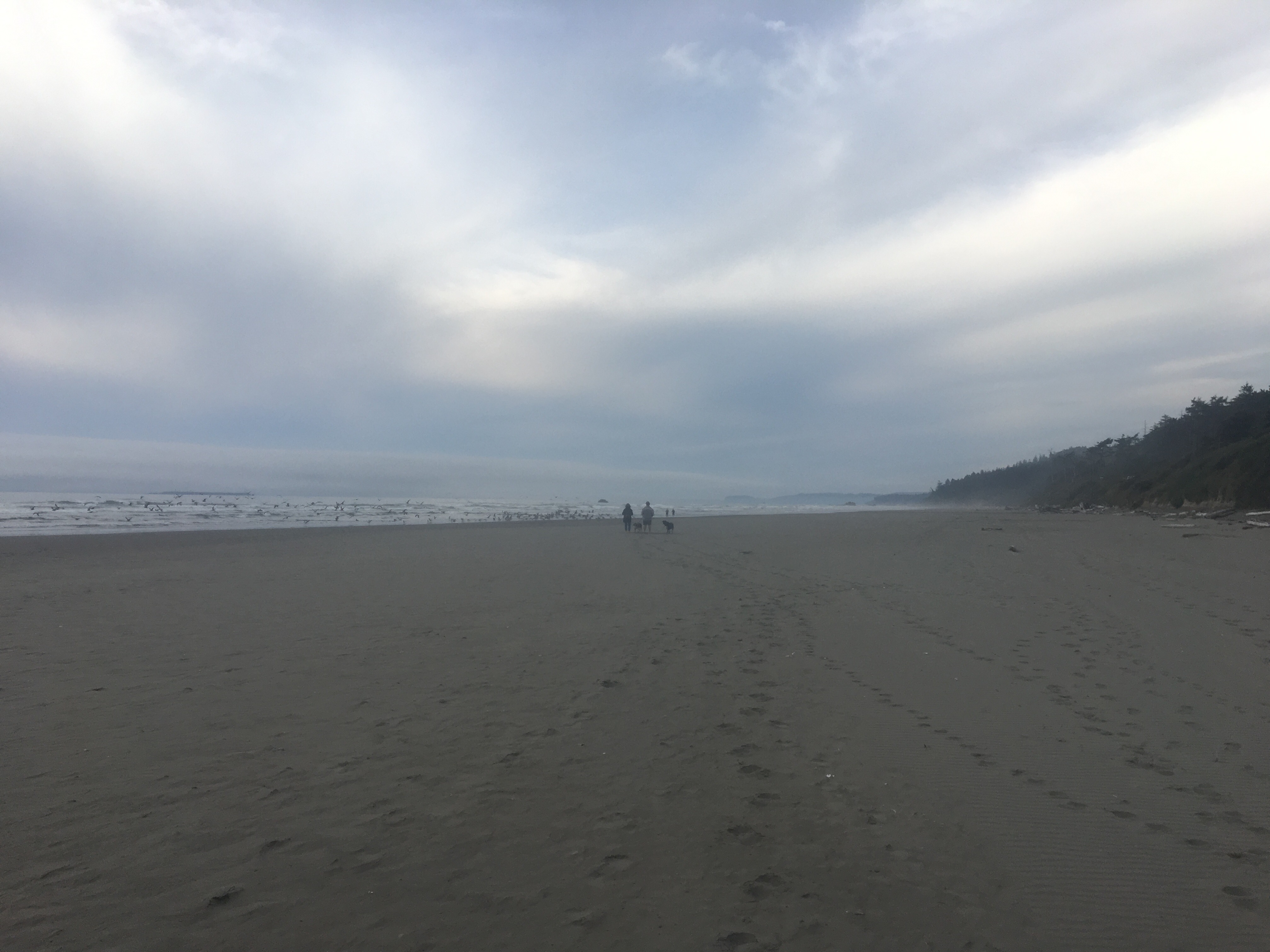9/15 From our campsite by the beach we walked about a mile north to Cape Alava, the westernmost point in the Continental U.S. We followed a trail inland for about 3 miles through a forest and came out at the Ozette Lake trailhead. The ranger in Port Angeles the other day told us this was a busy trailhead and we shouldn’t have trouble getting a ride out. Dude didn’t know what he was talking about. After 4 hours of relaxing by the roadside we got picked up by the 4th car that passed us. No big deal, there was a blackberry bush nearby that kept me busy and a huge bald eagle soared overhead. It was another firefighter that ended up driving us about 20 miles to the intersection with the busier rt 112. As we were getting dropped off, the bus to Forks was pulling up. Perfect timing! During the 40 minute ride to Forks we picked up a hiker and immediately I thought he looked familiar. It was Funjumper, I met him in Belden, CA in ’15. He didn’t remember me and may have even doubted that I remembered him until I recalled that he was from Quebec. Anyway he just finished the Pacific Northwest Trail that goes 1200 miles starting in Glacier and ending out here on the coast. When we got into Forks the town was bumping with Twilight fans, they were having some kind of festival for the book series. QB and I got some Chinese food then resupplied at a supermarket before putting our thumbs out to get out of town. After a couple minutes, Stephanie picked us up and drove us about 40 minutes down the coast. As we were driving by the ocean we saw a bunch of cars pulled over and looking out towards the water. From her car we could see whales breaching and raising their fins out of the water. Stephanie pulled over and the 3 of us walked down to the beach to get a better look. We saw a bunch of what we learned were grey whales close to shore and what they were doing was scraping barnacles off their backs on the ground. So cool! I guess it’s very rare. QB and I got a ride a little ways further to Kalaloch CG which was full but luckily had a hiker walk-in site.