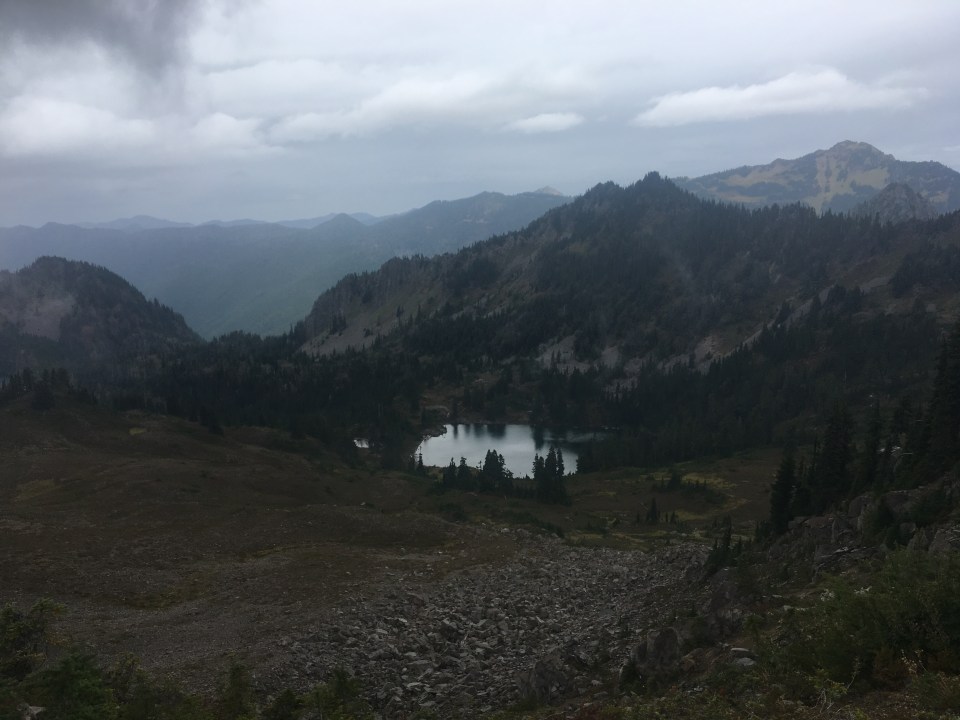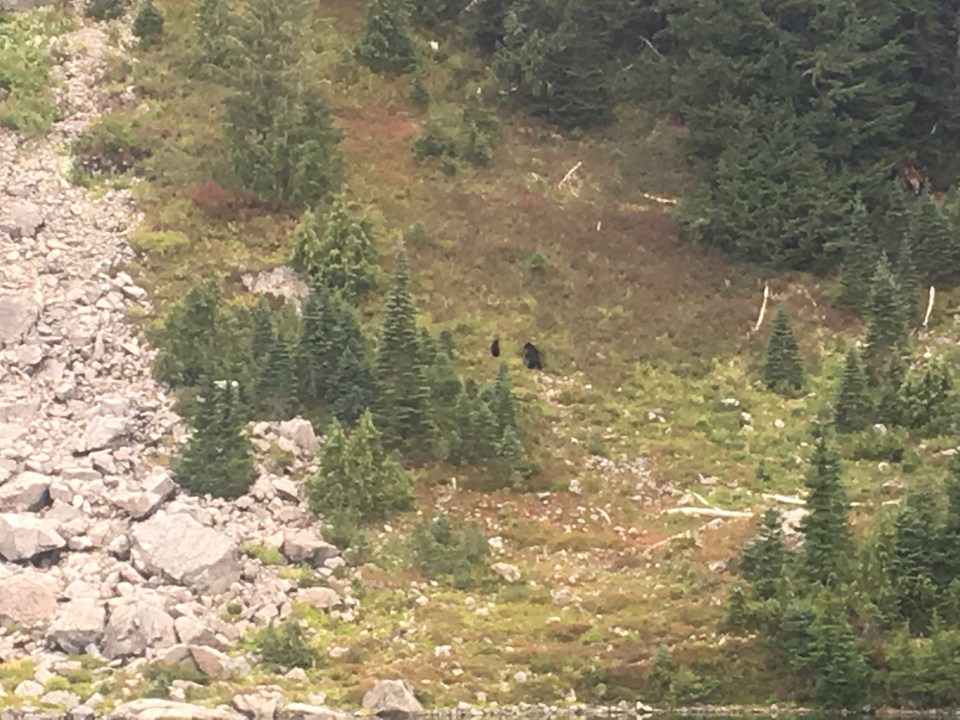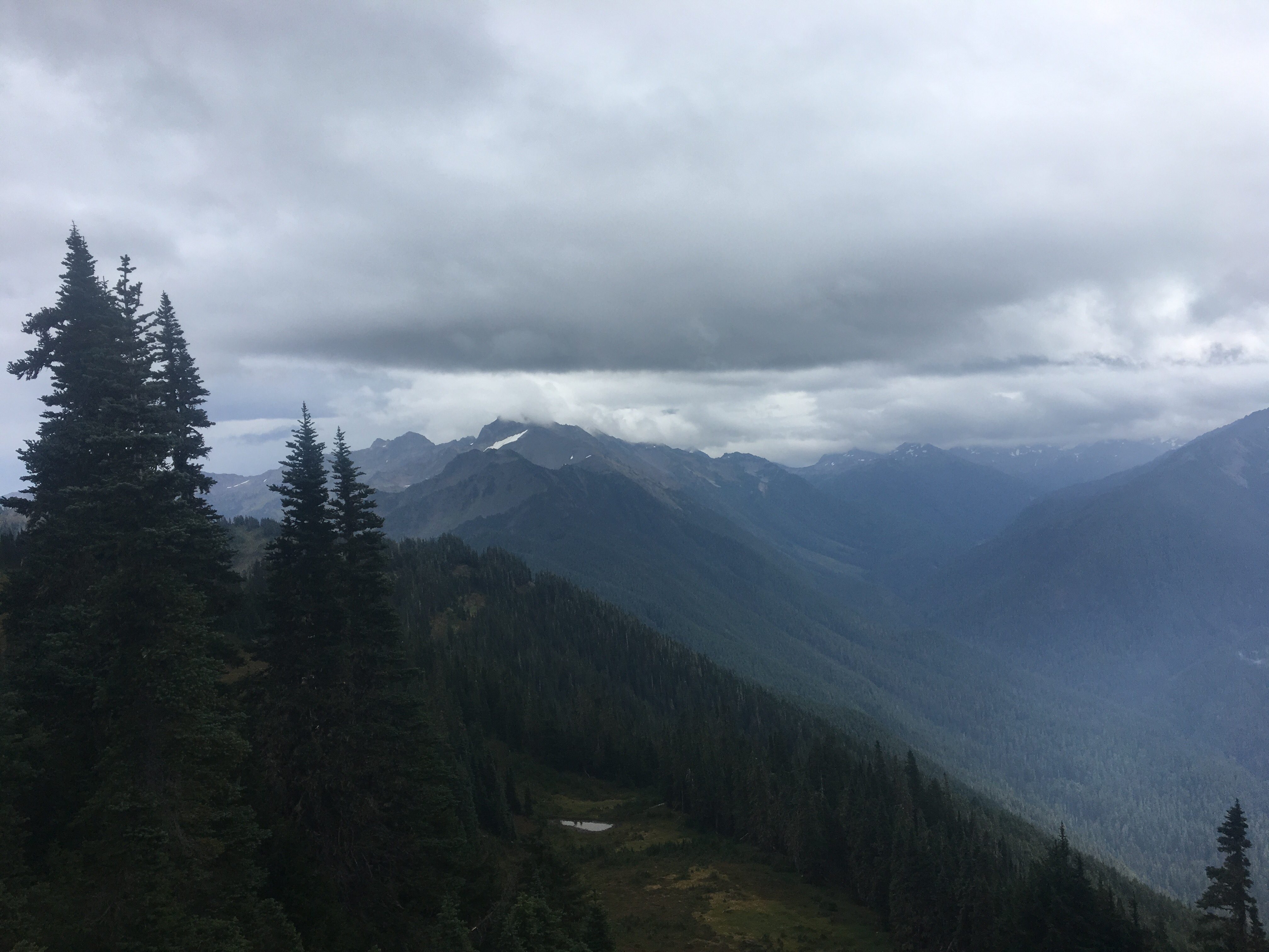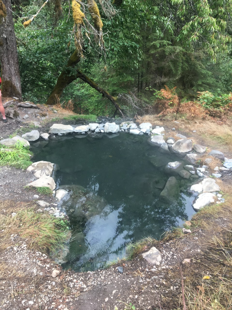 9/17 This morning we blasted up a long 7 mile climb to the High Divide. The weather was cool and cloudy until we got to the top and it got a bit more rainy and the clouds were moving in. Even with the weather we still had some great views of Mt Olympus and the Olympic range. There is some seriously beefy mountains over here. We hiked through 7 lakes basin and down to a beautiful lush green forest with giant trees. Oh and I saw 10 black bears today! All from a distance but they were everywhere. From the forest we had another stiff climb up to Appleton Pass and up there it started to rain a little harder and get colder. I knew I had hot springs waiting for me at the end of the day but the last 5 miles down from the pass were cold and wet. Not my favorite weather. At the Boulder Creek campsite we met and ate supper with Dustbunny and Tickled Pink, who are about a hundred miles from finishing their thruhike of the PNT. It was fun to hear about their hike and that trail and since they’ve also hiked the CDT and PCT we knew some of the same people. After we got set up and ate we walked down to the Olympic Hot Springs. Finally I could warm up. These springs were awesome! There’s like 7 or 8 rock pools that are built up around natural springs and most are pretty hot. After a cold rainy day this is exactly what I needed.