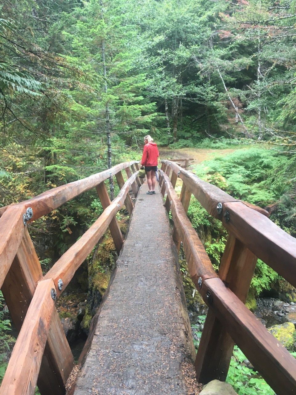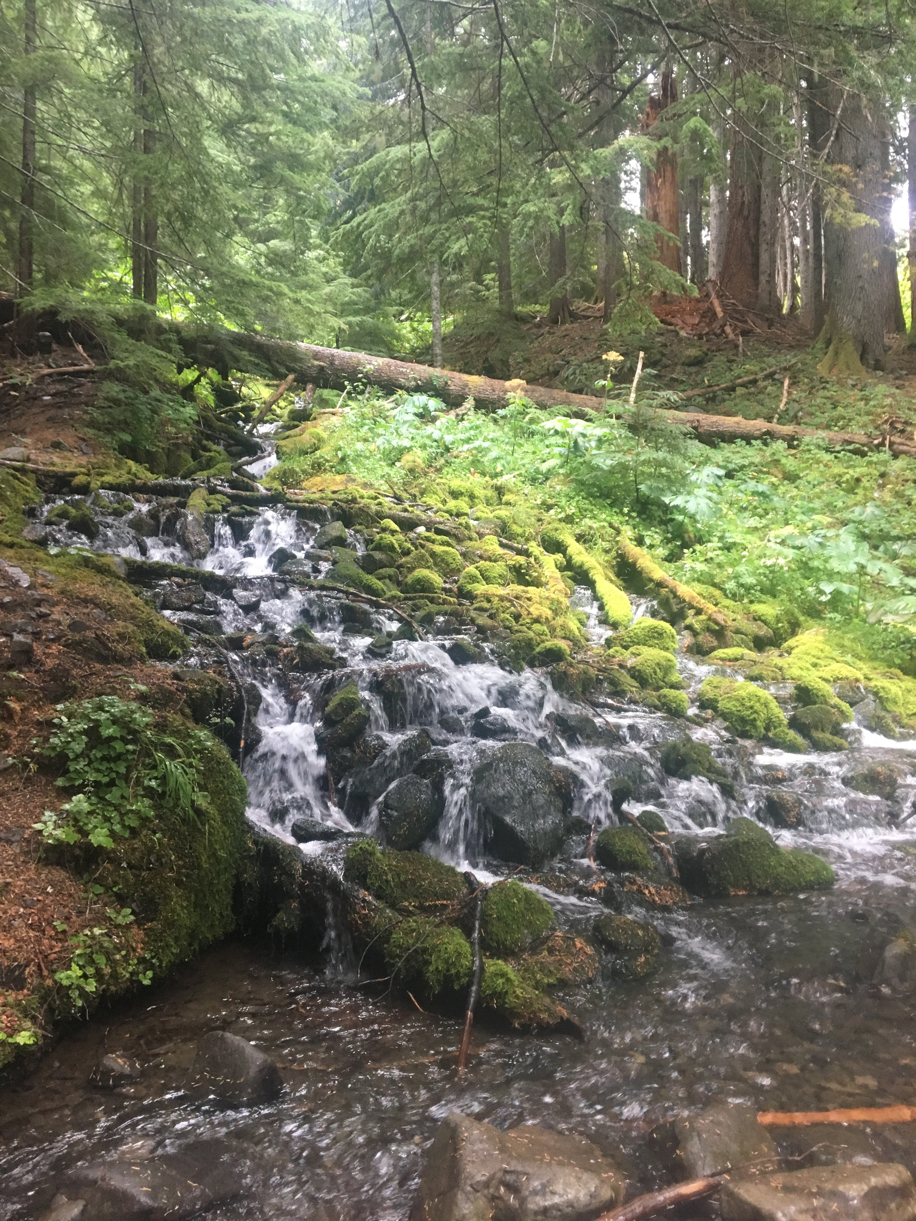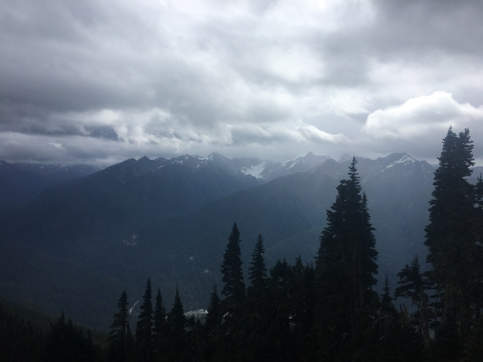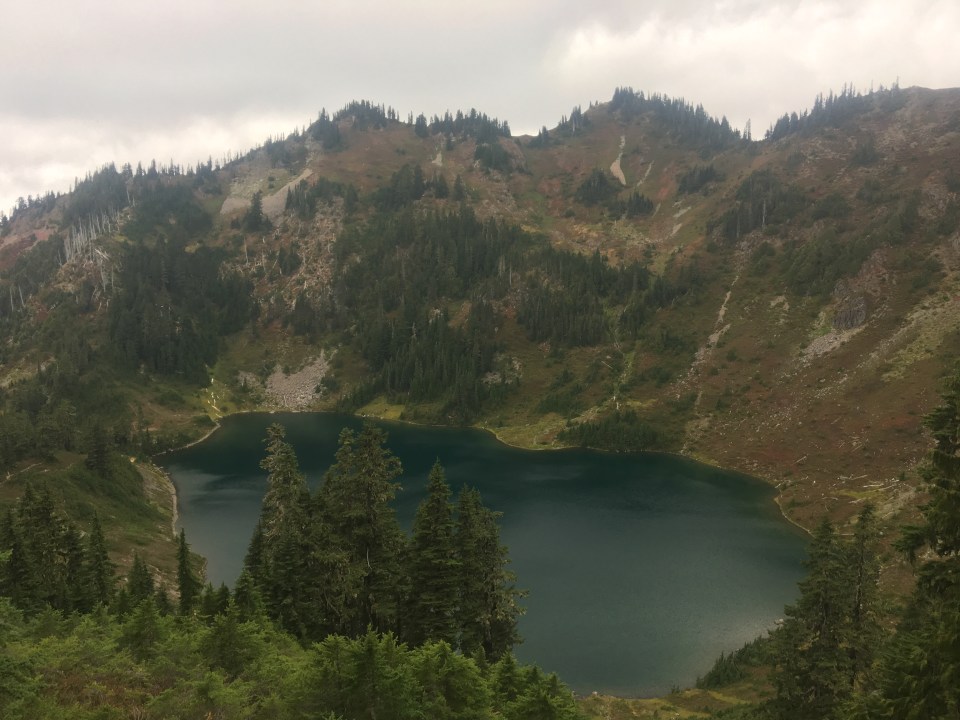 9/17 This morning we blasted up a long 7 mile climb to the High Divide. The weather was cool and cloudy until we got to the top and it got a bit more rainy and the clouds were moving in. Even with the weather we still had some great views of Mt Olympus and the Olympic range. There is some seriously beefy mountains over here. We hiked through 7 lakes basin and down to a beautiful lush green forest with giant trees. Oh and I saw 10 black bears today! All from a distance but they were everywhere. From the forest we had another stiff climb up to Appleton Pass and up there it started to rain a little harder and get colder. I knew I had hot springs waiting for me at the end of the day but the last 5 miles down from the pass were cold and wet. Not my favorite weather. At the Boulder Creek campsite we met and ate supper with Dustbunny and Tickled Pink, who are about a hundred miles from finishing their thruhike of the PNT. It was fun to hear about their hike and that trail and since they’ve also hiked the CDT and PCT we knew some of the same people. After we got set up and ate we walked down to the Olympic Hot Springs. Finally I could warm up. These springs were awesome! There’s like 7 or 8 rock pools that are built up around natural springs and most are pretty hot. After a cold rainy day this is exactly what I needed.