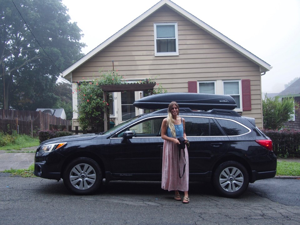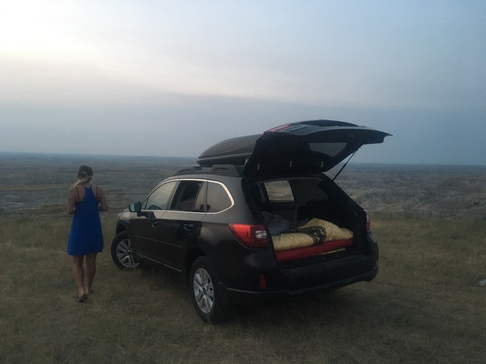 My co pilot and I are in a Subaru Outback that I kind of converted into an adventure vehicle. In the back we’ve got a 3 inch think memory foam mattress topper that I cut to fit around the wheel wells, added a sheet and blanket and just like that I’ve got a rolling bedroom. We installed curtains for privacy and a roof rack cargo carrier for our extra gear.