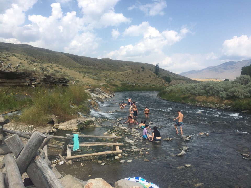We weren’t far from the Montana border thus morning and we were soon driving West down I-90 through the Big Sky State. It rained a lot while driving which was good because it cleaned a lot of the bugs off the windshield but it would be nice if this rain made it out west to take care of the wildfires. Around lunchtime we realized we were only about an hour from the northern entrance to Yellowstone NP and there were some hot springs just a couple miles into the park. It was a rad little detour. 2 miles or so into the park is a little unadvertised parking lot and a short .5 mile walk from there are the springs. The Boiling River flows into the Gardner River and creates an area in the river perfect for soaking. It’s a strange phenomenon, even as hot springs go, while you sit there half of your body can be wicked hot while the other half is wicked cold. Just gotta find that happy medium.