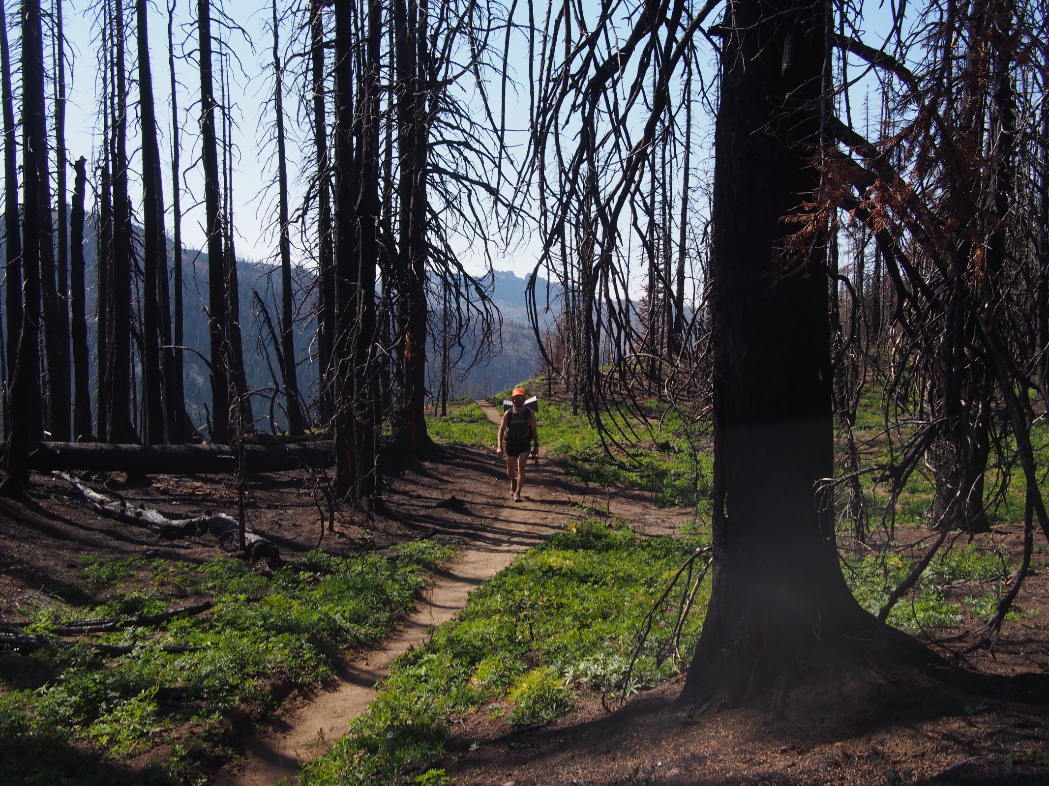 Besides hiking a Pemi Loop in NH about a month ago, this was the first 30+ mile day either of us had done since Arizona in the spring. And it felt so easy! Most of the day was just smooth rolling trail, through forest, then a burned out forest, up on ridges, and contouring along the sides of mountains. There’s elevation gain and loss and all that but it never felt too severe.