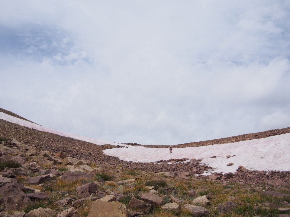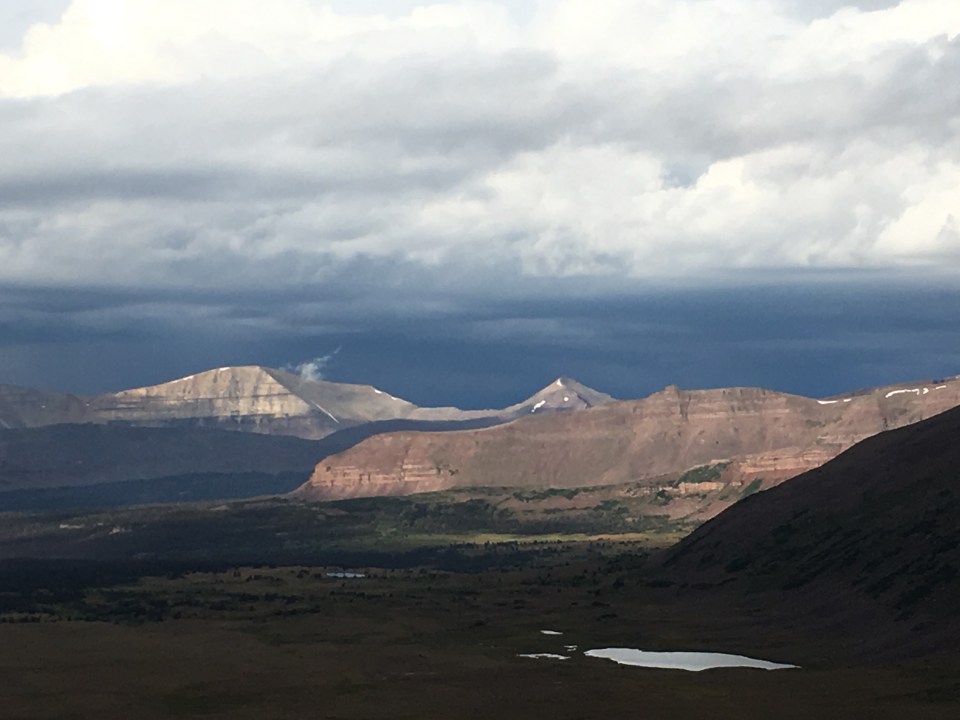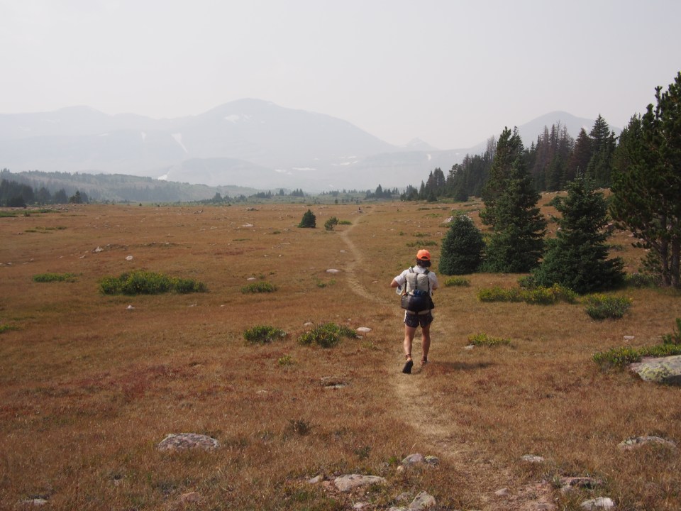 From North Pole Pass we dropped into a pretty forested valley that we were able to cruise through for most of the day. After lunch we noticed the air was starting to get hazy and I got a whiff of smoke. Dang wildfires! It would have been a beautiful day had it not been for the smoke, and now it was hard to tell if we had blue skies or clouds rolling in. We got to the base of Anderson Pass and the air quality hadn’t improved but we climbed up anyway. This was about a 3 mile climb that gained roughly 1500 feet bringing us to the highest point of the trail, 12,700 feet. At the top of the pass we had the option of climbing up steep talus to our left for another 500 vertical feet to the summit of King’s Peak, the highest point in the state of Utah. This would have been nice but the smoke really hampered visibility and it looked as if the summit was about to be socked in with clouds. Plus it was around 4:30 and bad form to summit so late in the day, right? We’ll have to come back and climb this one, the state high points aren’t all that important to me.