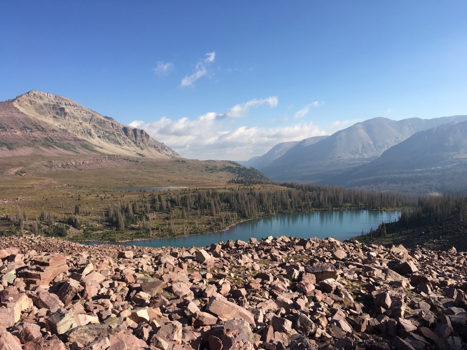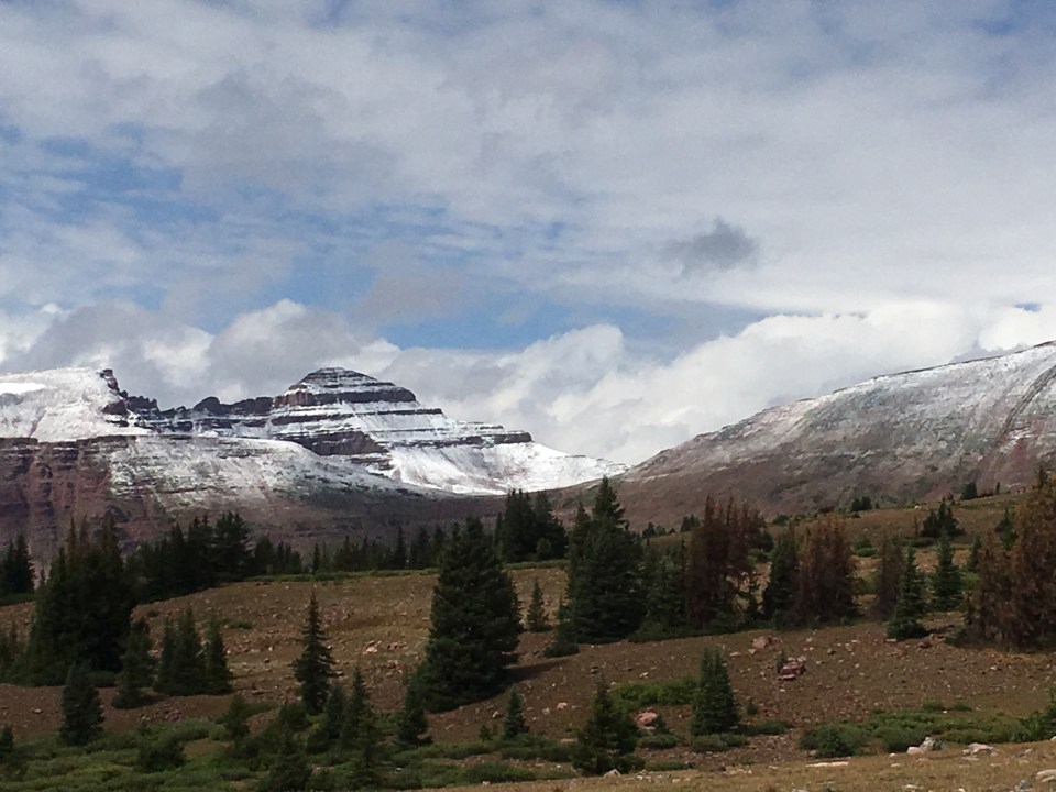 From our spot by the lake we got up and going by sunrise and steadily climbed for a few miles to the top of North Pole Pass at 12,200 feet. This was a nice beefy pass with comfortable graded rocky trail switchbacking nicely to the top. Once we crested the pass we crossed into High Uintas Wilderness (not sure what wilderness we had been in before this). We could now see some beefier peaks in the distance.