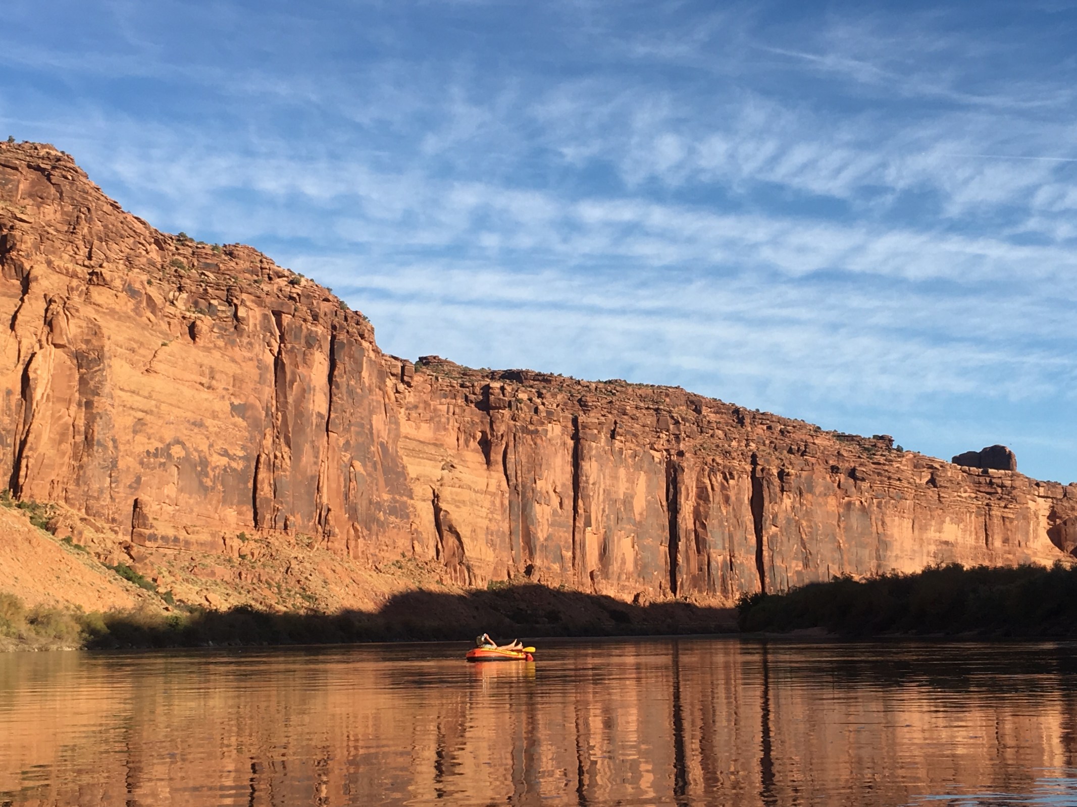 Besides being a little nervous I would sink the rest of the day, paddling the river was awesome! With a gentle current we moved about 2 mph and had spectacular views of big red rock walls the rest of the day. From the boat we could see petroglyphs and mountain climbers on the walls. Because the road parallels the river for the first 15 miles of our trip people have access to the river and the canyon that it’s in. Around the time it was starting to get dark we got to an island across the river from a campground and set up for the night. 10 miles done, we just might make it in these things.
