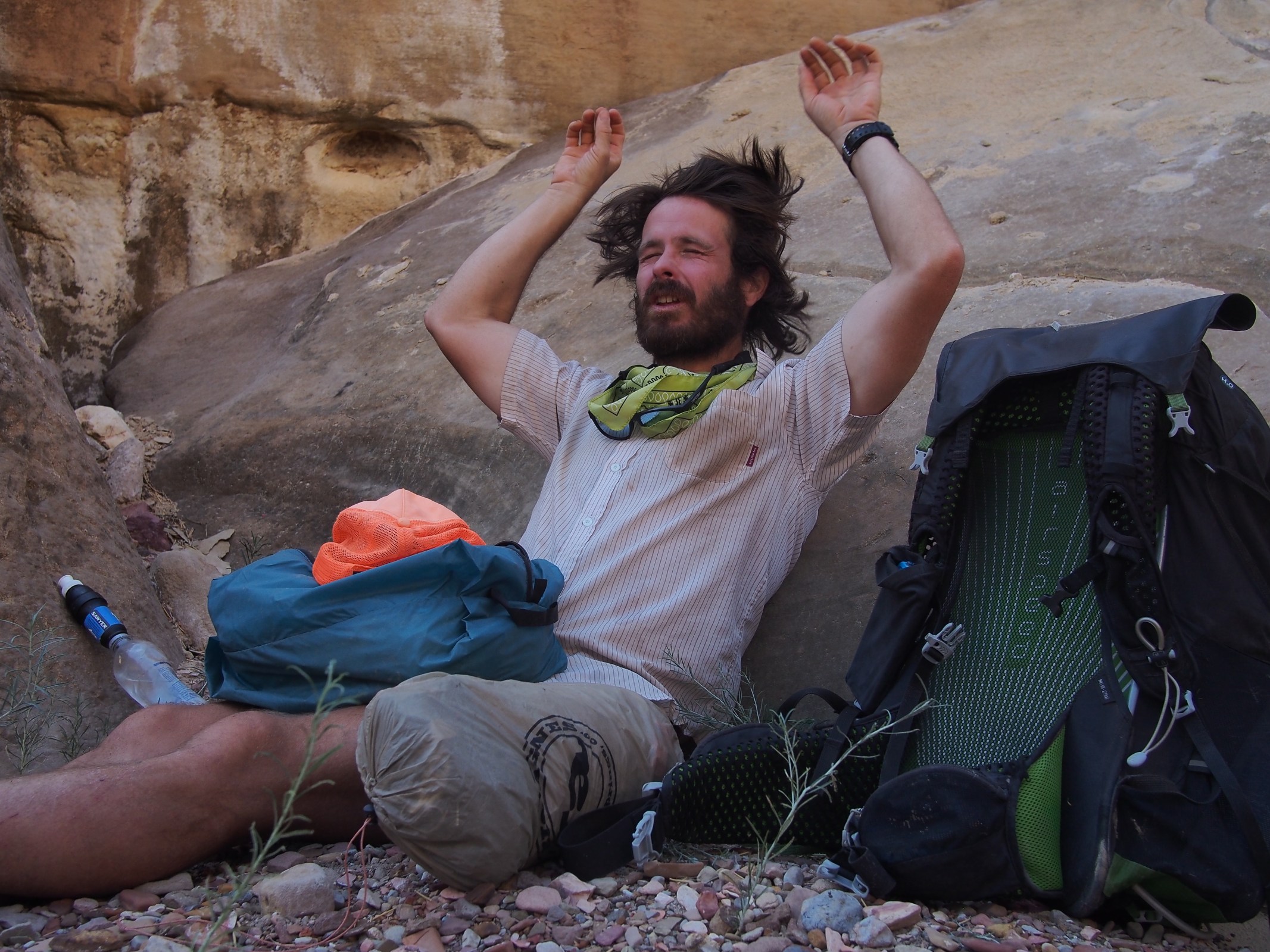 With heavy packs we walked cross country following cow paths until descending into Monday Canyon. For the next 7 miles we walked slowly through this canyon choked with boulders and trees. It was tedious and very slow going. There were lots of pour offs that were too steep to just jump down so we had to maneuver around them and navigate lots of boulders. There may have been a way around all this but we didn’t find it. Eventually the sun started to set so we found a flat spot and set up for the night. I think there’ll be more boulder choked canyon hiking for the morning.