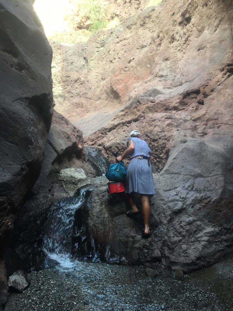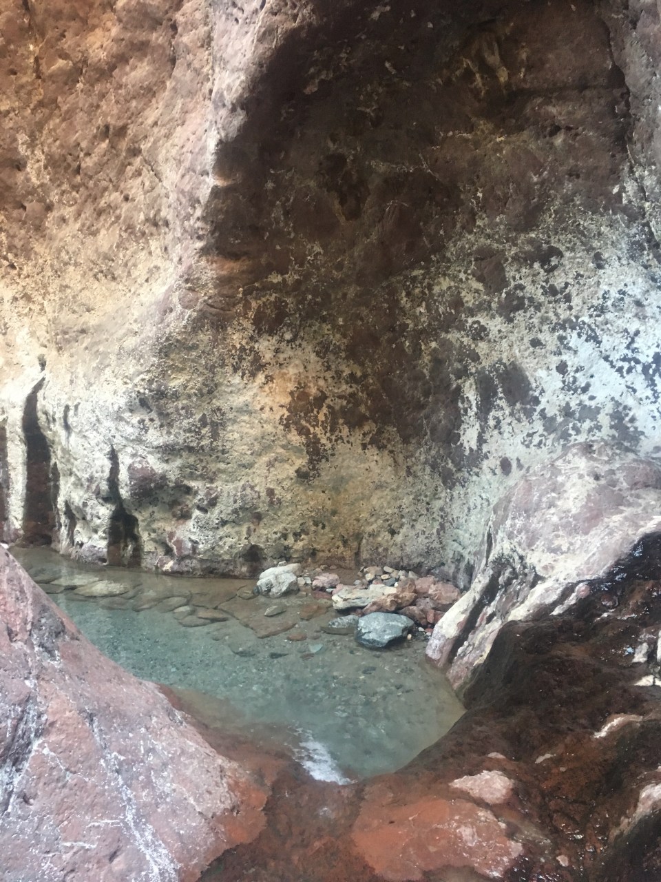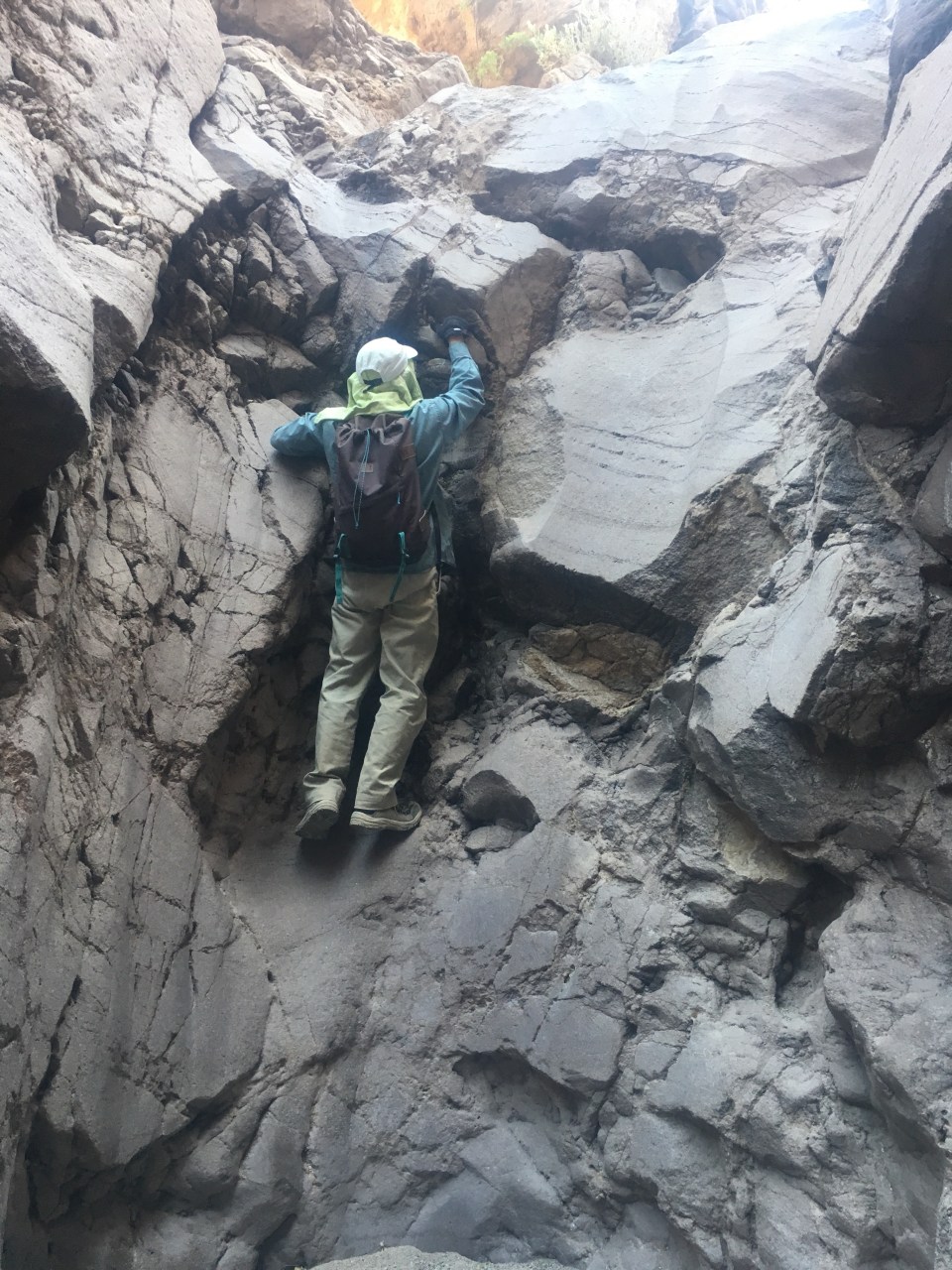 In the first few miles today we dropped almost 2000 feet and soon were at Deer Creek. This was our first reliable water source in 54 miles(the longest water carry I can ever remember doing). We followed Deer Creek as it flows about another mile to the Colorado River. During this mile it cuts deep into the rock creating a super narrow canyon that we walked above on an incredibly narrow ledge and then turns into a tall waterfall that pours into a pool just before the river. It is quite spectacular! Of course I took a quick bath at the base of the falls.