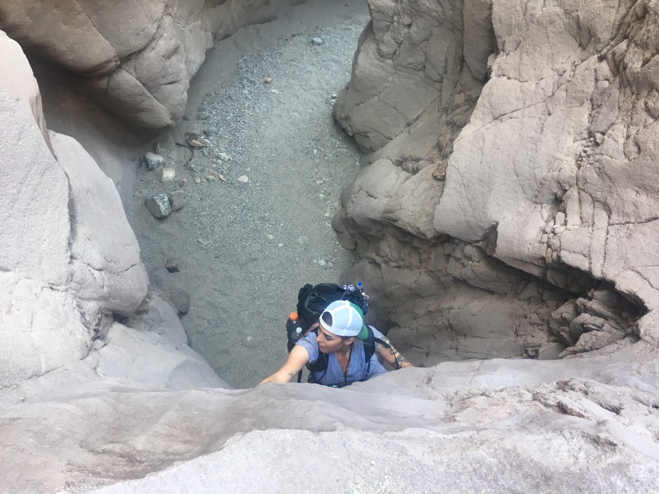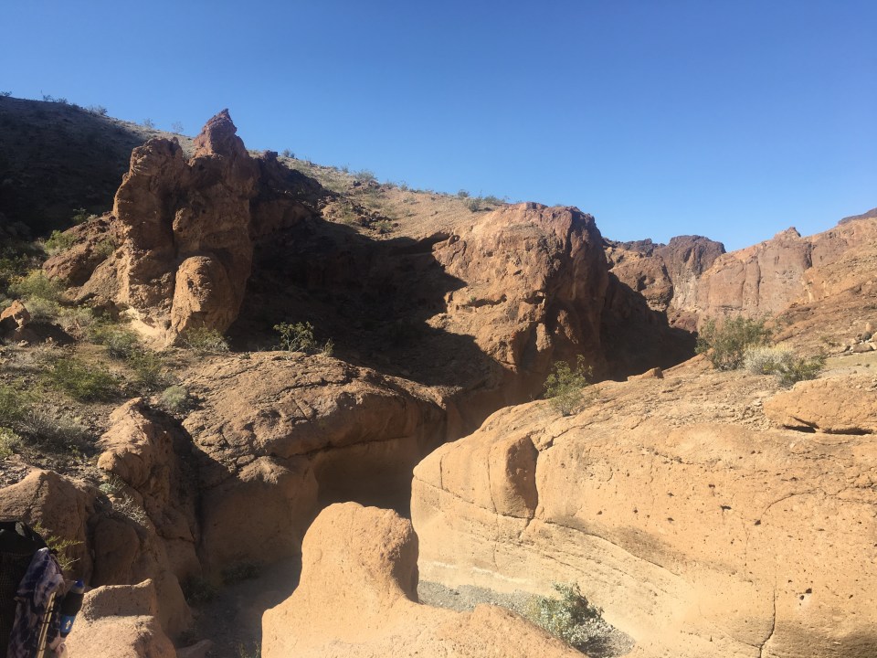 Around 2pm we came to a 4 way canyon intersection. Kanab Creek continued on straight, Lawson Canyon went to the right and Hack Canyon which was our turn went left. Because Kanab Creek had been so bendy going left felt just like another bend in the canyon. This is a confusing and possibly dangerous intersection. We have GPS and knew which way to go but when we got to the intersection there was about a dozen college kids looking for their friend. They were out doing a 2 week adventure course with their school and somehow one member of their party had got ahead, or behind, or went left or right. Nobody had seen him in over 2 hours. He had food, shelter, and water(although there weren’t any water sources nearby) but he didn’t have a map or a phone or GPS. We started down Hack Canyon and told them we’d send him back to the intersection if we came across him. Their plan was to head down Lawson Canyon and I figured he just carried on straight up Kanab Creek and would eventually turn back. Hack Canyon was a dry rocky wash that occasionally had animal paths on either side of it. We were now way more out in the open in the desert and without the canyon walls for shade, the sun was hot. I had forgot all about the missing hiker until an hour and a half later when QB pointed out a big beefy backpack on the side of the wash. It gave me the chills. This was a panic move and who knows where or how far he could have gone. His water bottles were empty so I filled those, and wrote him a note, while QB drew an arrow with rocks. We were at the backpack for about 20 minutes when the hiker came running back towards us. He had dropped the pack because it was so heavy and gone onto look for his friends or water even climbing to a higher vantage point to look for them. Luckily, 2 miles north of where he dropped the pack he came to a road where some cowboys had a camp set up. They gave him water and told him they’d drive him into town so he went back for his pack and that’s where he found us. It was getting on in the day and his headlamp was on it’s last legs plus he had just gone through a hell of an ordeal so QB and I decided to get him back to his crew. She walked with our new friend while I ran ahead and after about a mile ran into a 3 man search party that had been walking up Hack Canyon. Soon they were all reunited and QB and I turned back to carry on our way. When we got to the cowboys we delivered the message that the hiker wouldn’t need the ride after all and these guys hooked us up with some ice cold cokes! They were out here taking tourists on a cattle drive similar to City Slickers. I can only imagine how far the missing hiker would have gone if he didn’t see these guys. At this point the wash had turned to a jeep road so QB and I walked another hour until finding a spot to camp for the night.