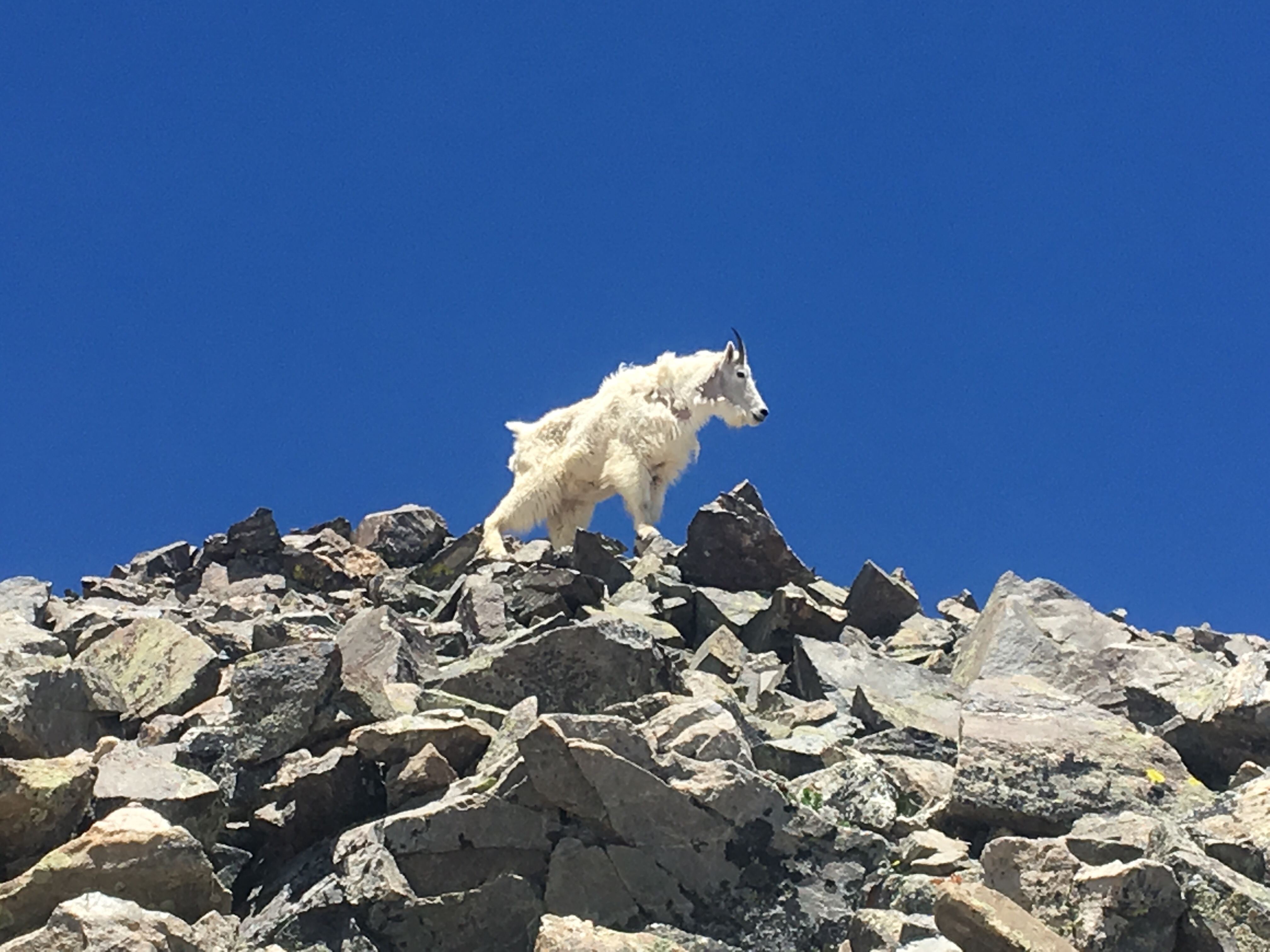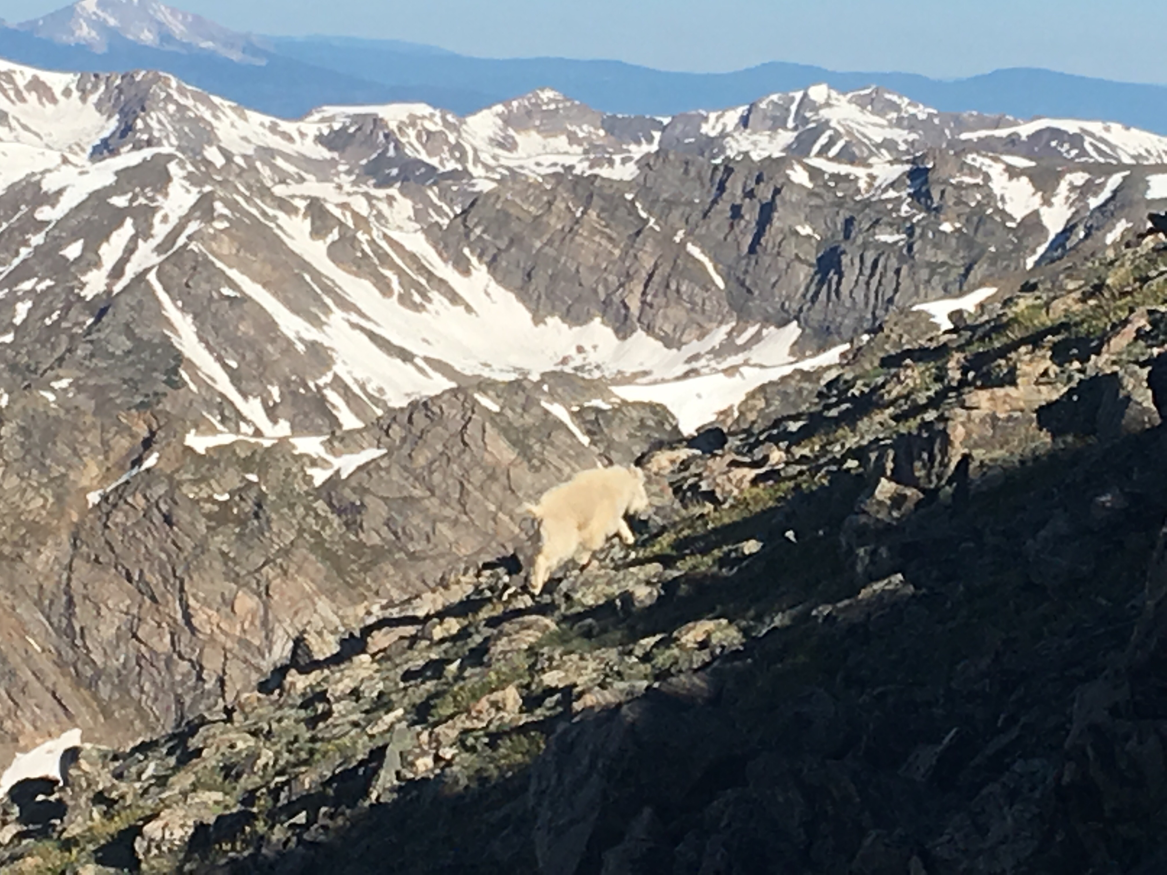 All day we were up high above tree line and over 12,000 feet. We saw about 15 southbound CT hikers as well as 7 bike packers as the CT is one of the few long distance trails that allows bikes. It was a good day for animals too. Besides the moose and elk we saw this morning, I saw a weasel(a week ago I saw one of these and mistakenly referred to it as a pine marten), a peregrine falcon, 2 more bull moose and 2 coyotes separately, plus a herd of hundreds of domestic sheep in the distance.