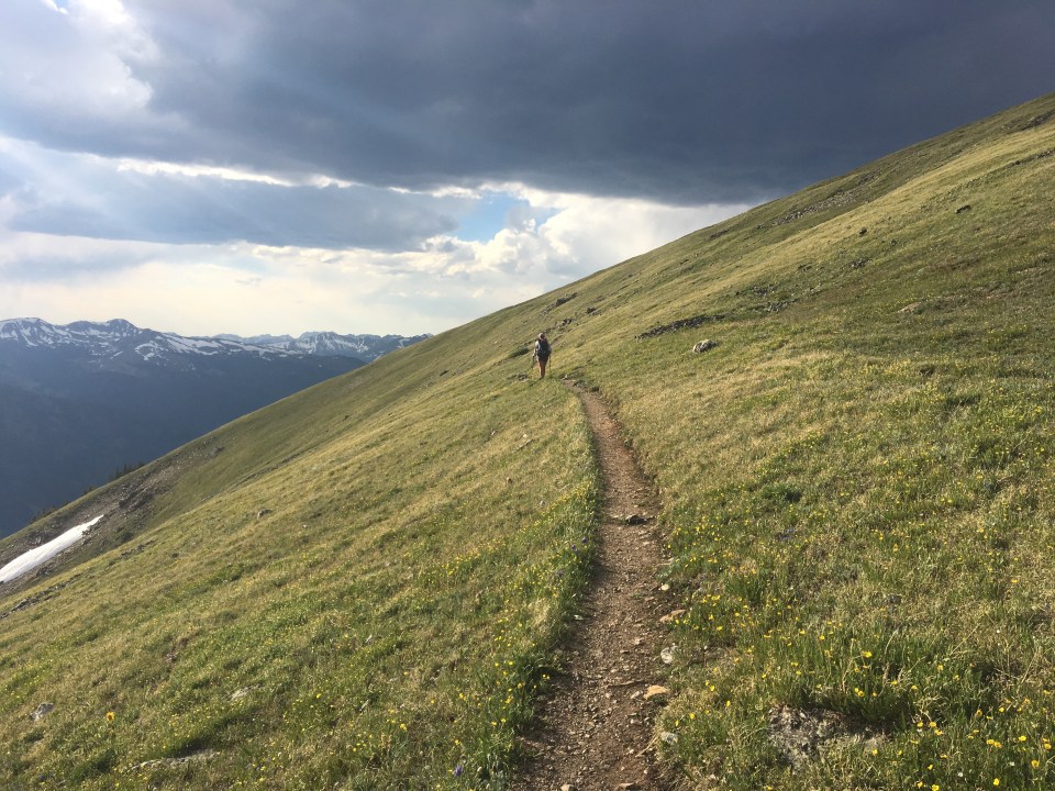 Besides the pinnacle of the day the rest of the hiking was really good. We seemed to have some big climbs or maybe they felt that way since we’re up over 12,000 feet and we somehow dodged significant rain and thunderstorms all day. In the evening we saw in the distance the biggest herd of elk I’ve ever seen. A conservative guess would be 120 elk but probably more like 150(the number grows every time we talk about them). We’re camping at Squaw Pass tonight which feels more like a valley and we all had nice fat bags of Mac n’ Cheese.