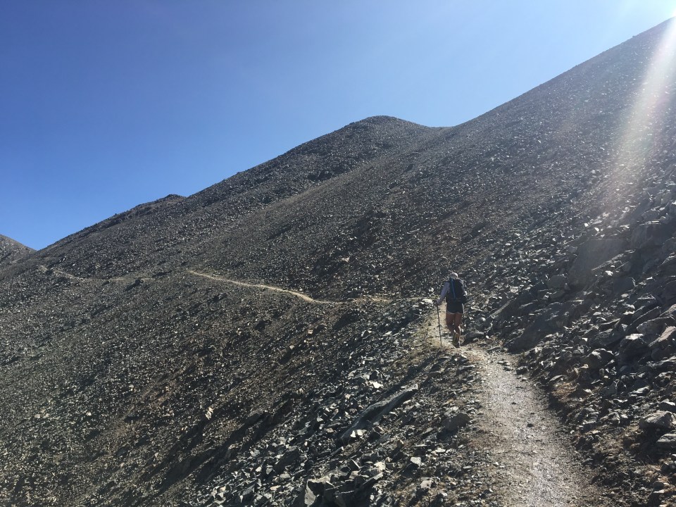 First thing this morning we started climbing up a pass to the right of which was the Rio Grande Pyramid, a 13,900 foot peak shaped like a Mayan Pyramid. There’s a long wall on the left shoulder of the mountain and in one spot a massive chunk of the wall is missing creating a big window. We went off trail and climbed up to that, it was awesome.