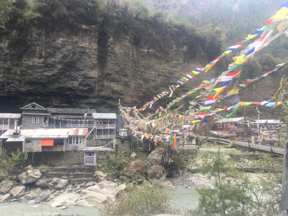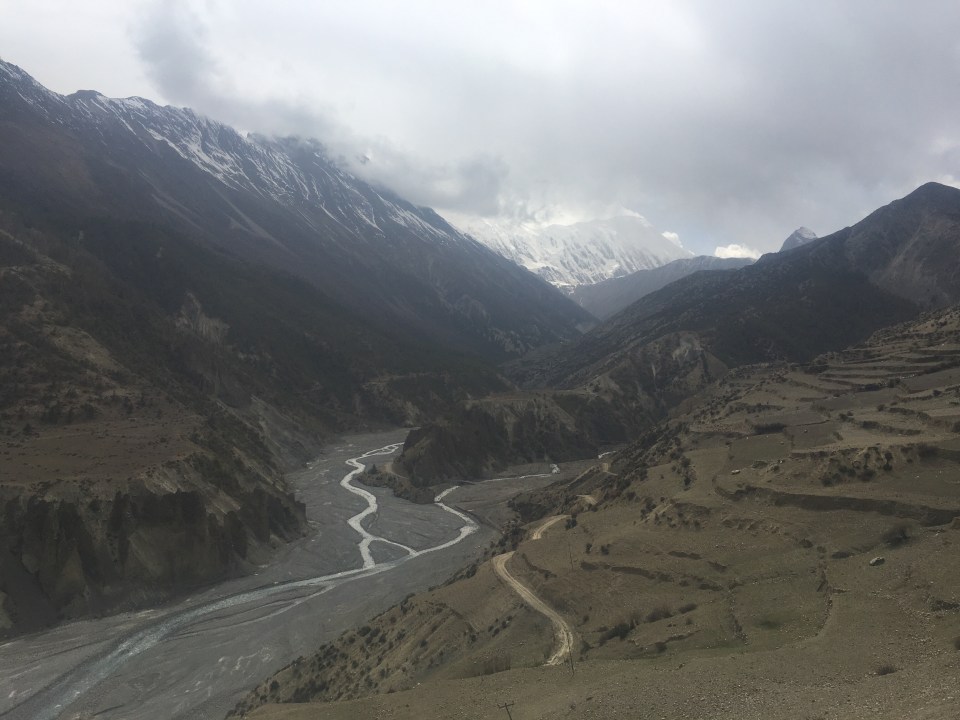 Eventually we rejoined a road and had to stop at a police checkpoint, and for whatever reason QB’s permit has her listed as Algerian but the Nepal police didn’t question it. I wasn’t about to say anything, that would just slow us down. We got lunch at a really good spot in a tiny village called Manchi then made our way to the big city in the area; Manang.