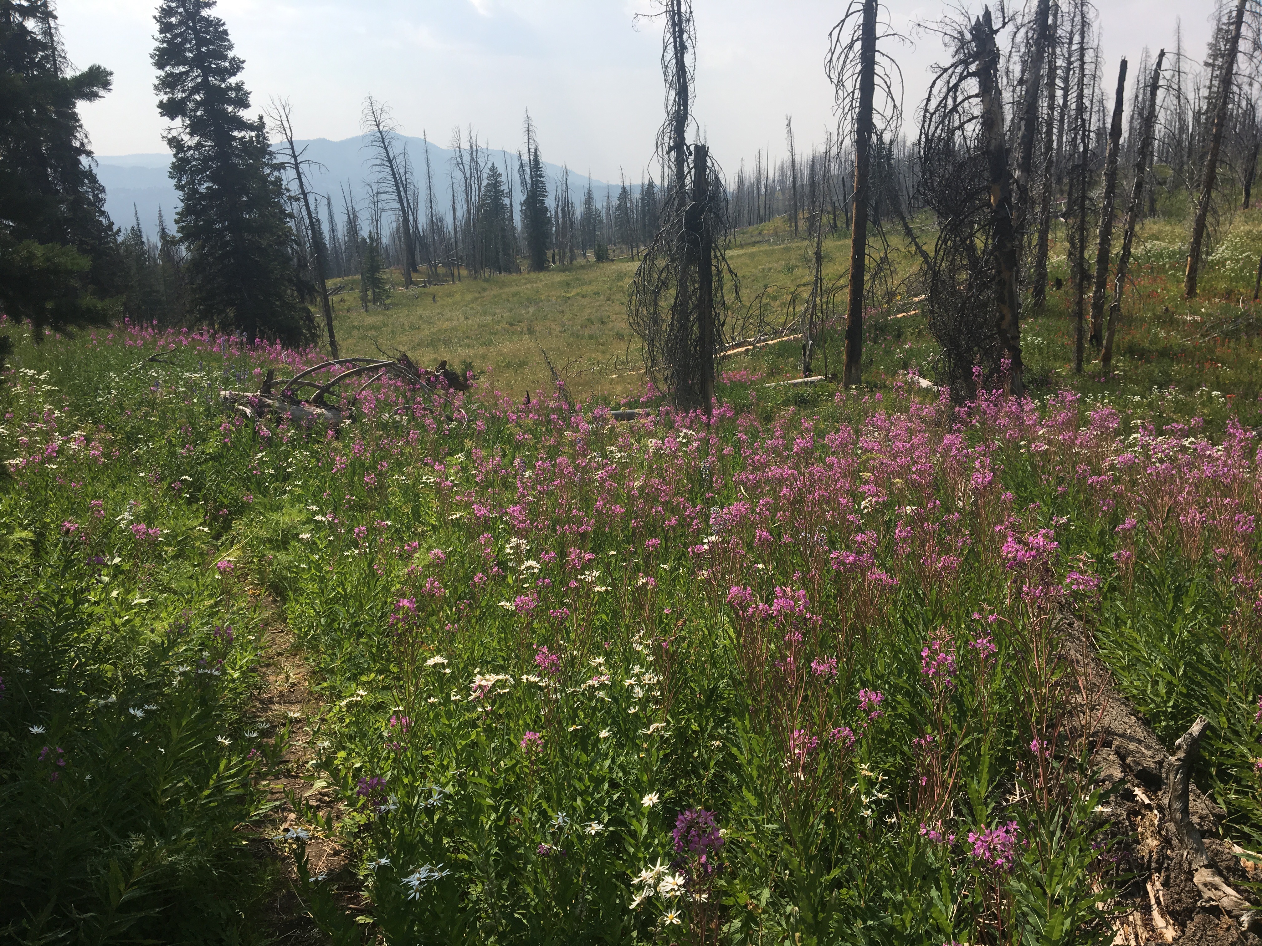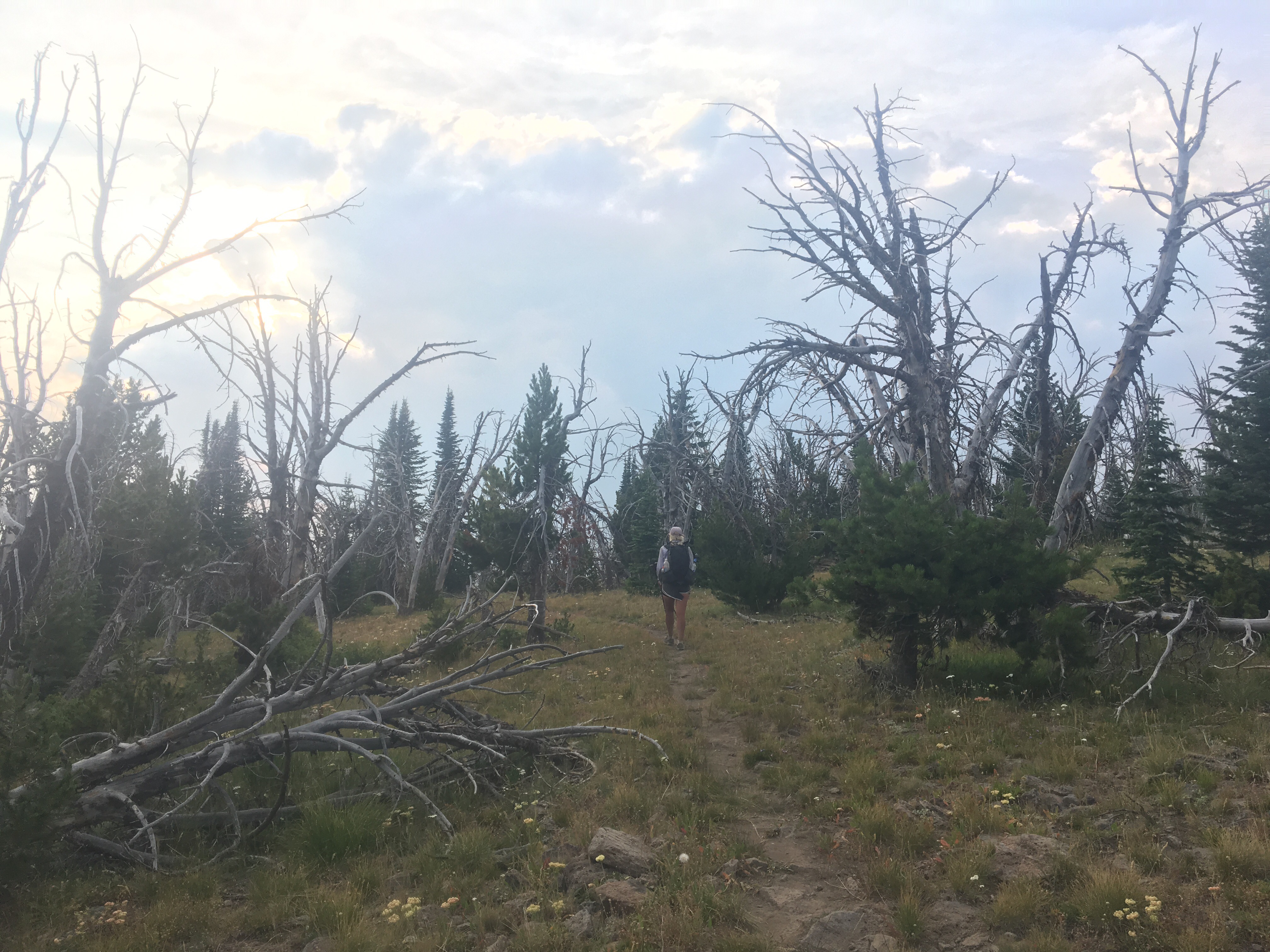 This morning we got up and started cruising right into town. We crossed rt 2 and some railroad tracks and got into Glacier NP but since our permits don’t start until tomorrow night we’ll be walking back into East Glacier Village and spending the night there. From Marias Pass the trail kind of parallels the road and the tracks all the way to town. There wasn’t anything too spectacular to see from trail, or maybe there was, it was just too smoky to see much of anything. About a mile from town I saw and heard a small dark brown bear crashing through the woods 15-20 feet to my right. It scared the bejesuses out of me but I recovered quickly. Once again QB didn’t see it but she did hear it. Current bear score 12-2 in my favor. We got to town and ate a couple times at the Two Medicine Grill, which I recommend. I did laundry and showered for the first time in a week and got a room half off at the Circle R motel because it didn’t have a TV. Fine with me, I feel like hotel TV’s only play Forensic Files anyway.