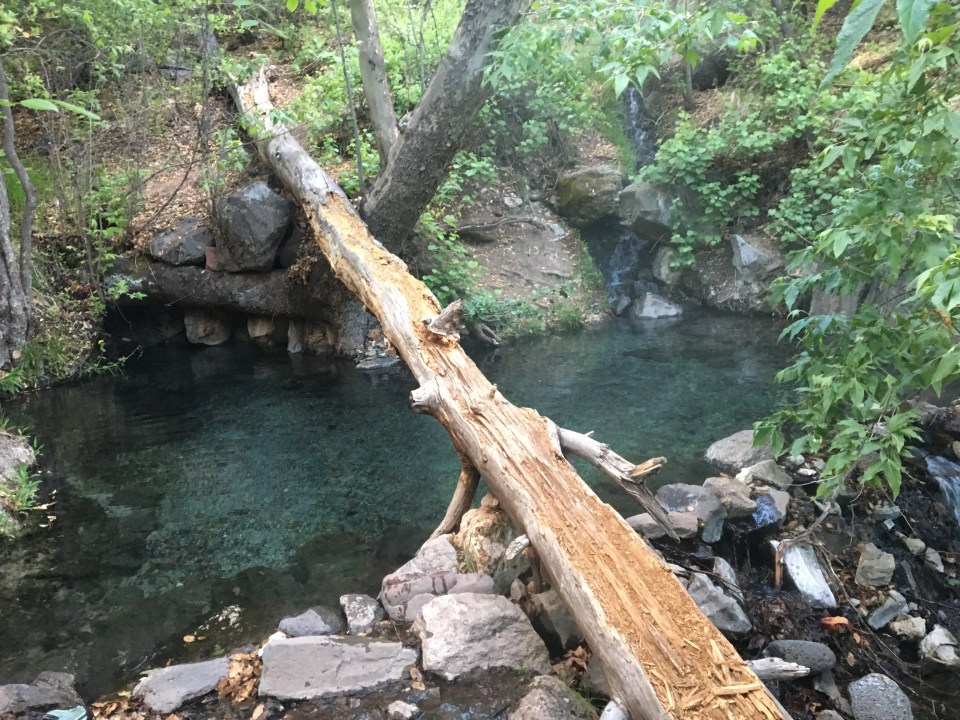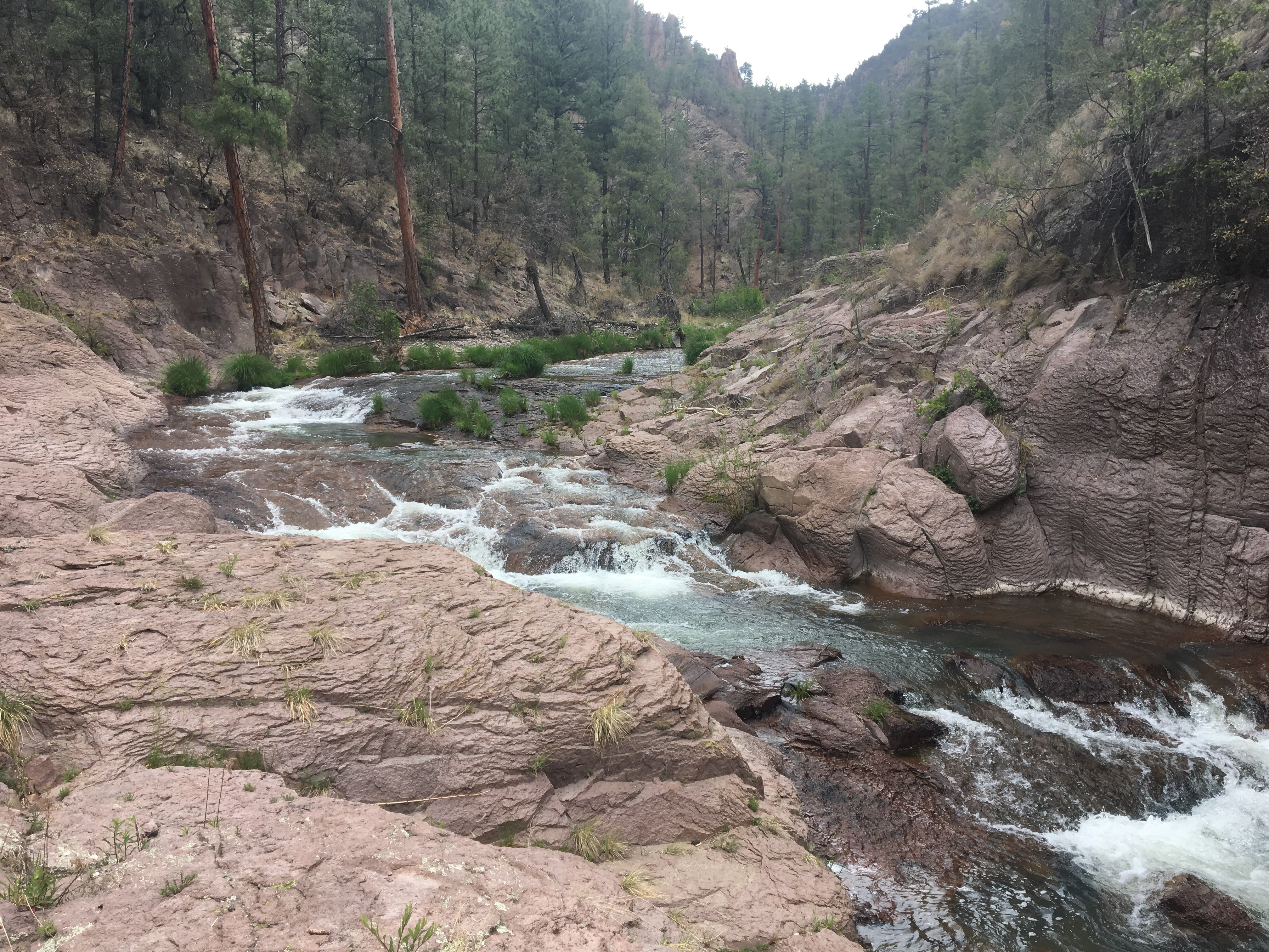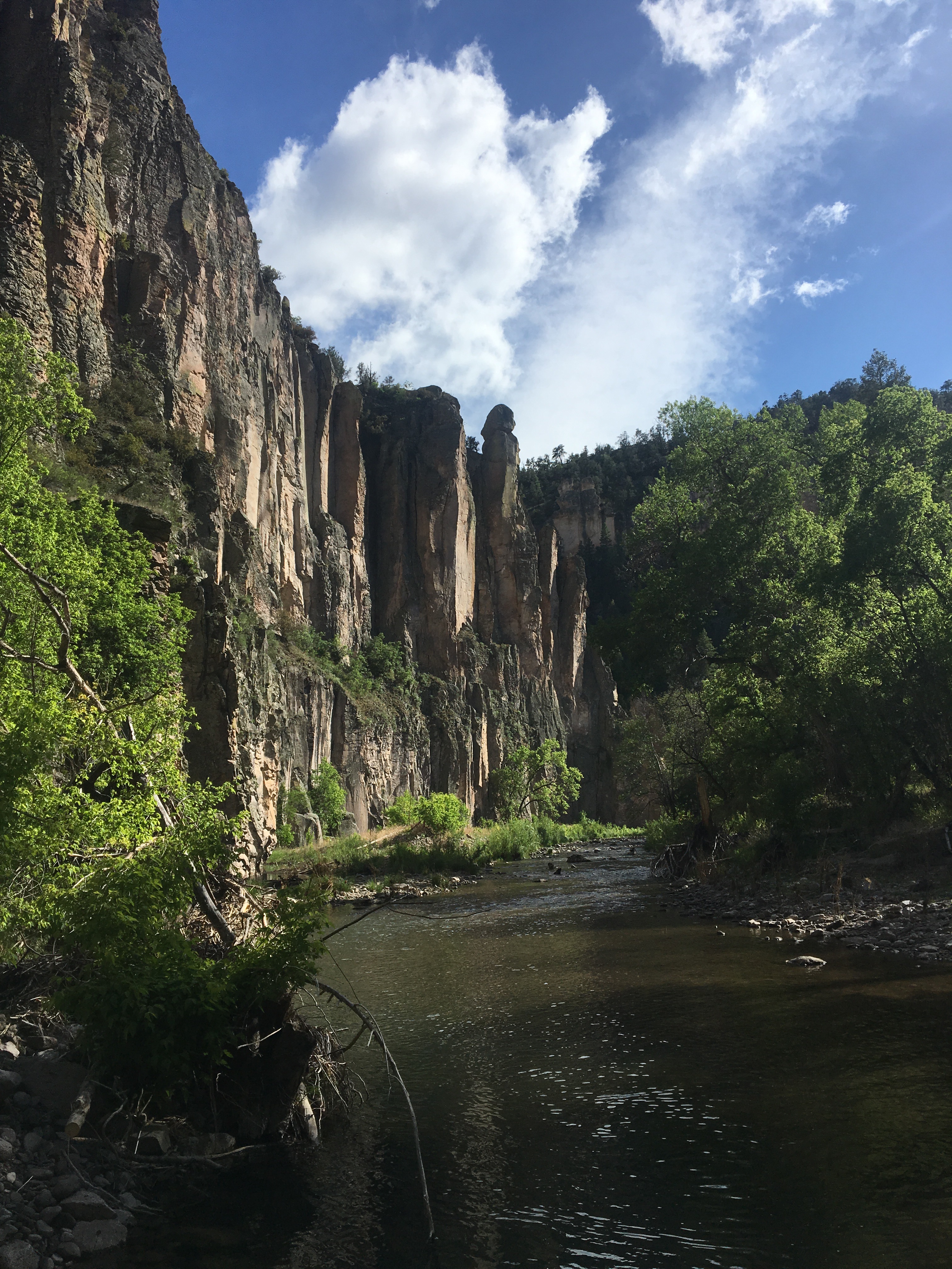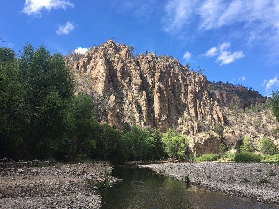 Tuesday I had no reason to jump out of bed too early because I was picking up a resupply box at Doc Campbell’s outpost and it didn’t open until 10. We did a few miles of river crossings in the morning before the trail reaches a bridge. That road skirts along the canyon for awhile and eventually to Doc’s store. A nice little pit stop. I ate some food, did a little maintenance and picked up a box of junk food I mailed myself a couple weeks earlier. We carried on with every intention of checking out the Gila Cliff Dwellings but the sky threatened T-storms and since it was 5 miles of road walking out of the way, and not guaranteed to be letting people in because of the potential for weather, we decided to skip it. The trail then drops back into a canyon containing the middle fork of the Gila. We found a hot spring right away with super hot water and laid in it for awhile looking up at the huge canyon walls. This day was awesome! The red, yellow and orange canyon walls were quite the sight. We continued to cross the river over and over while craning our necks to look at the walls and spires that were everywhere. The day ended with another stellar campsite just up a short path from yet another hot spring. This one a little cooler but cleaner and clearer and perfect for a good soak after a long day of walking. I swear hot springs are good for the soul. The Gila is an amazing place, borderline magical. It should be considered a national treasure. And there’s nobody here! 2 nights in a row we got a campsite with our own private hot spring, it’s unbelievable.