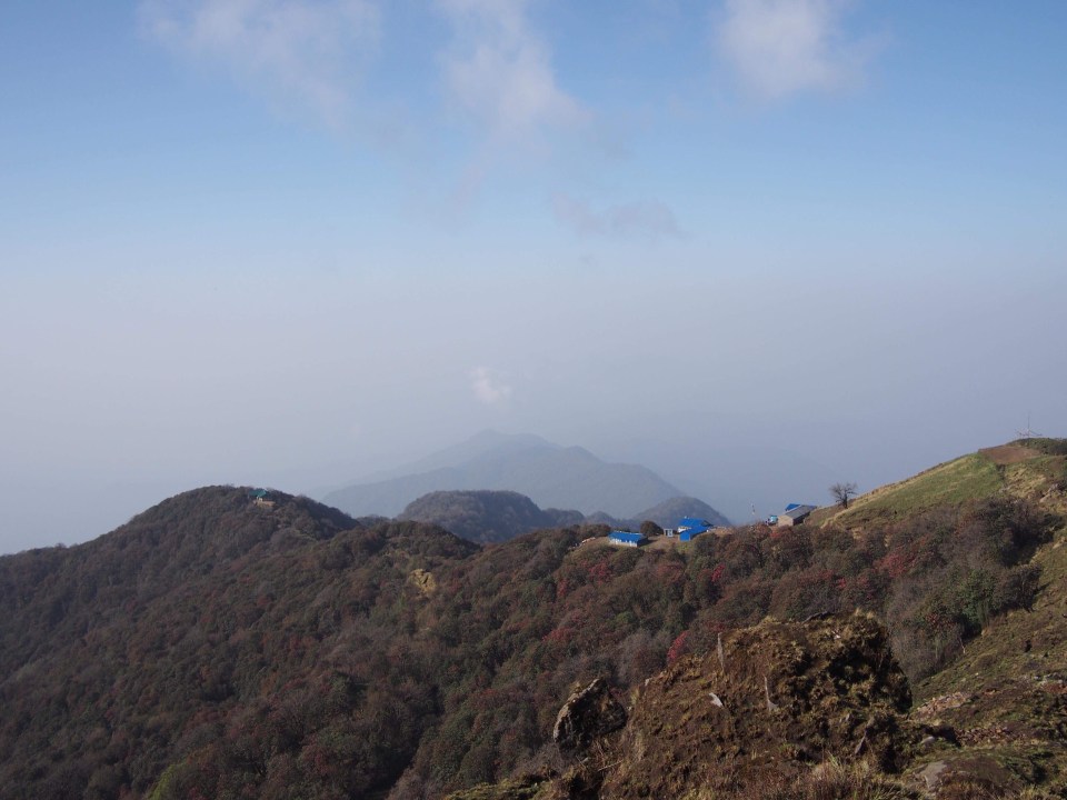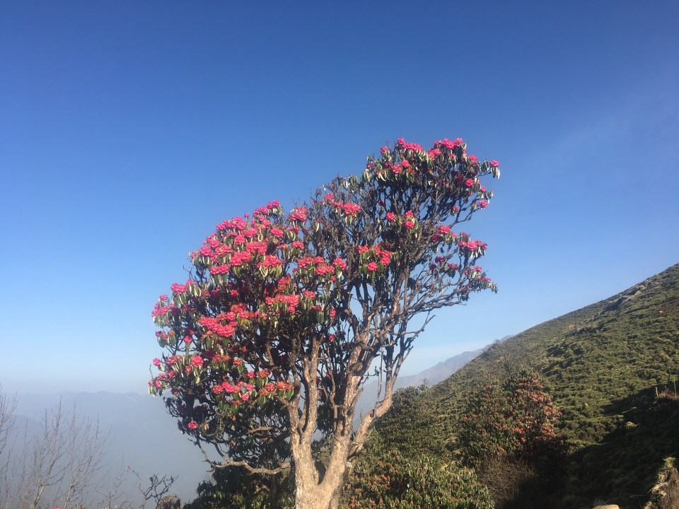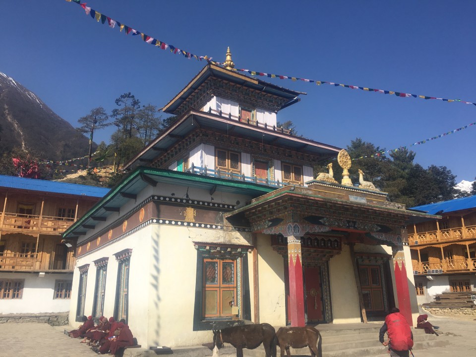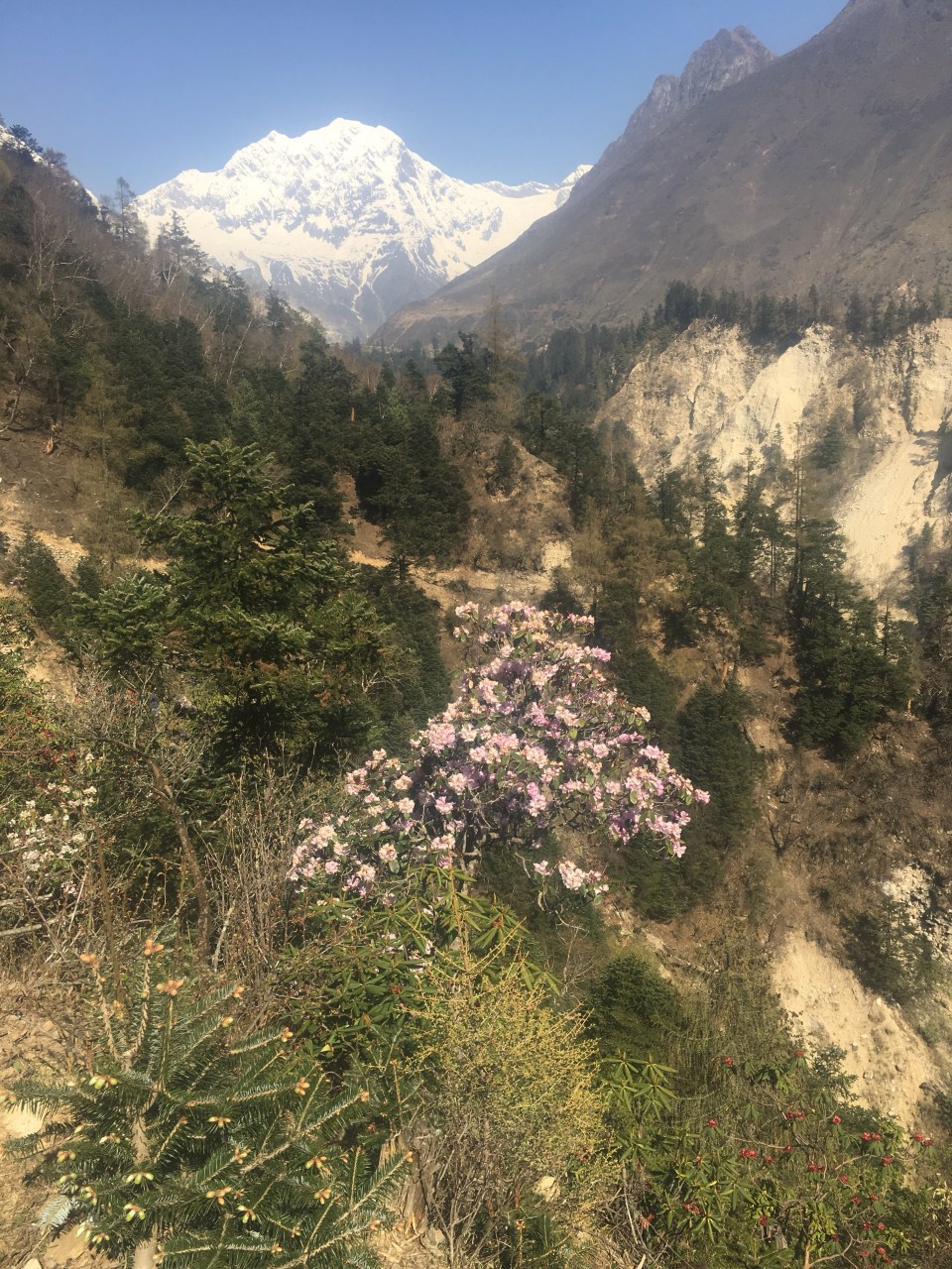After we ate breakfast we quickly climbed about 500 feet to Ribung Gompa and had ourselves a little look around. This monastery was bustling with monks, I think there was a school there and they were all sitting outside studying. From the monastery we walked through lots of pink and red blooming rhododendrons and then the trail climbed steeply through a forest until we got to the town of Shyla. Mountains in every direction.