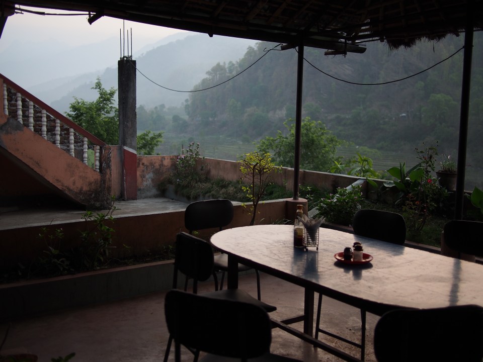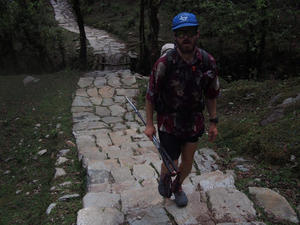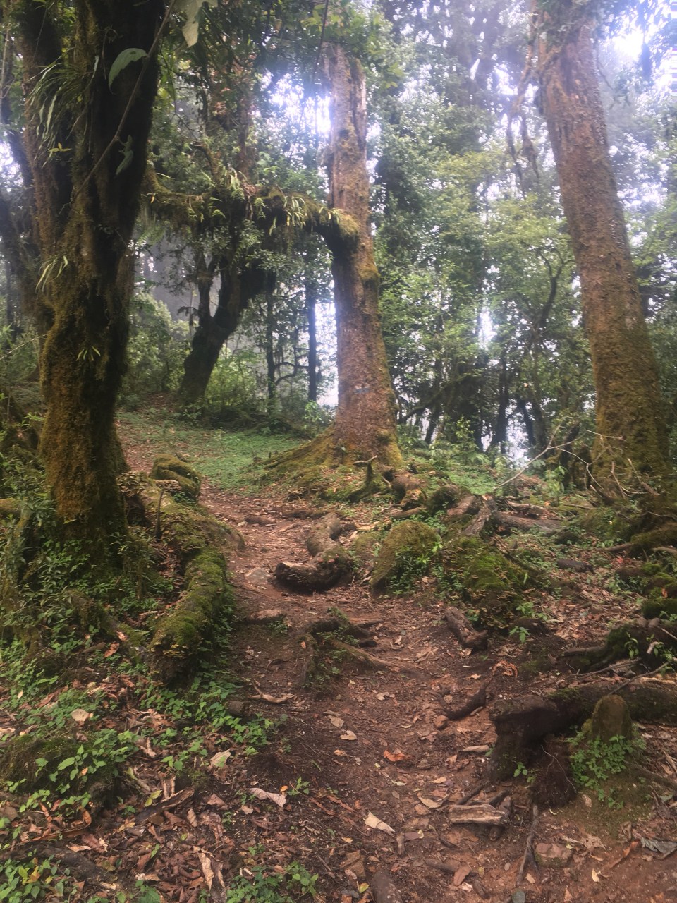 This morning we took a cab about a half hour from the Crystal Palace hotel in Pokhara to the village of Phedi where we started our trek. From Phedi to Dahmpus the trail was a stone staircase the whole way. It took us up almost 2000 feet in elevation over the course of an hour. Stairs are fun, I’d climb stairs all day if I could(QB said she’ll count the stairs on the way back, we’ll see). Oh it was hot out too and wicked humid, I was quickly drenched with sweat. Once up in Dahmpus the temperature cooled a little bit but we were basically walking inside a cloud the whole day. An hour or so later we got to the village of Pothana where they had a checkpost to check our permits. We thought our Annapurna permits were still good but the fine print said they were ‘single entry only’ and since we had left the Annapurna region and then came back they were no longer valid. Because of this little guffaw on our part, we had to pay double the entry fee for new permits at the checkpost: 4500 rupees each, womp womp womp…Not the end of the world but had we noticed this yesterday we could have easily taken care of it in Pokhara for the regular permit price of 2250. From Pothana we walked steadily uphill through a rainforest or jungle the rest of the day. There wasn’t much for views of the mountains because of the cloud we were inside of but the fog gave a really cool look to the jungle. It was very green and there were lots of big moss covered trees. By the end of the day we got to Humal, aka Low Camp, ate a meal and crashed out for the night. Low Camp doesn’t really seem like a village but just a lodge catering to us and the few other trekkers here.