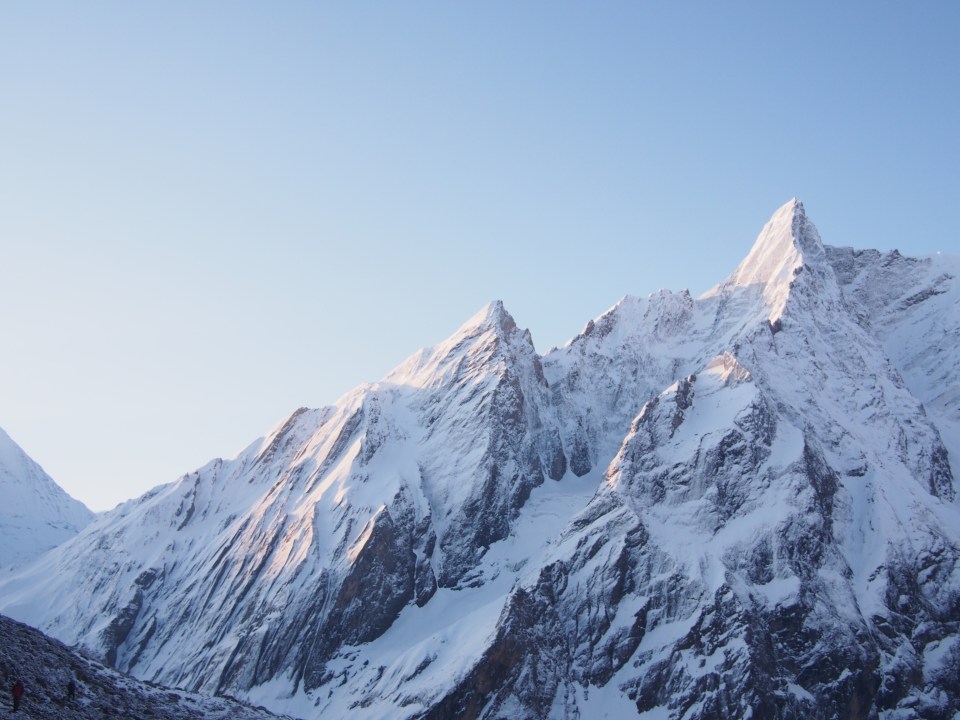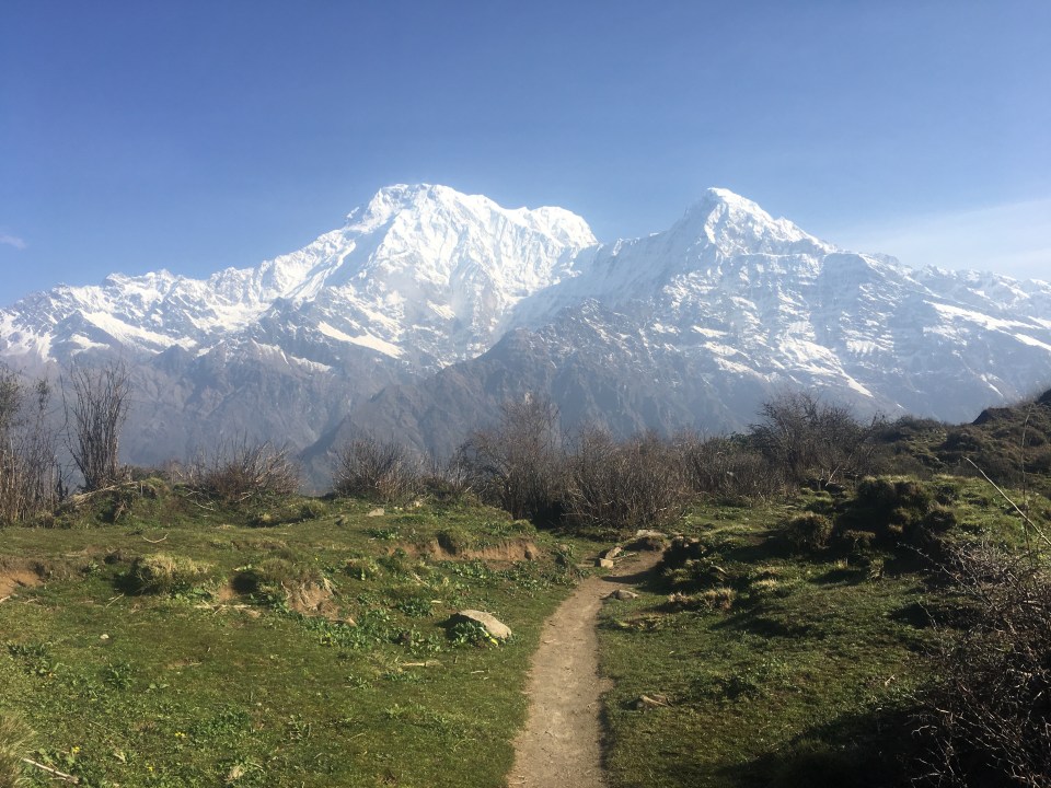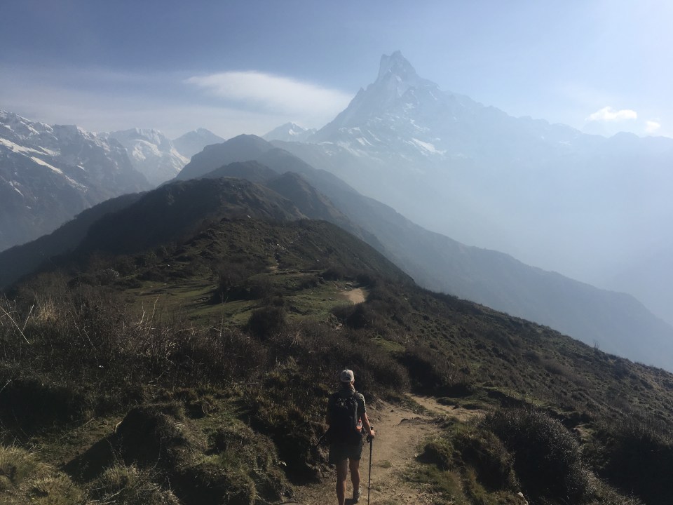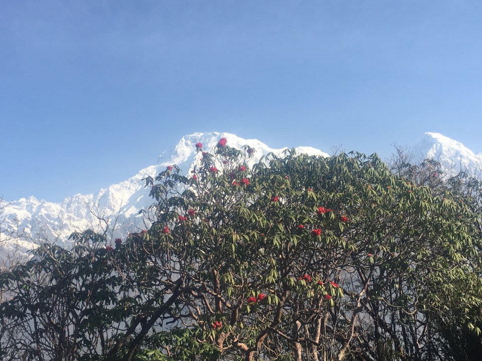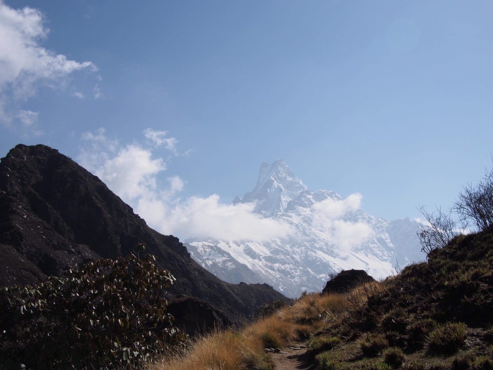 We got a good start this morning and around 6:30, right after we wolfed down our oatmeal, we were walking uphill. The first half hour we climbed steadily through a rhododendron maze from Low Camp to Middle Camp. Once up at Middle Camp we were on a ridge above tree line and had fantastic views. We could see Annapurna South, Imchuli Peak, and the never before climbed Machhapuchhre AKA Fishtail Peak. It was amazing. I also was lucky enough to see a pair of Nepal’s National Birds; the very colorful Himalayan Monal(I didn’t get a picture but google them, they were wicked cool). I can only describe them to her as mountain peacocks. We walked for another hour and a half until we got to High Camp at 11,800 feet, where we stopped for tea. From High Camp to Base Camp was supposed to be a 2+ hour walk but the clouds had really started to roll in. We walked for about 40 minutes and when the mountains were all socked in we decided to turn around. It was pointless to me to keep walking towards Base Camp without anymore views, but what we saw was awesome. I think the best way to do this hike would be to get to High Camp in the evening and camp there, then in the morning wake up early while it’s hopefully clear and go back and forth to Base Camp. Or you could just do what we did, that was fun too.