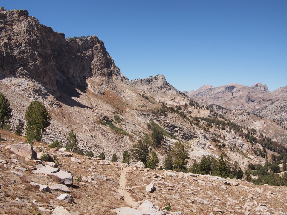 We should have left the tent set up and maybe left our sleeping bags in it. Just didn’t think it through and didn’t realize we’d be camping in the same spot again. This morning we zigzagged up above Overland Lake to a smaller tarn and then zigzagged some more to a steep pass which we think is Overland Lake Pass. From here we switchbacked way down a couple thousand feet and suddenly were in cow country. We crossed a couple different forks of Smith Creek where water was flowing then kind of went up and down while contouring on the side of mountains. When we reached the edge of the wilderness and beginning of the double track we figured we really don’t need to out and back 6 miles of atv trail. We turned and doubled back to our spot by the lake. Some say that every trail is actually 2 trails, a trail in each direction. You could say that.